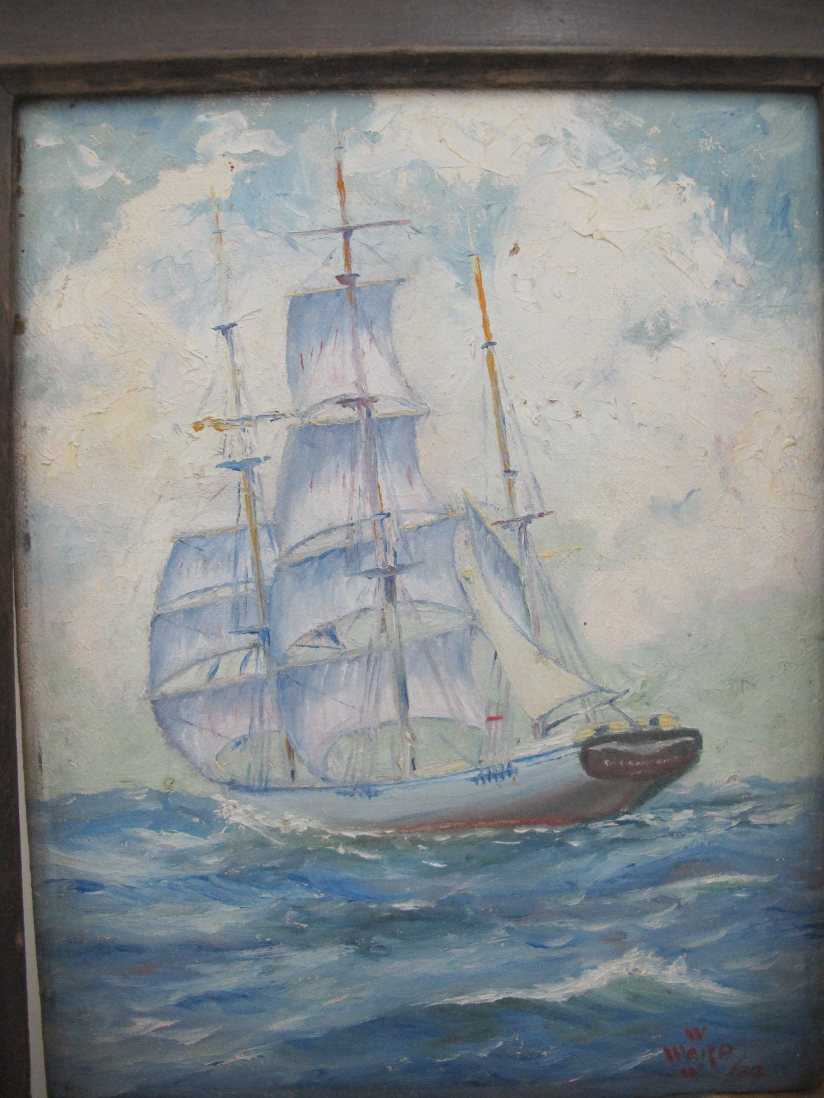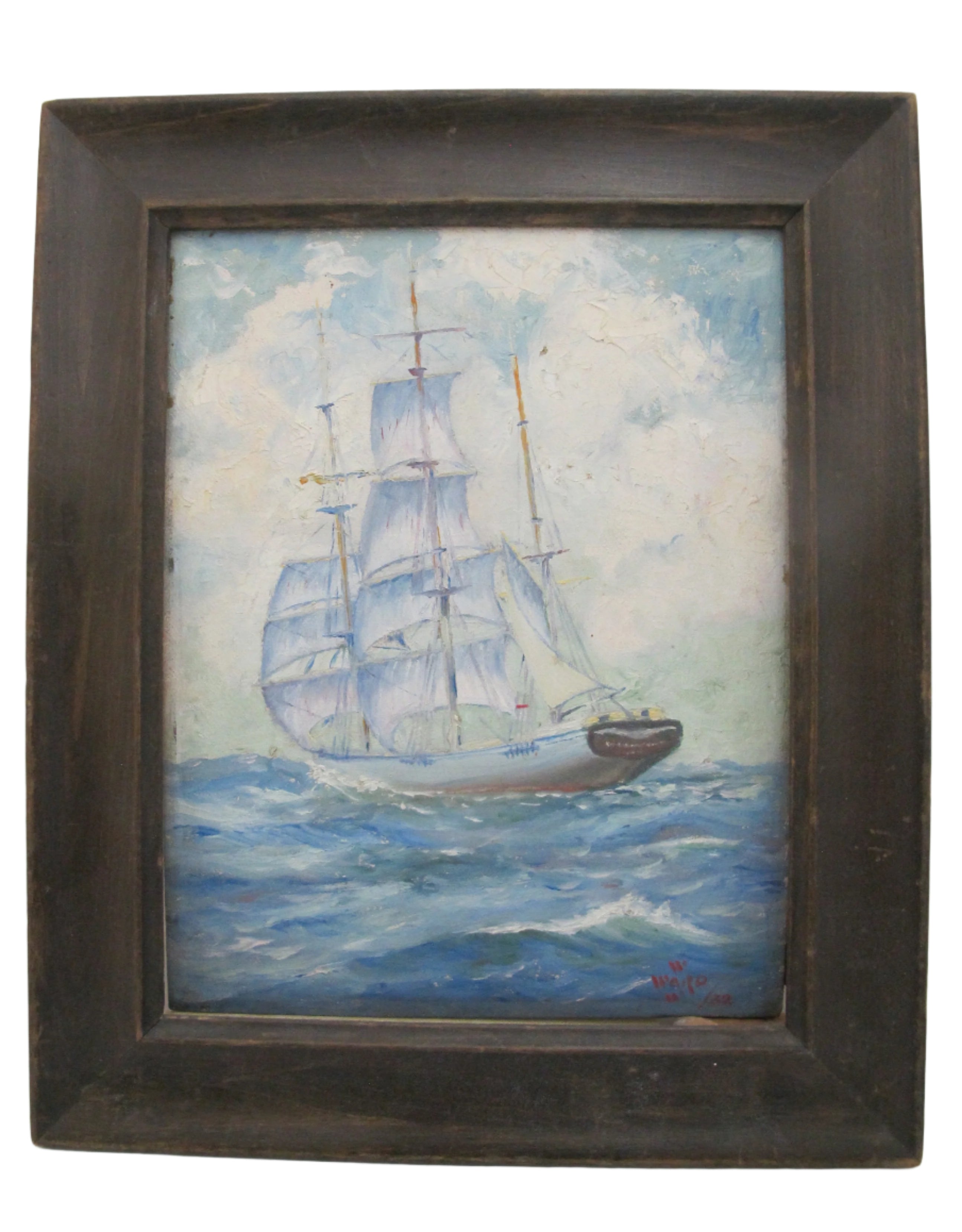 Super sweet little vintage painting showing a clipper ship out to sea. Signed at lower right, possibly 'Ward', dated 1932. Wood frame measures 11 1/2" x 9 1/2", painting measures 7" x 9". Excellent condition, painting is loose from frame.