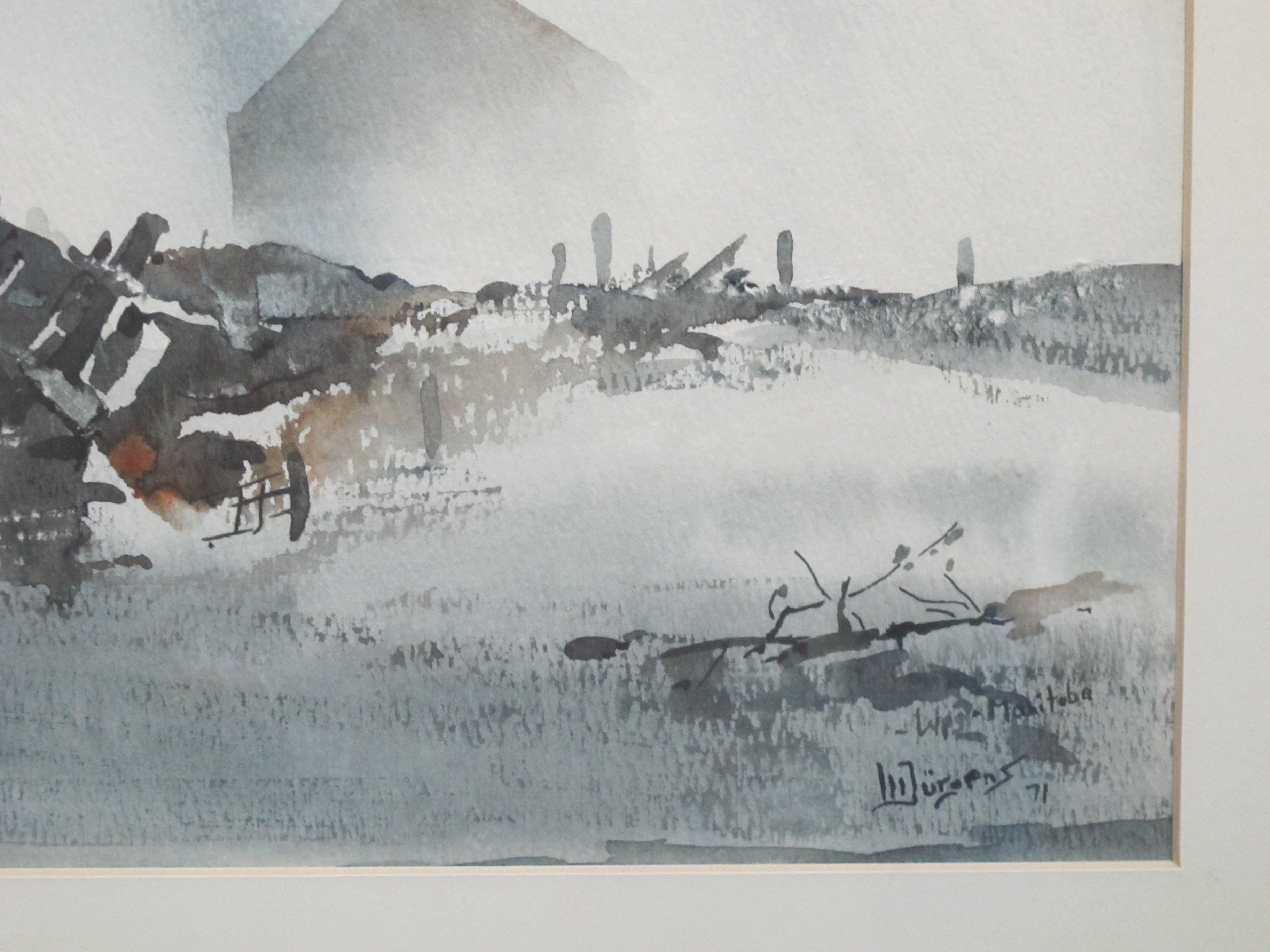 Werner Jurgens (German-Canadian/1936 - 2018) framed watercolor painting showing a dark and stormy Manitoba coastal landscape. Signed and dated 1971 at lower right. Also titled at lower right "Manitoba"
