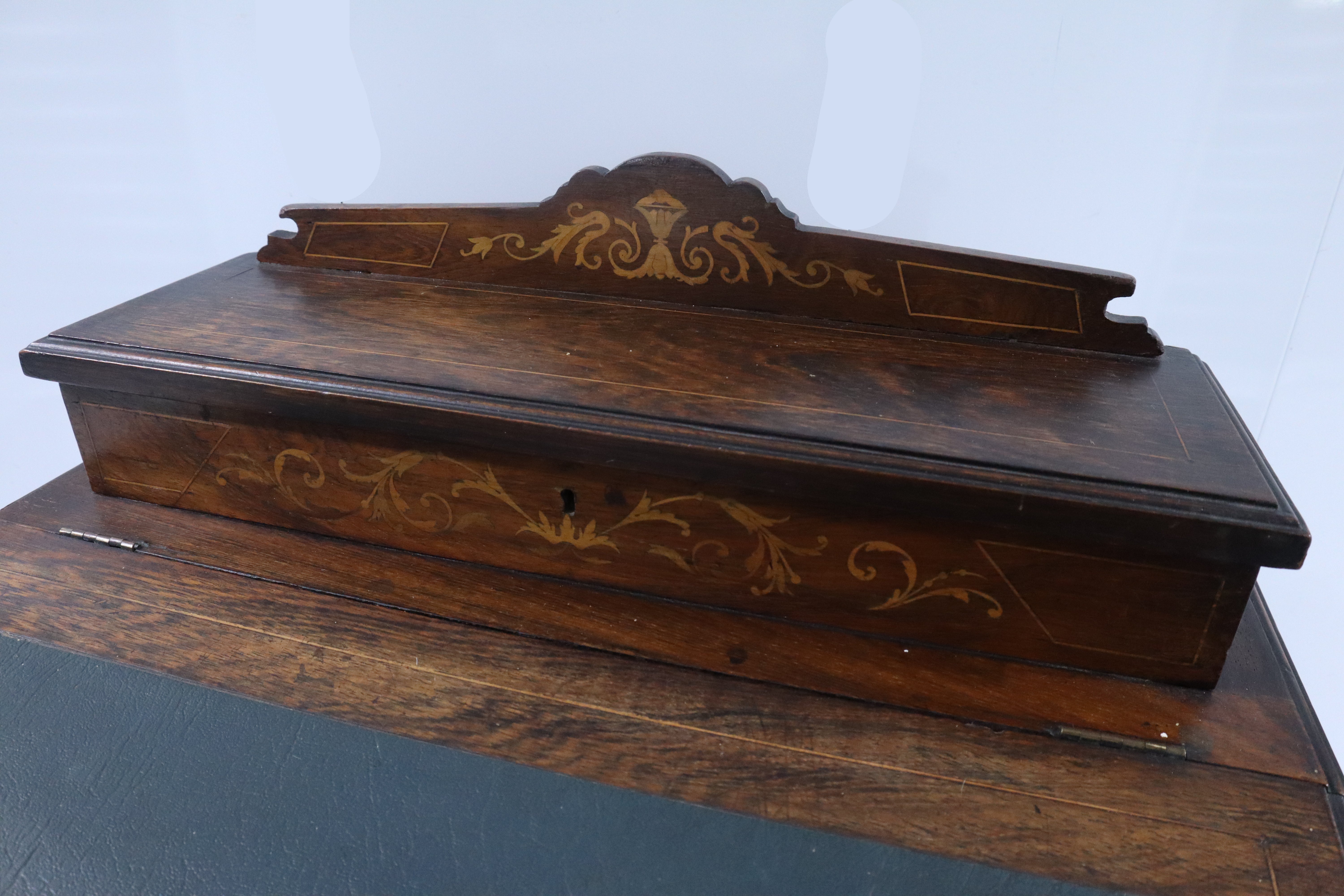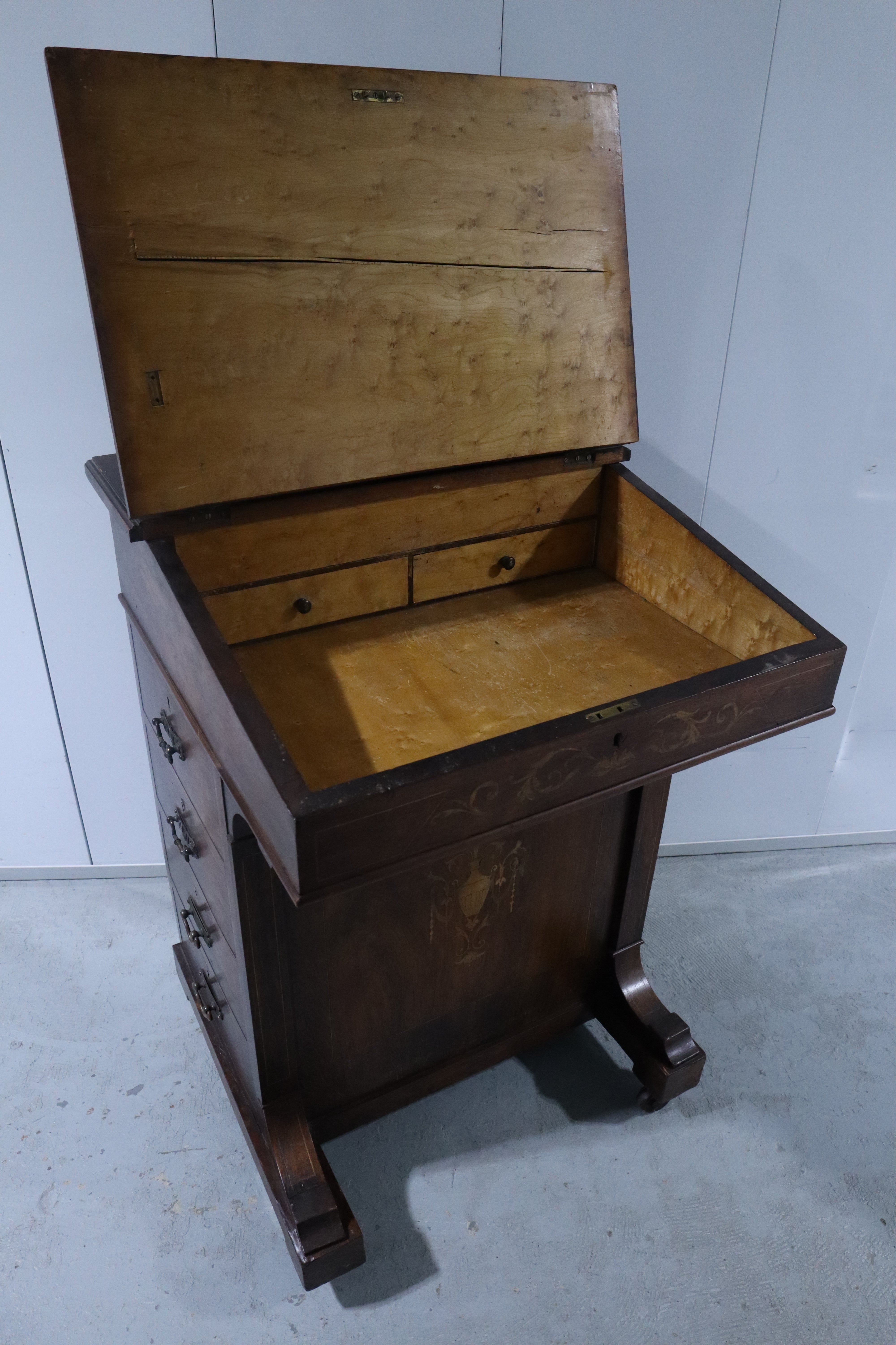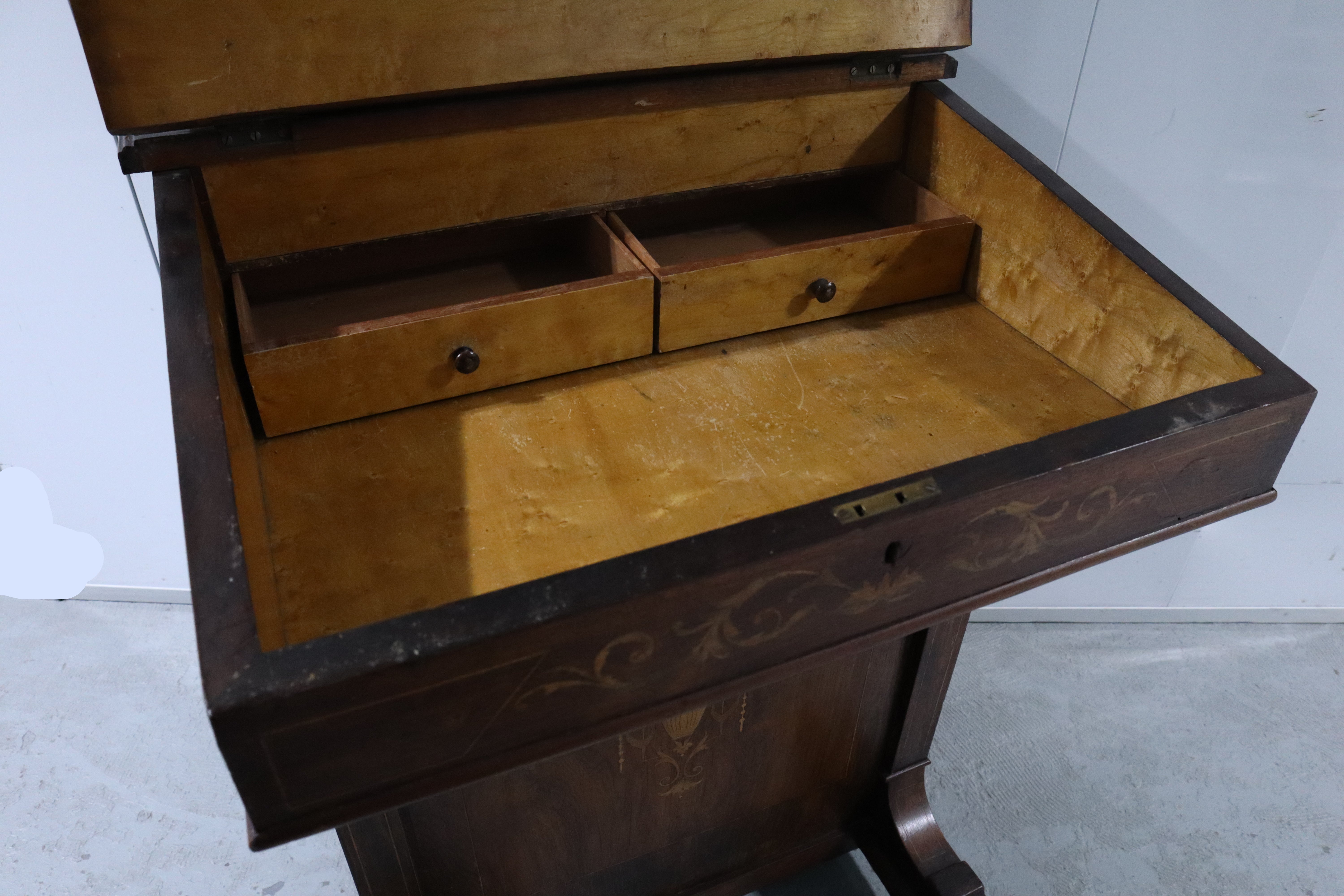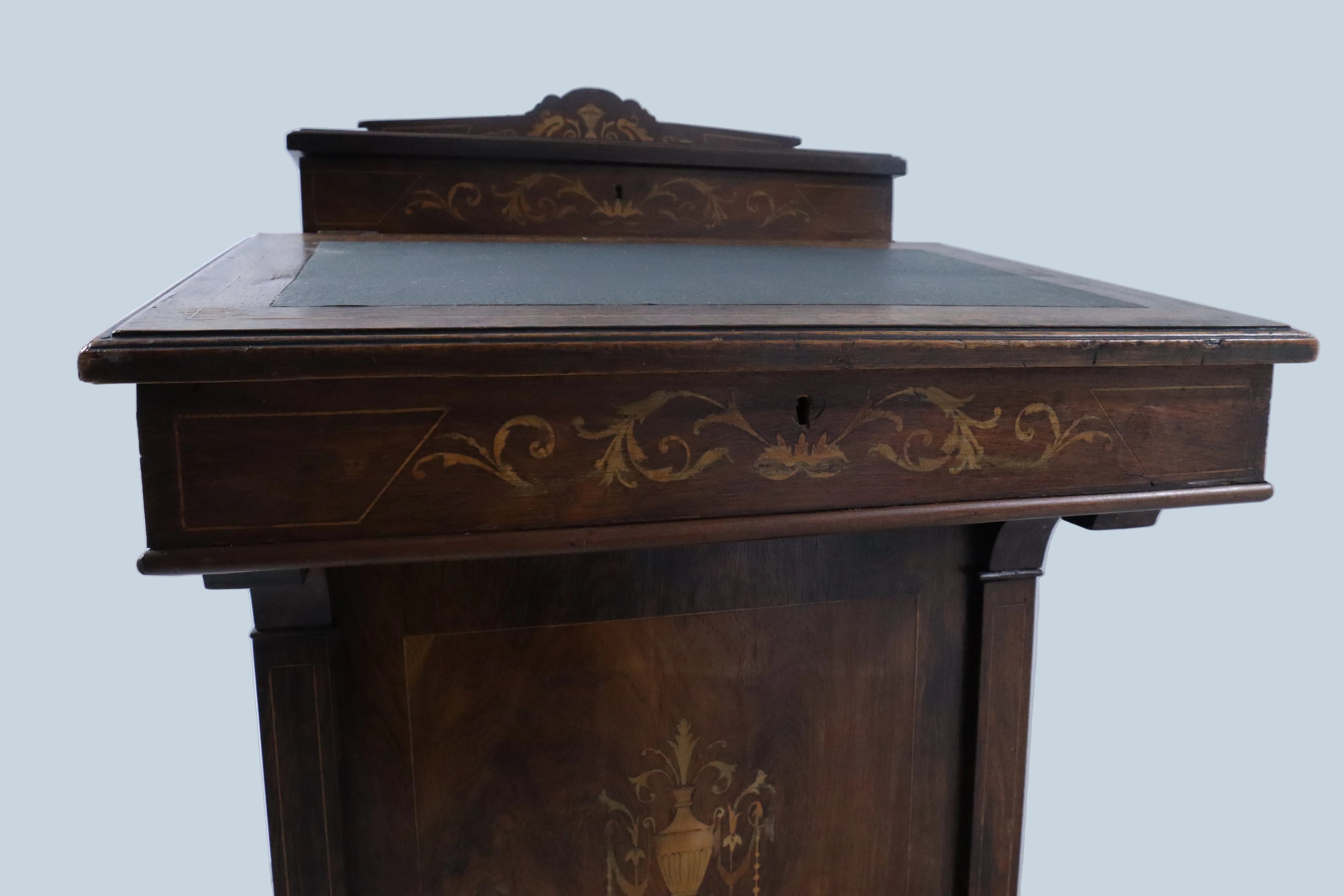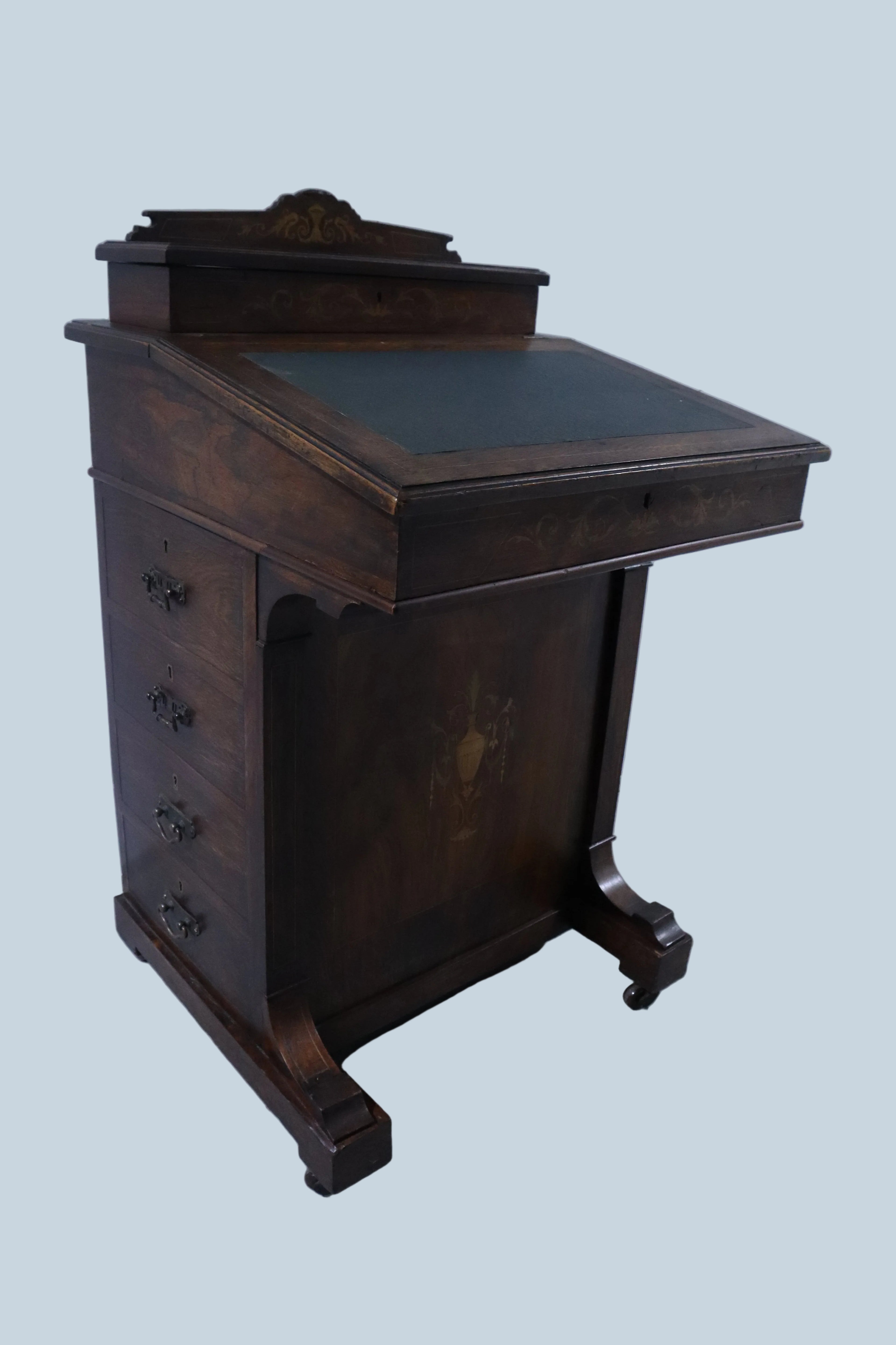 Beautiful antique late Victorian era rosewood davenport desk with marquetry on the front panel and down both sides. The top desk panel, which has a black leather writing pad inserted onto the surface, flips open to reveal a light wood compartment with two small drawers under the back hinges. At the top of the desk there is a pen rest that also flips open to a variety of small organizational sections for cards, envelopes, etc.
