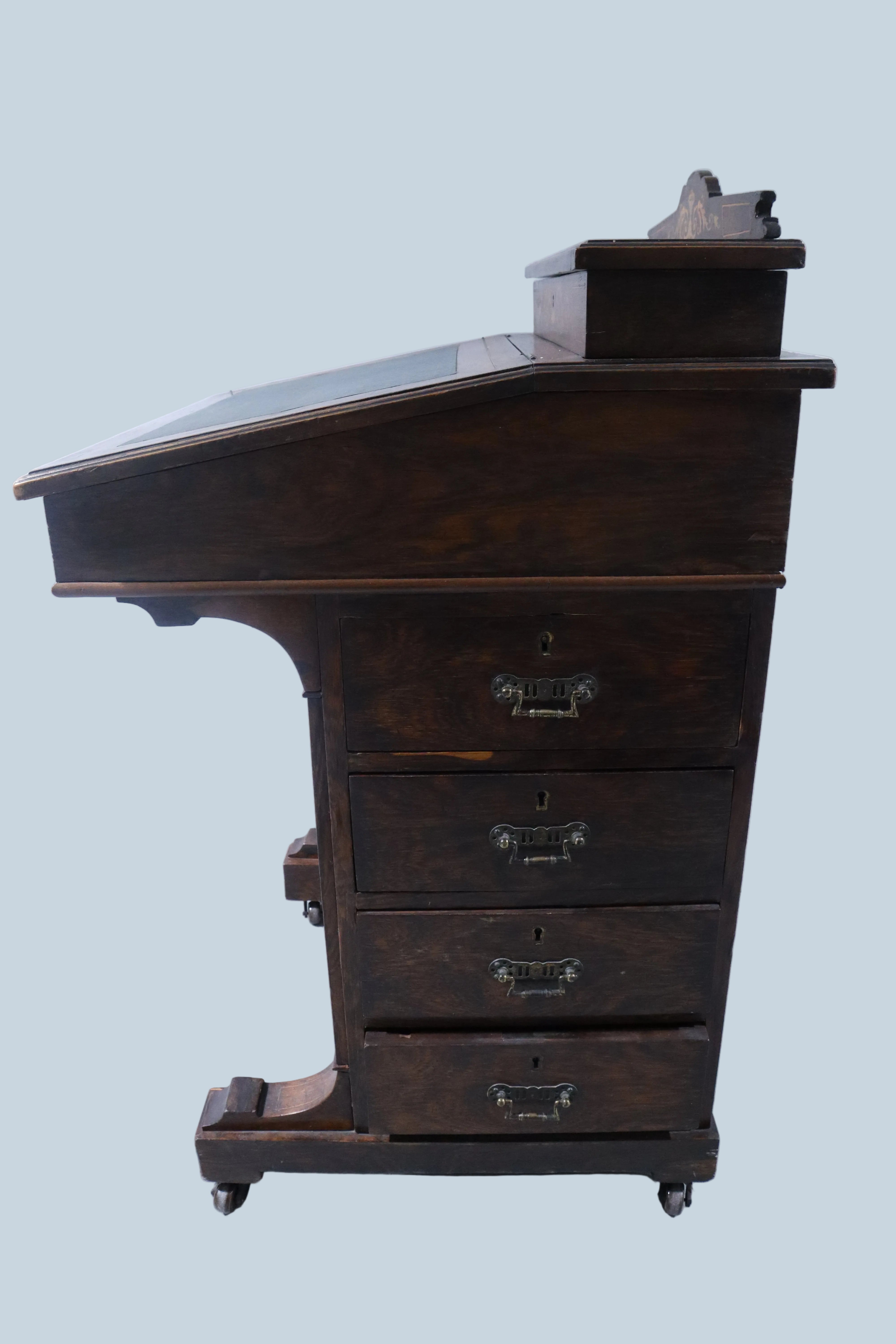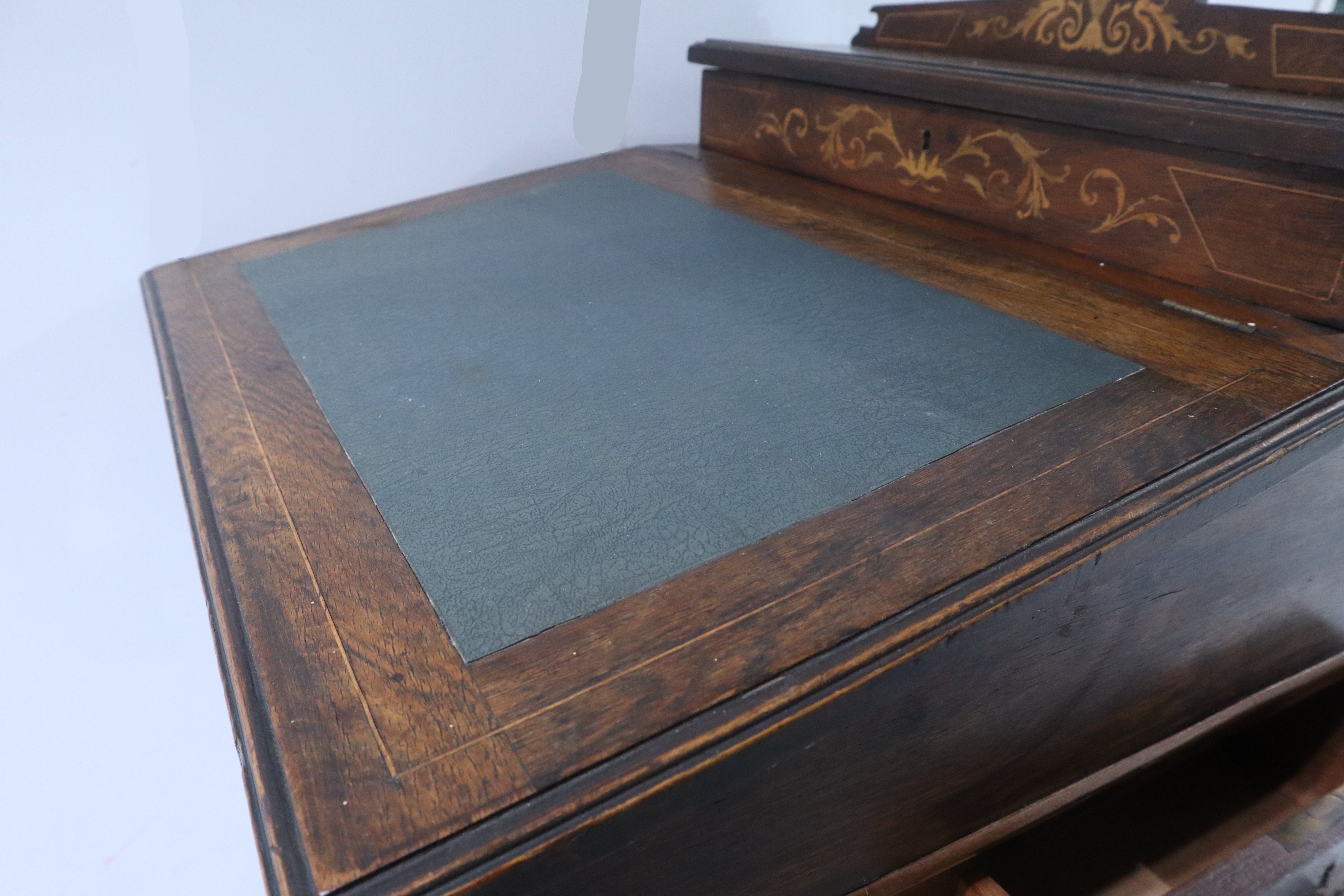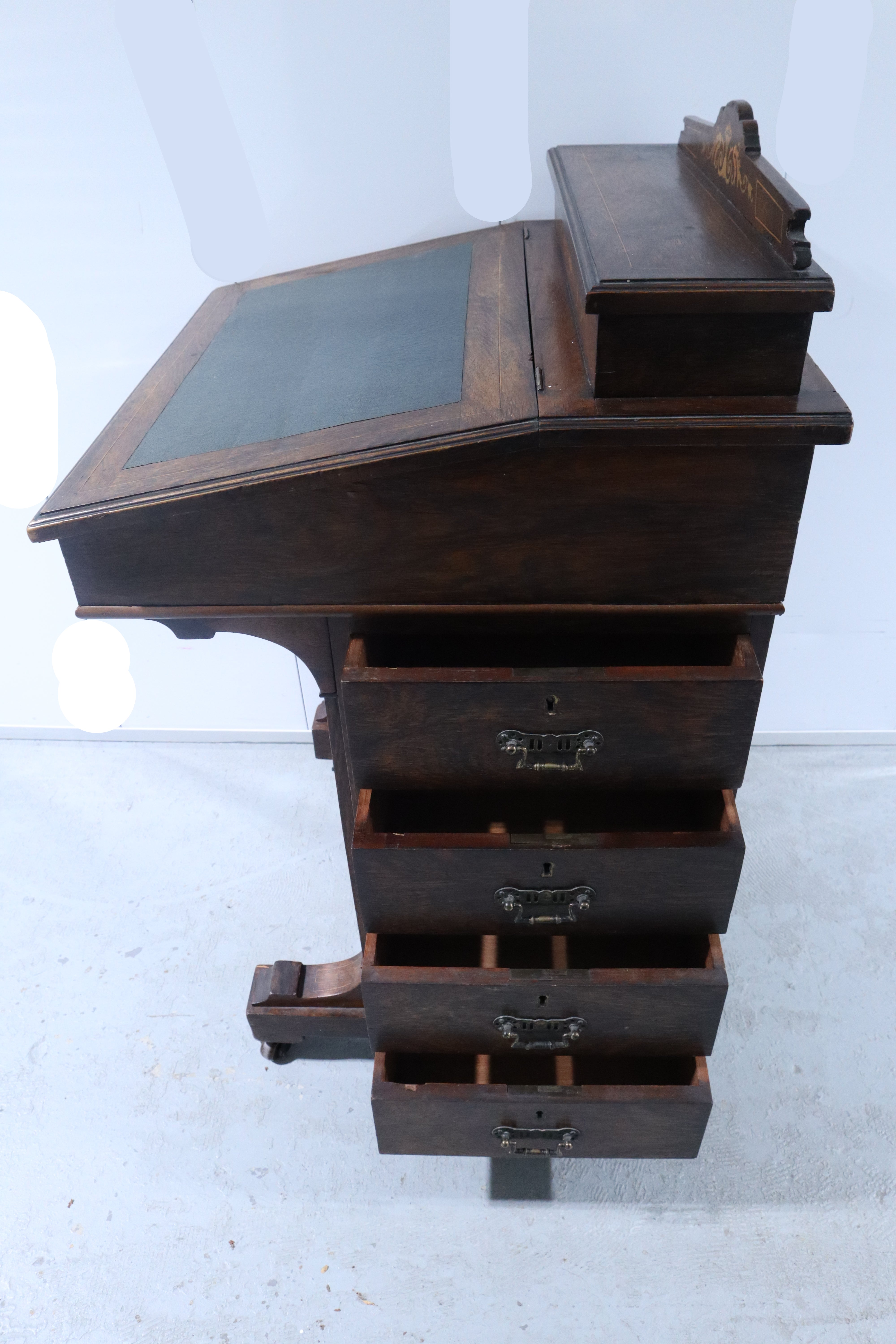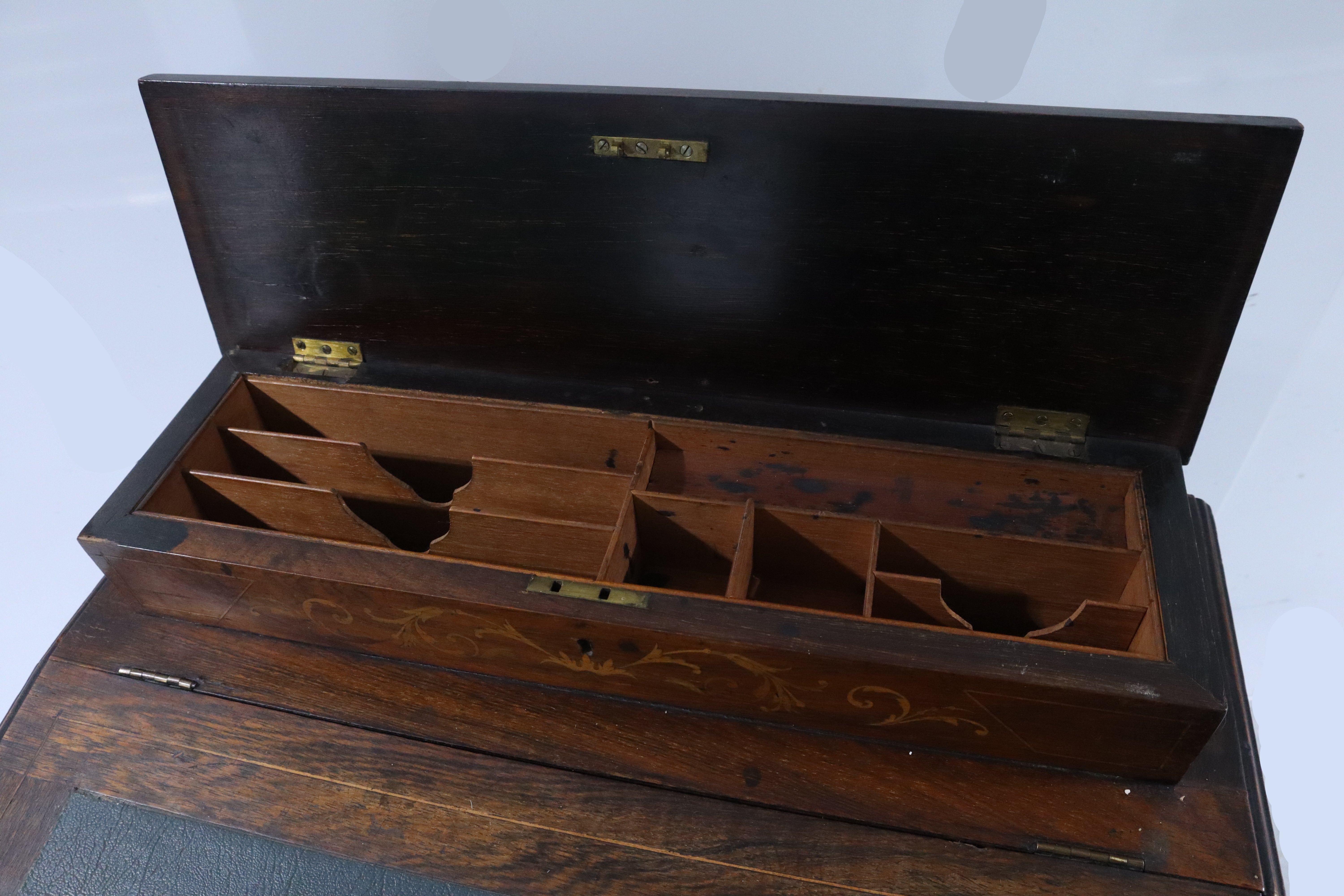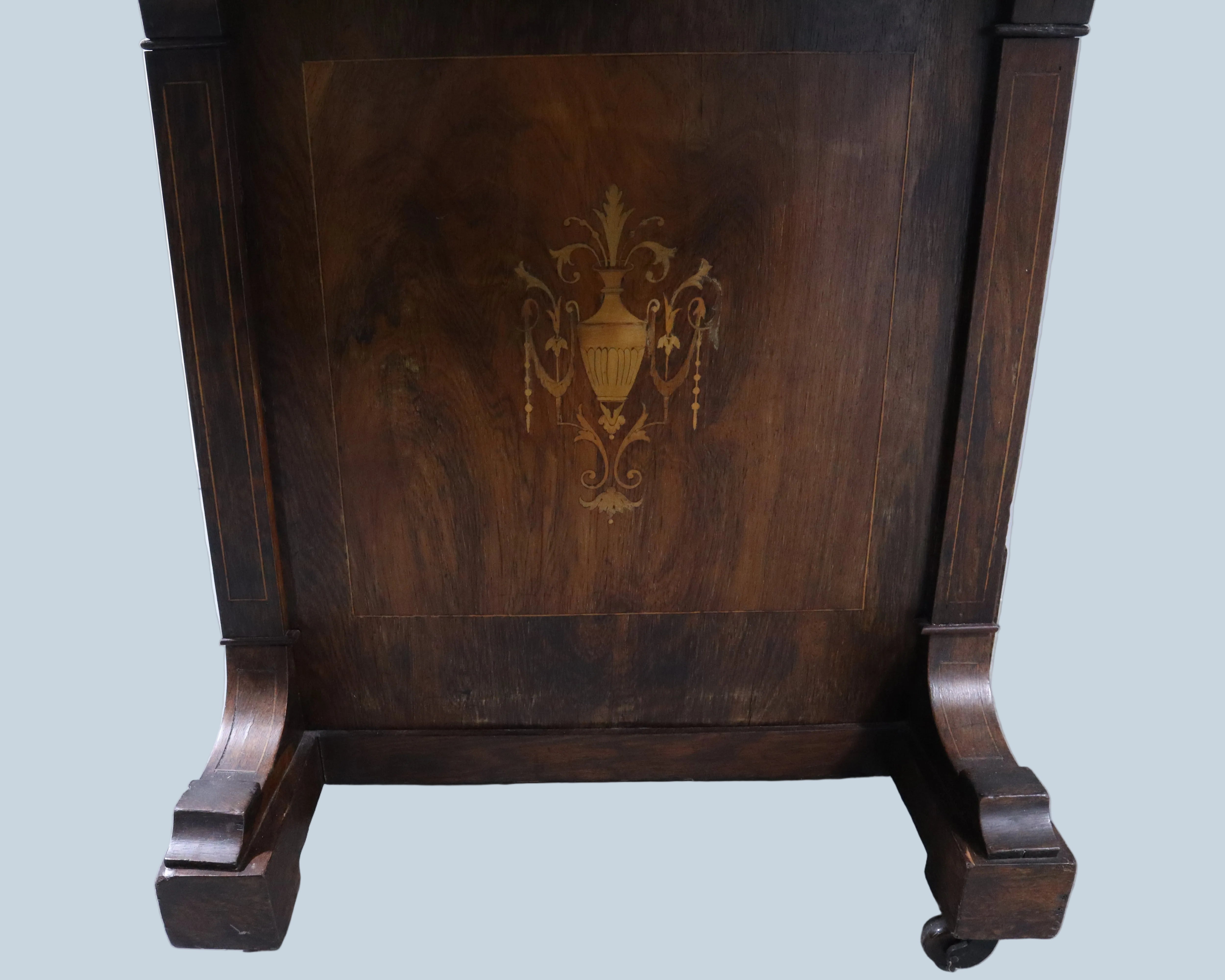 Beautiful antique late Victorian era rosewood davenport desk with marquetry on the front panel and down both sides. The top desk panel, which has a black leather writing pad inserted onto the surface, flips open to reveal a light wood compartment with two small drawers under the back hinges. At the top of the desk there is a pen rest that also flips open to a variety of small organizational sections for cards, envelopes, etc.