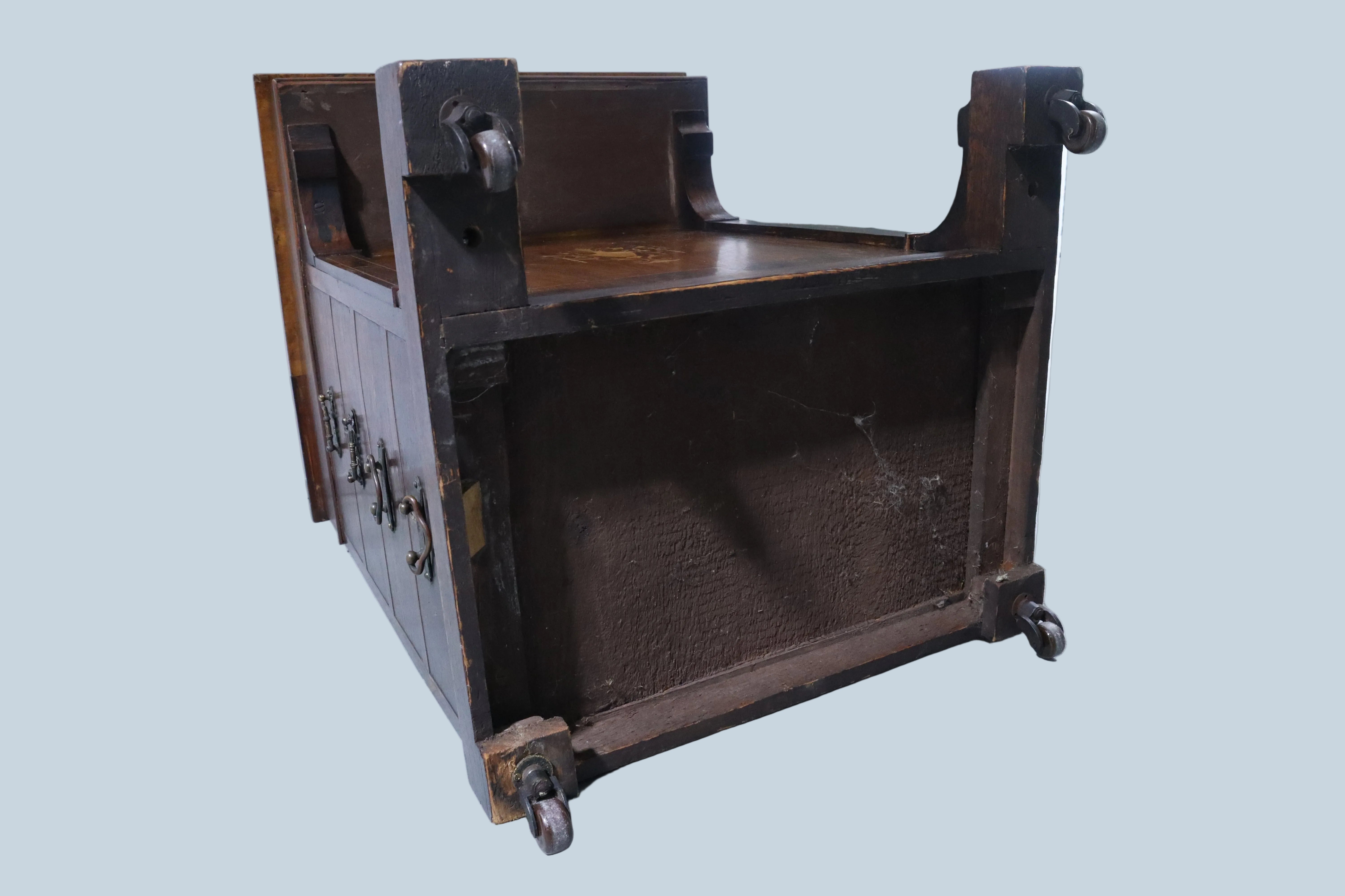 Good condition, wear consistent with age. Small gouge in leather writing pad on top. Scratches near legs and high use areas. Key is not included.