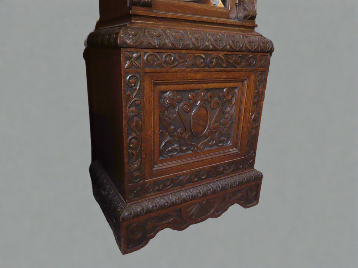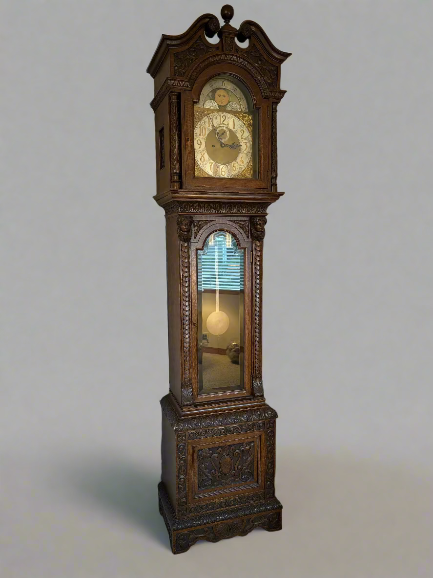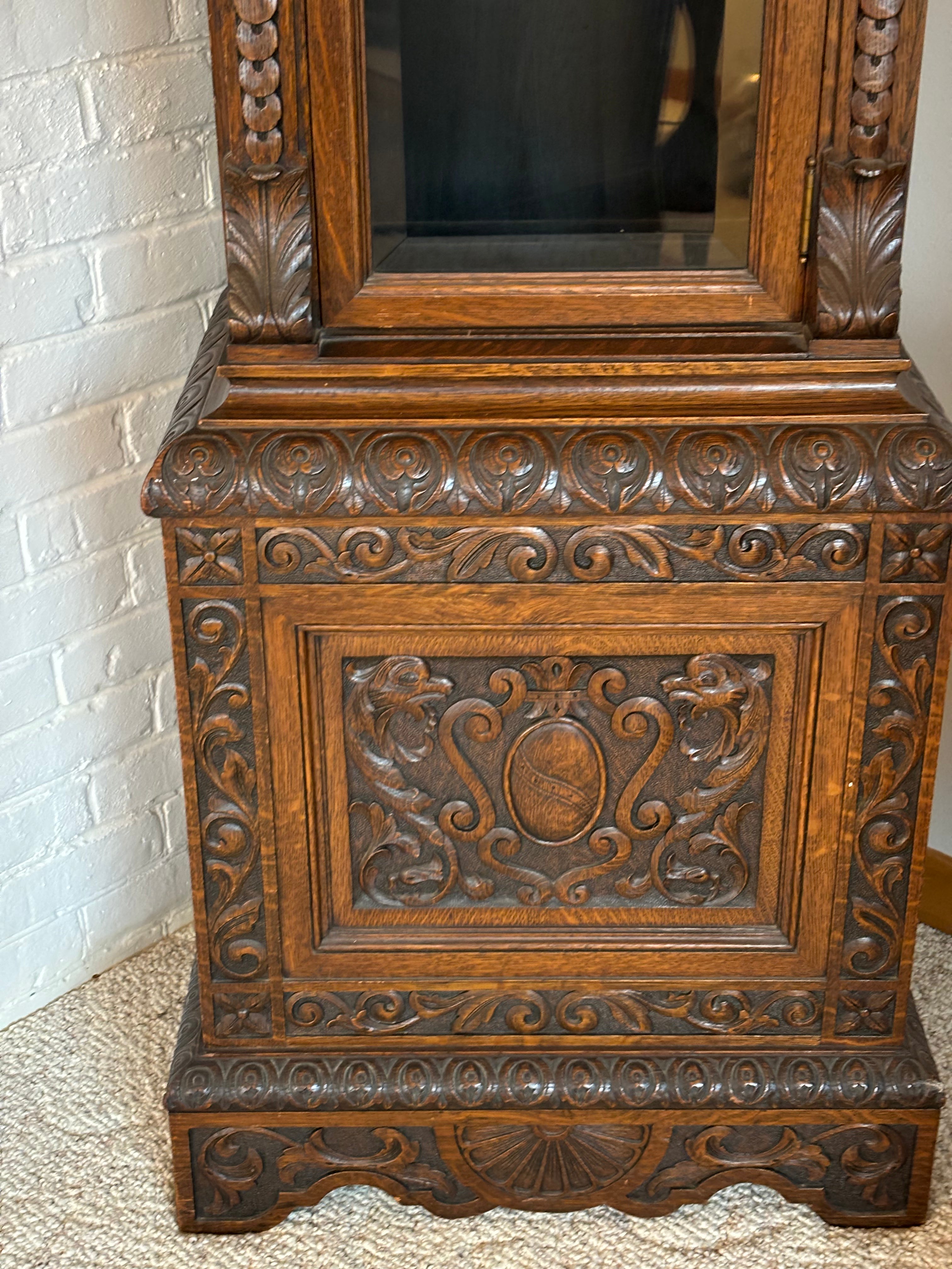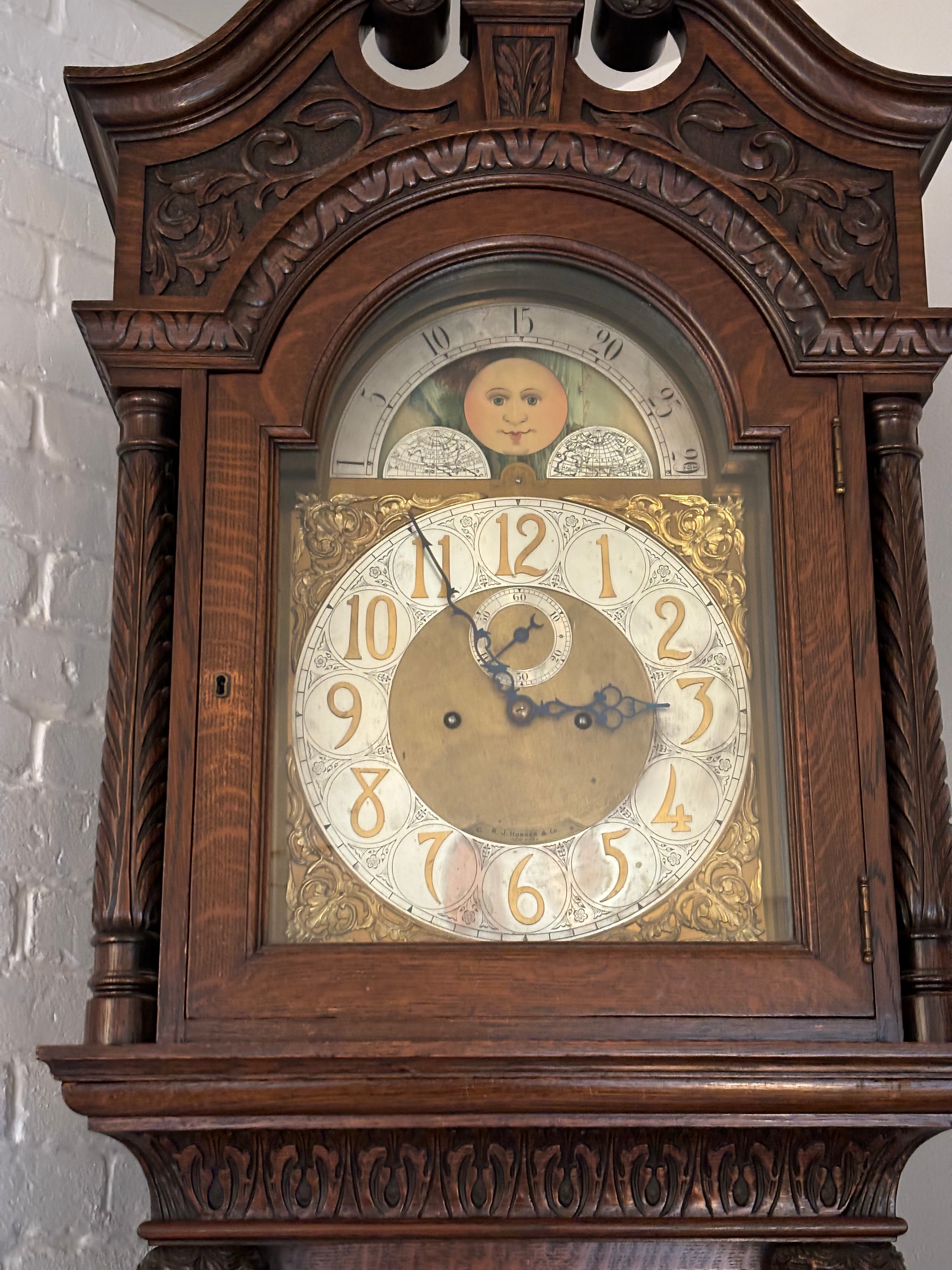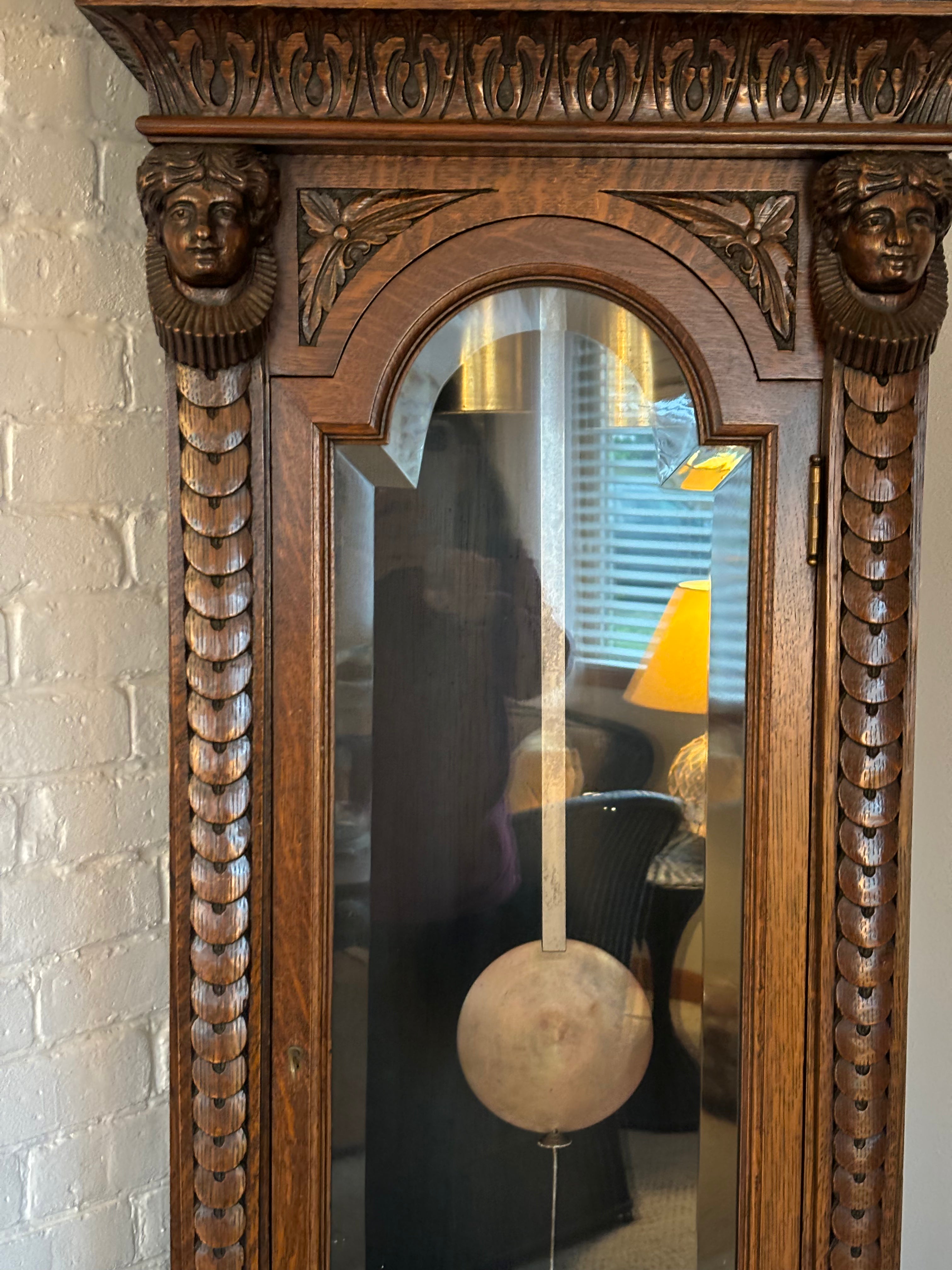Stunning 19th century R. J. Horner & Co. oak hall clock. In ticking condition! Clock face has brass numbering and ornate corners in a floral motif. The makers mark can be found right above the six hour number. There is also a smaller seconds face just under the twelve hour number. Above the face there is a demi-lune moon dial, a wonderful touch! Two 3 dimensional portraits of men wearing ruffs are smiling on the top corners of the body of the clock. The base is intricately carved in a matching floral motif as found in the clock face. Constructed from oak wood. Originally purchased through Tiffany's.