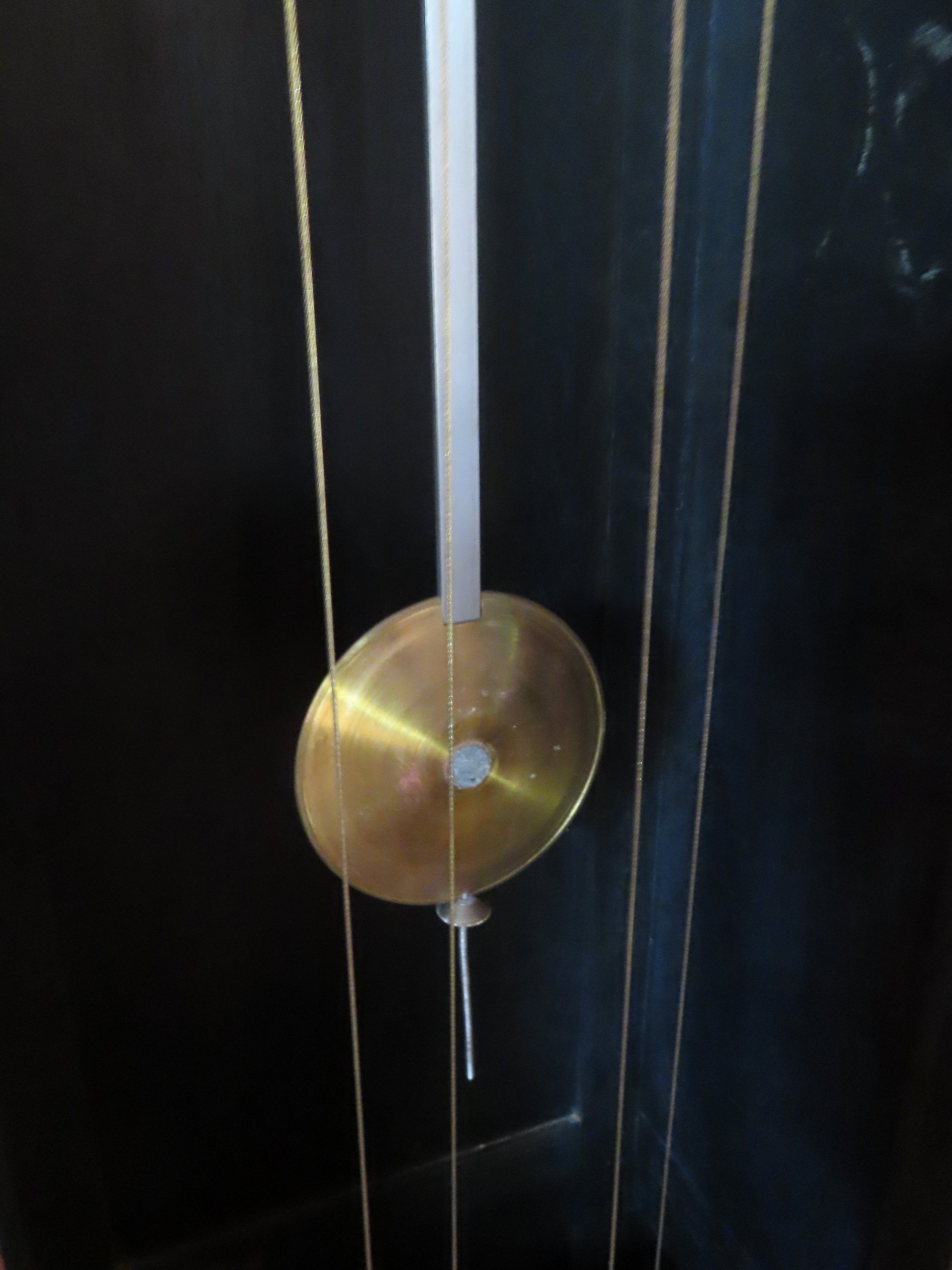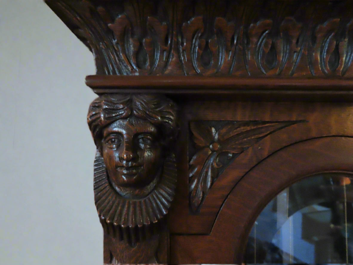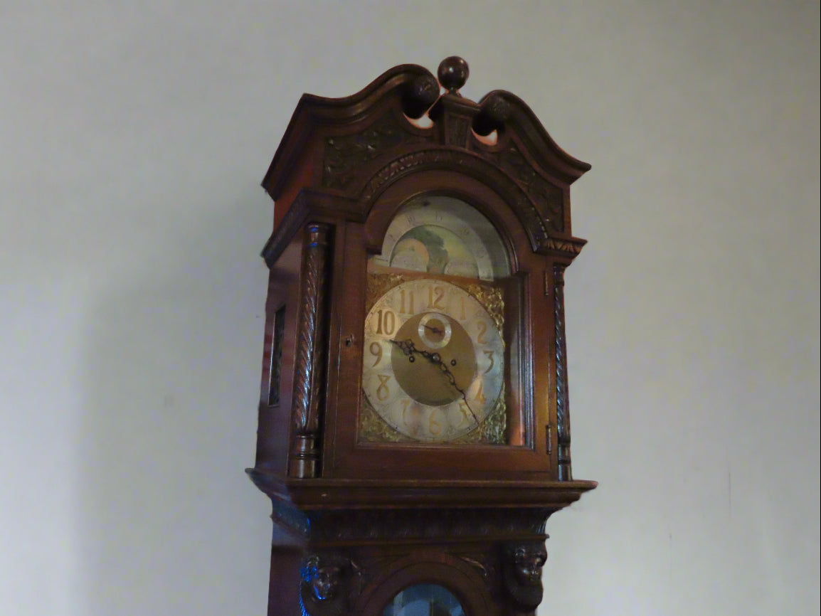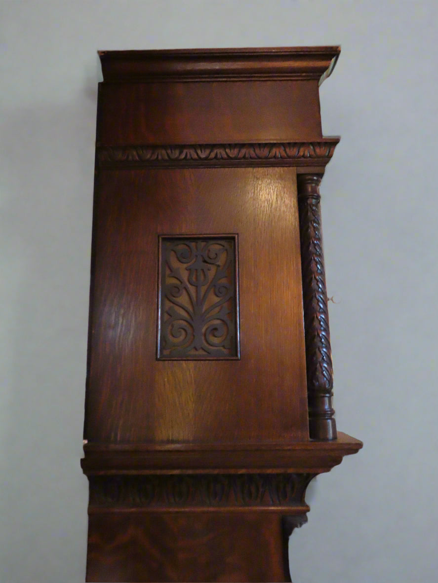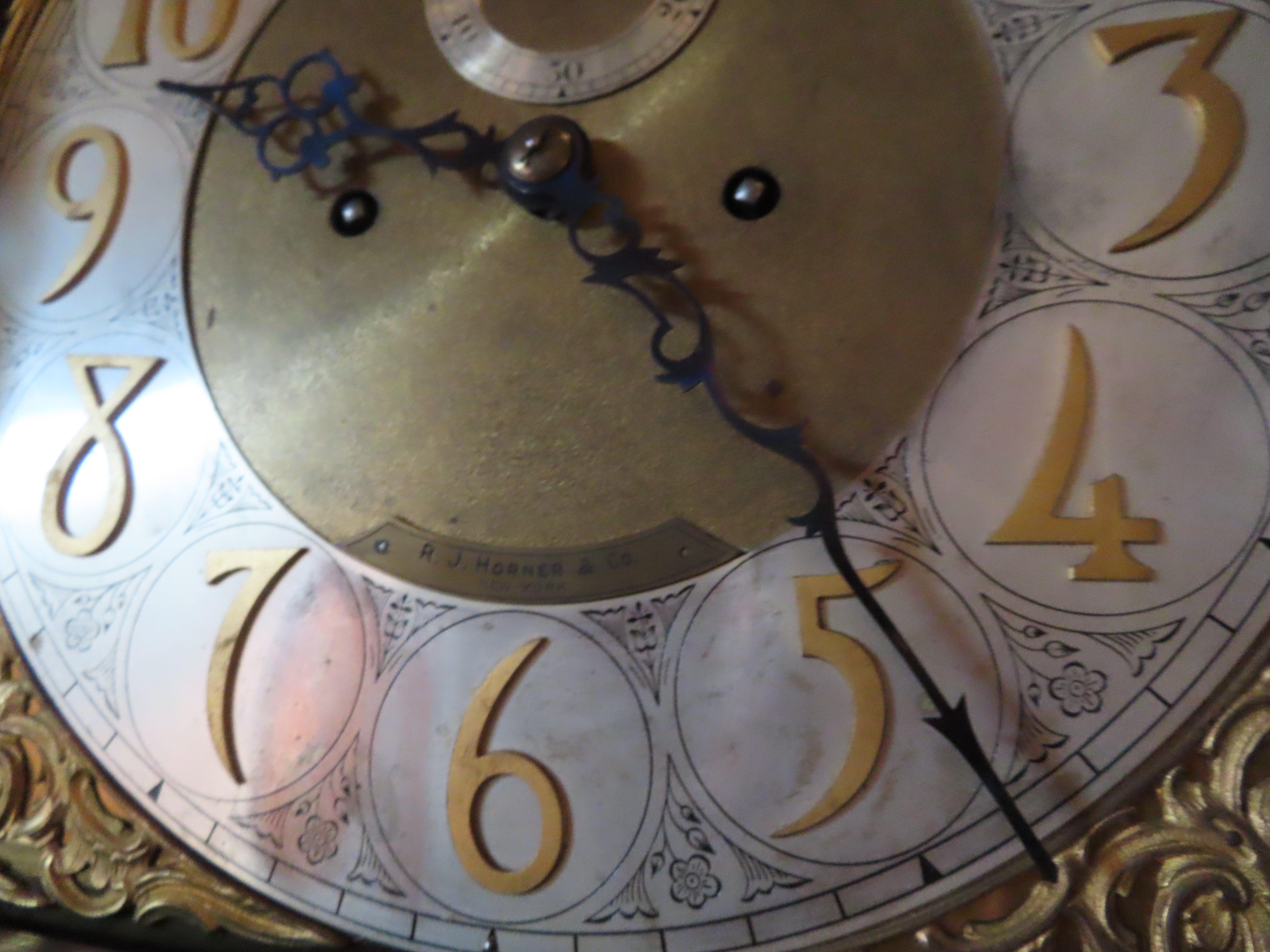 Stunning 19th century R. J. Horner & Co. oak hall clock. In ticking condition! Clock face has brass numbering and ornate corners in a floral motif. The makers mark can be found right above the six hour number. There is also a smaller seconds face just under the twelve hour number. Above the face there is a demi-lune moon dial, a wonderful touch! Two 3 dimensional portraits of men wearing ruffs are smiling on the top corners of the body of the clock. The base is intricately carved in a matching floral motif as found in the clock face. Constructed from oak wood. Originally purchased through Tiffany's.