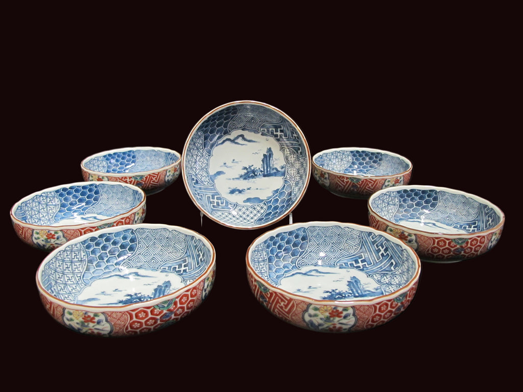 JAPANESE Imari CHIKUSAI Kiln Scallop Rim VILLAGE Landscape Scene Bowl Set of 8