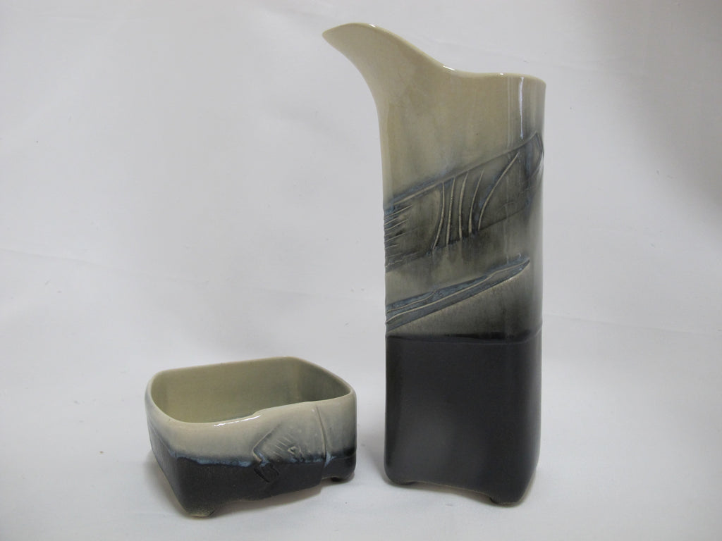Modernist JAPANESE Studio Pottery Blue Textured SAKE Pitcher & Matching Cup