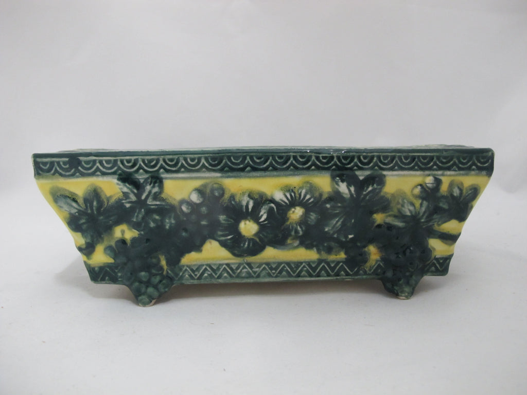 MAJOLICA Japan Rectangular Green & Yellow Flower PLANTER Box with Grape Feet