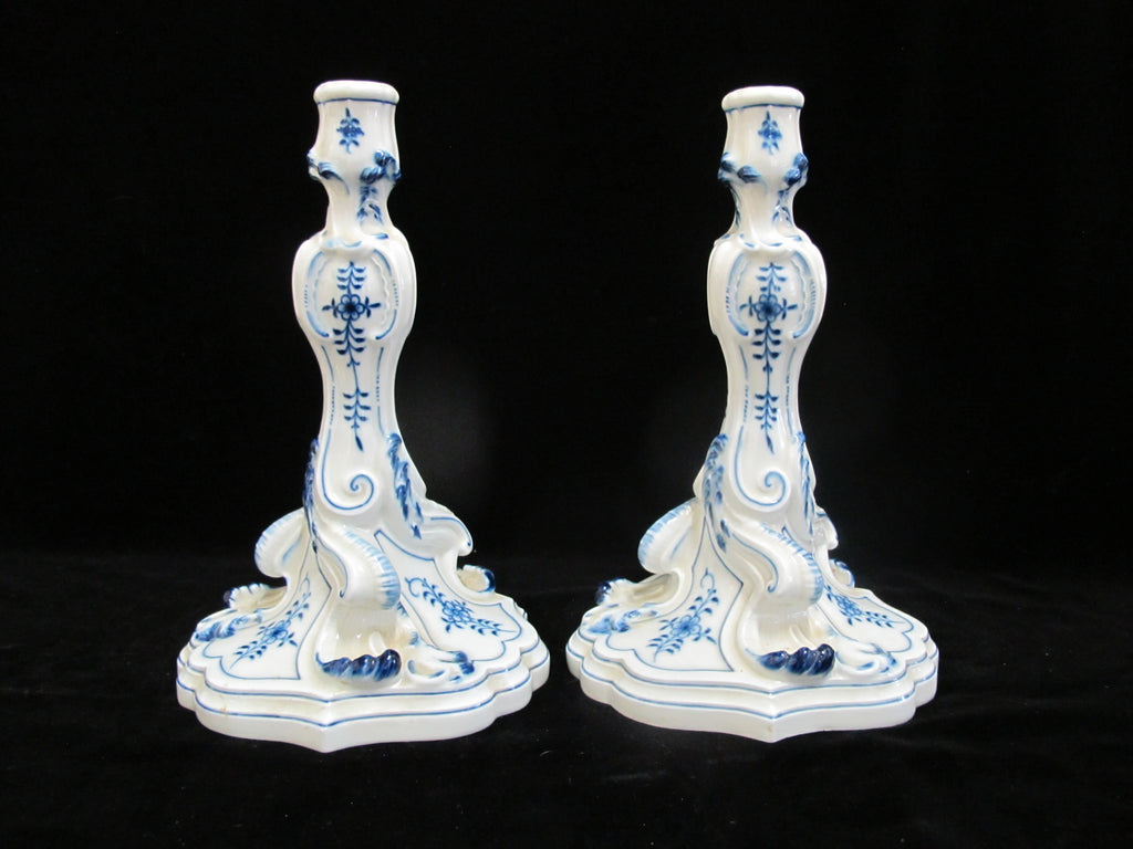 Vintage MEISSEN Porcelain Blue Onion 10" CANDLESTICK Candle Holder Pair
