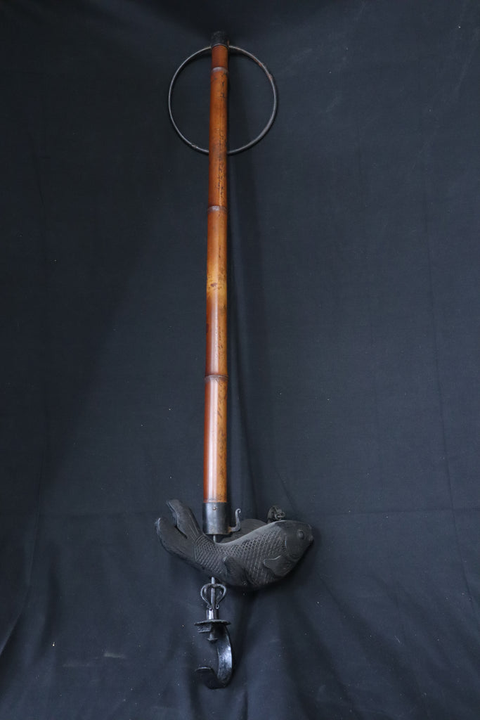 Antique Japanese Jizai Kagi with Handcarved Wooden koi & Iron Pot Holder On Bamboo Pole