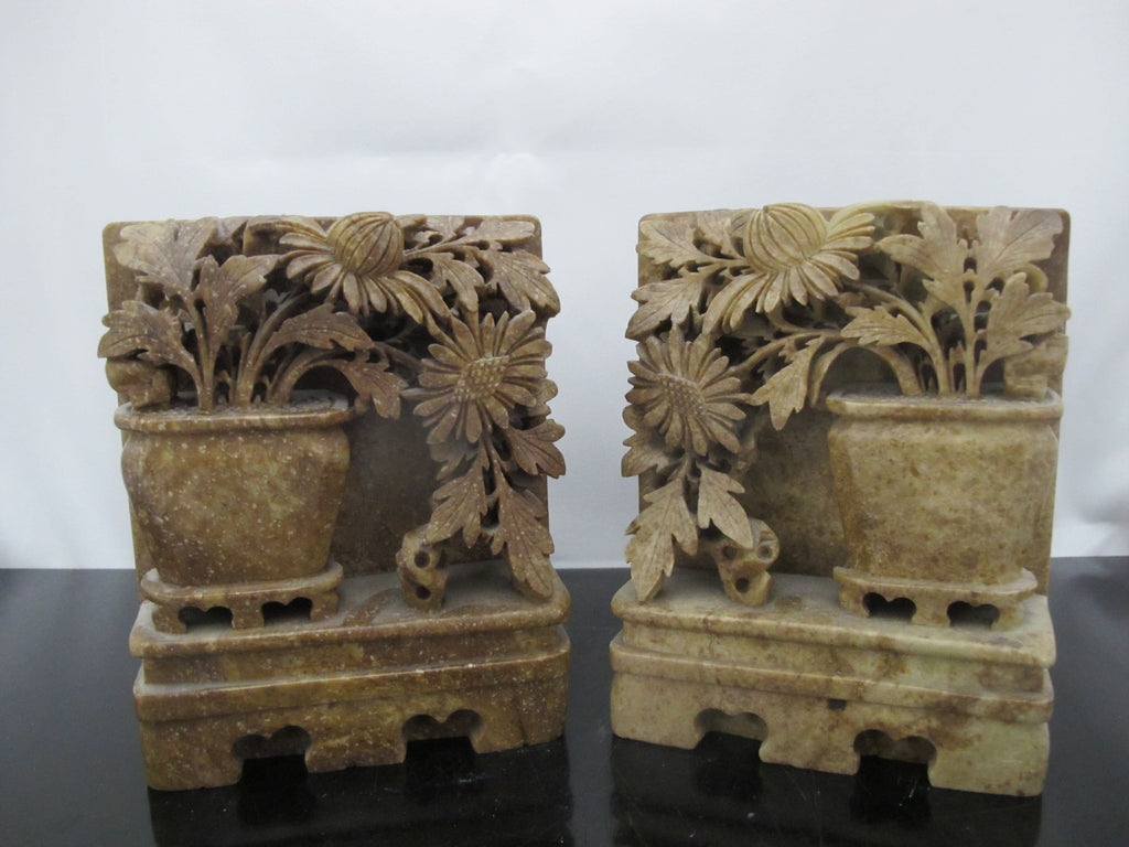 CHINESE Hand Carved Soapstone Ornate Potted FLOWER Design BOOKENDS Sculptures