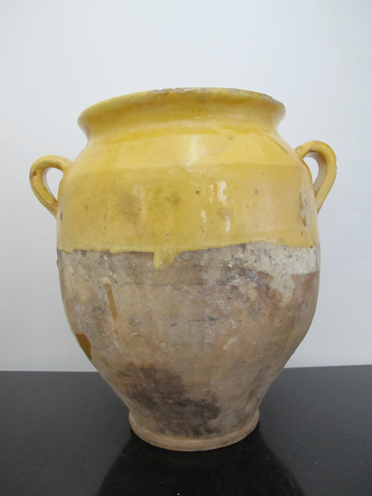 Antique 19thc FRENCH Glazed Yellow CONFIT Pottery JUG Jar w/Handles 10 1/2"