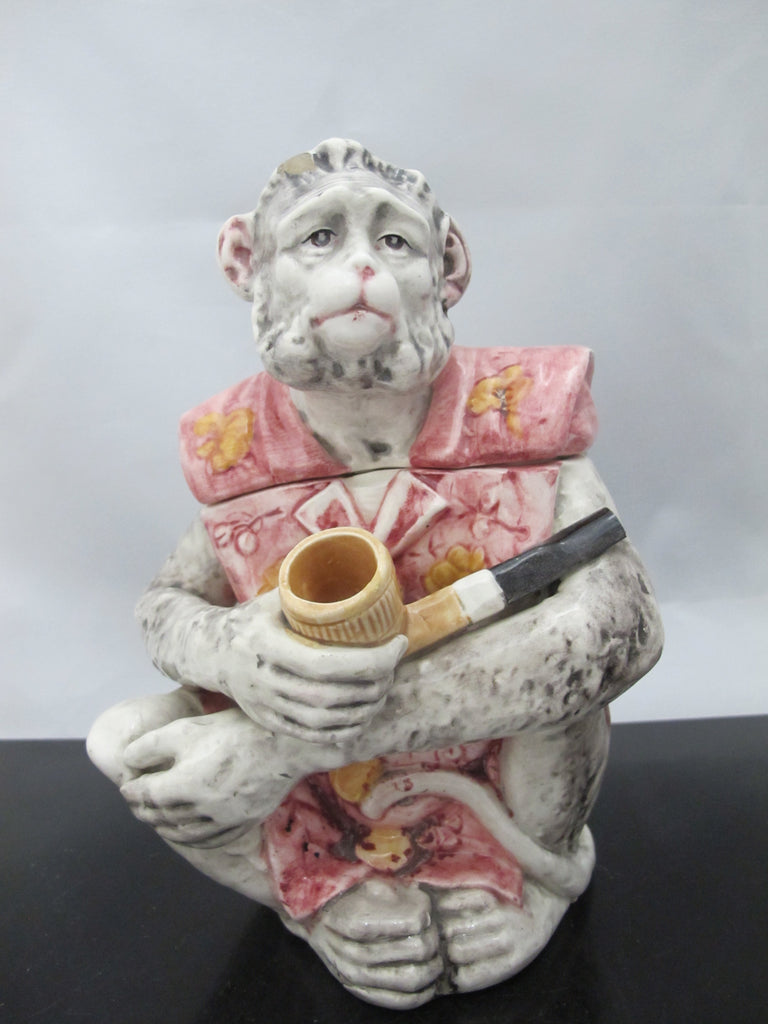 Antique Austria MAJOLICA Pipe Smoking MONKEY Tobacco Humidor Jar w/Lid