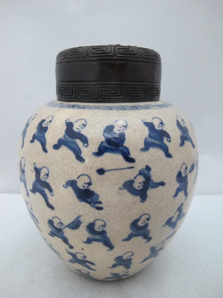 Qing Dynasty 100 BOYS Chinese Ginger Jar or SNUFF BOTTLE With Carved Wood Lid