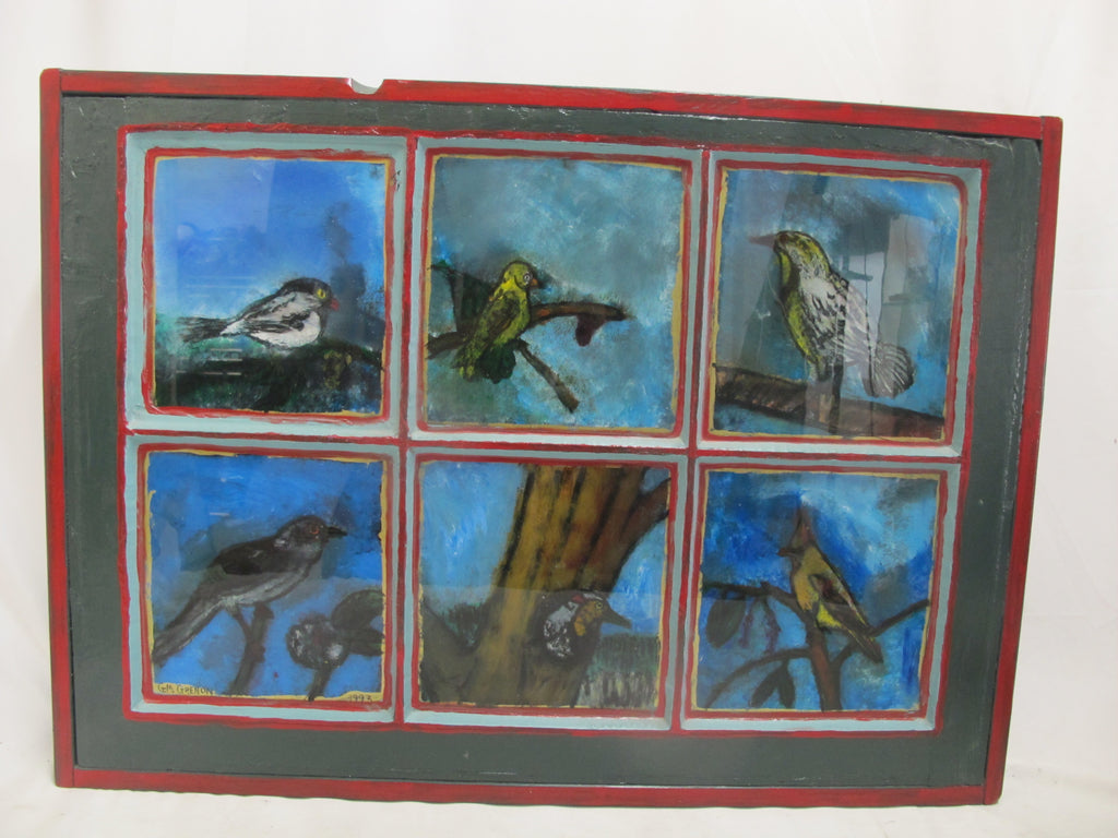 GREGORY GRENON Pacific NW Oil Painting on Wood Window Pane of BIRDS at HOME