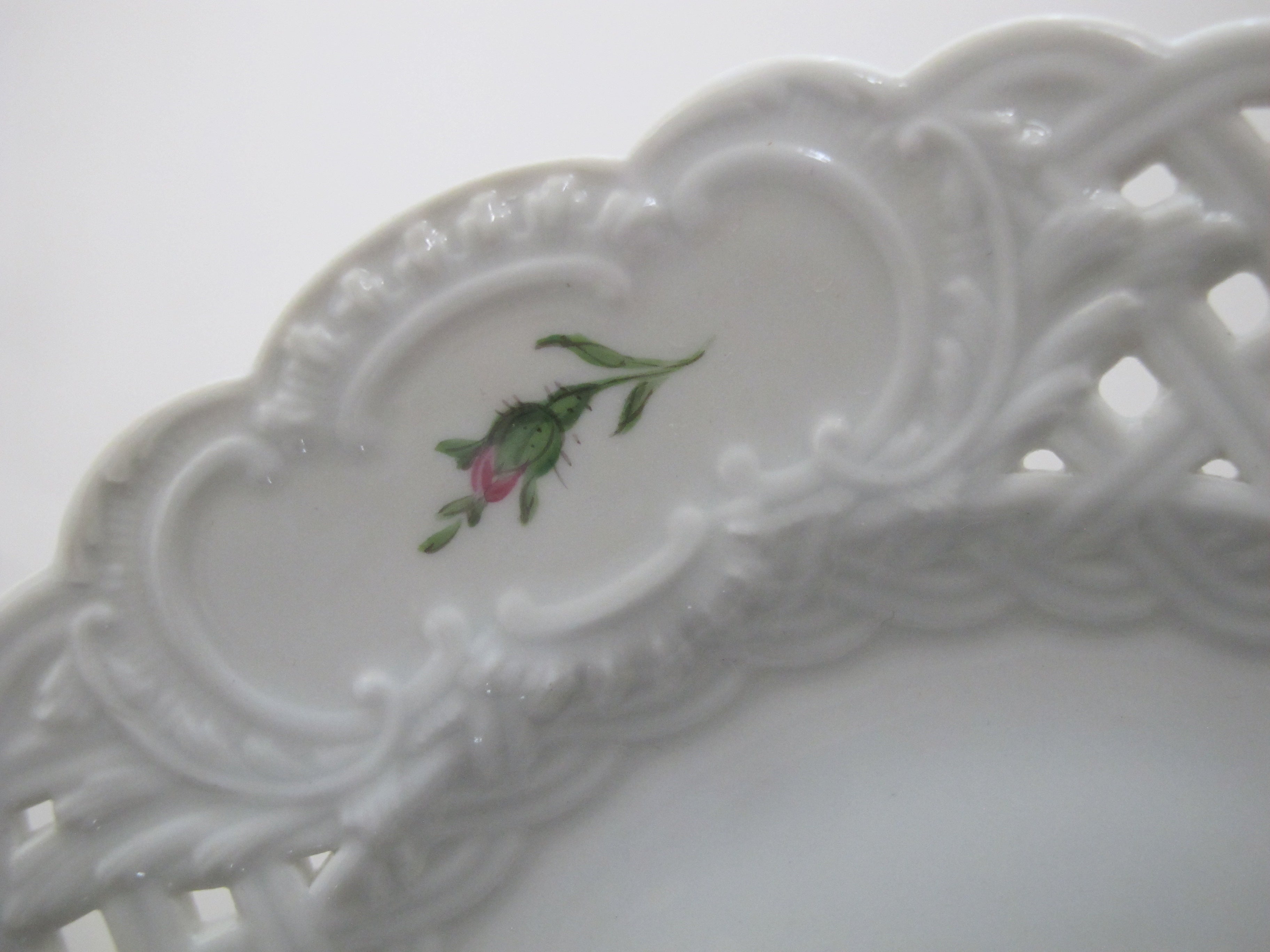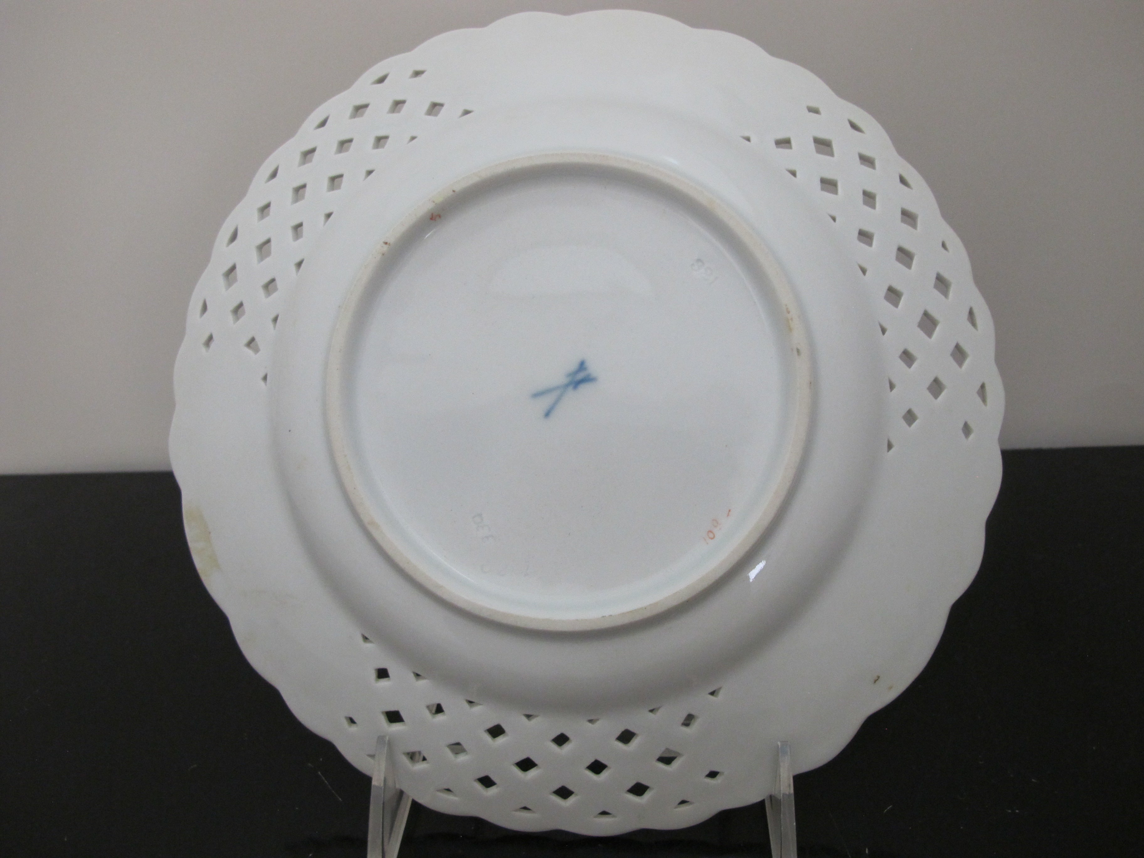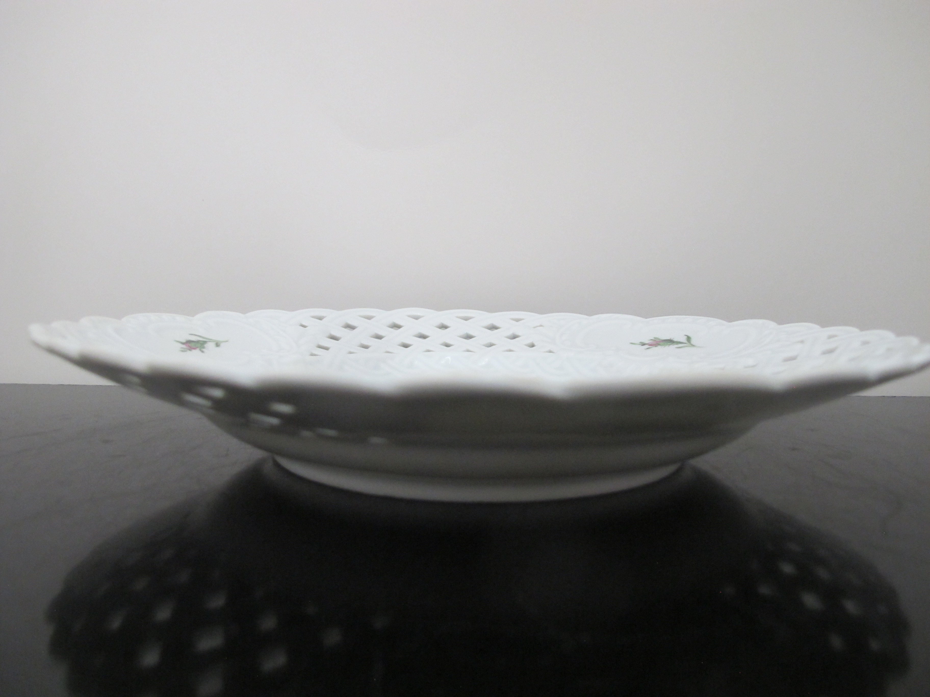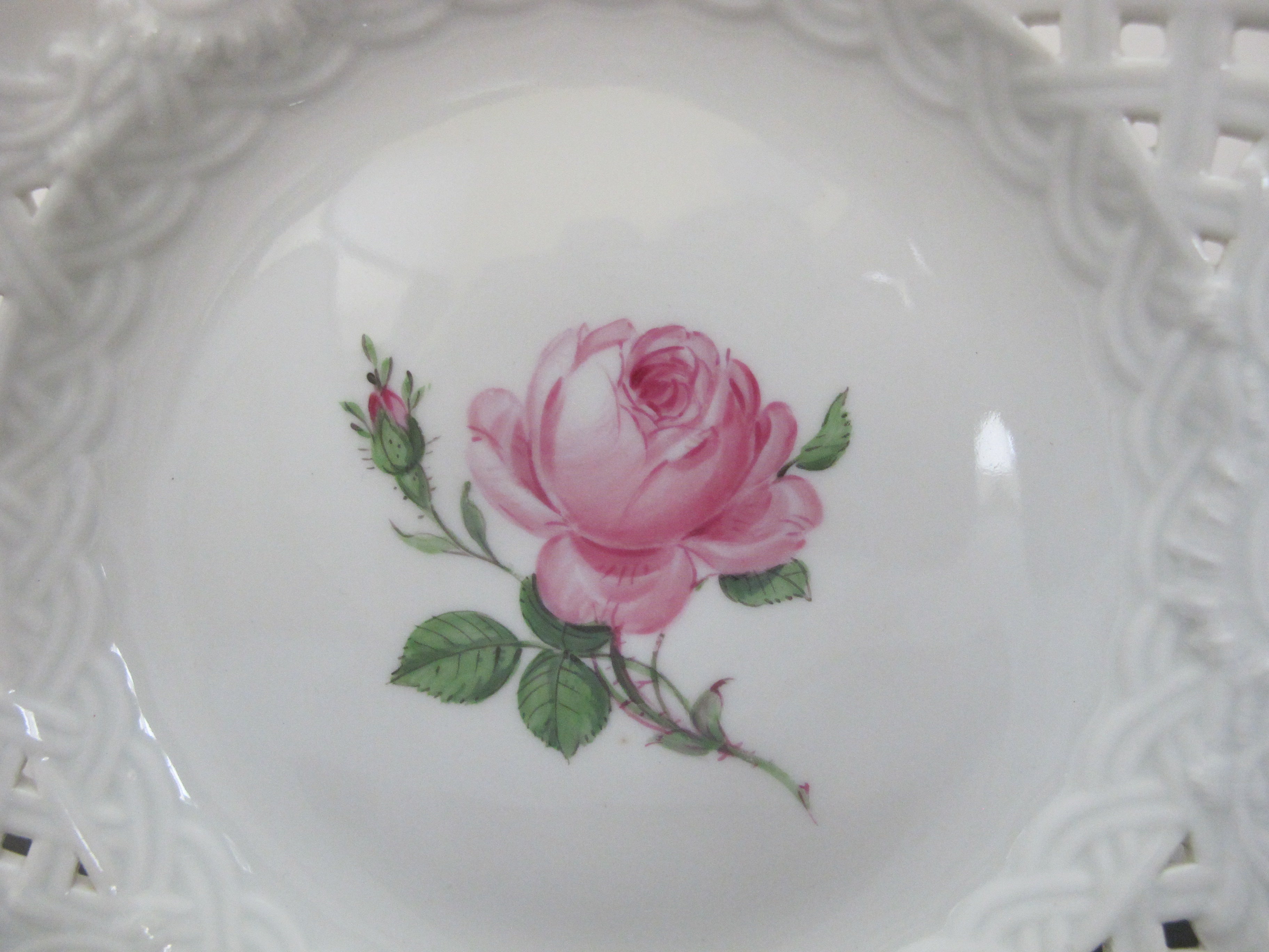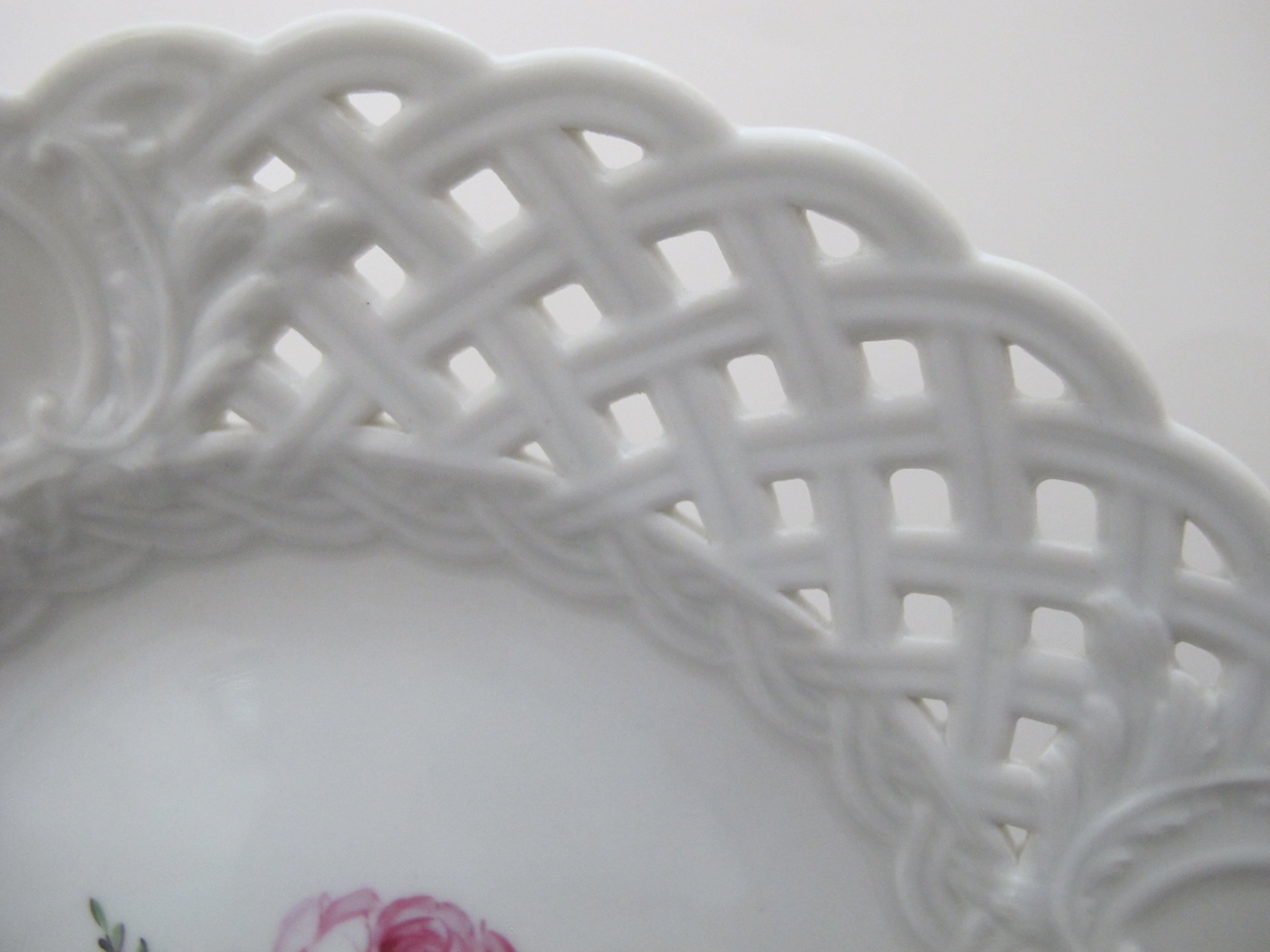 A sweet plate for your sweets! Antique Meissen porcelain plate. White with pink rose flower and green leaves design. Open work, basket weave texture around rim. Measures 8 1/4". Excellent condition, no chips, cracks, or repairs.