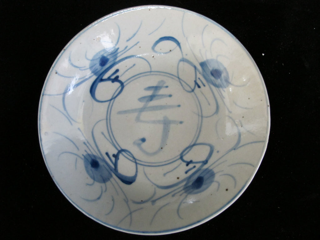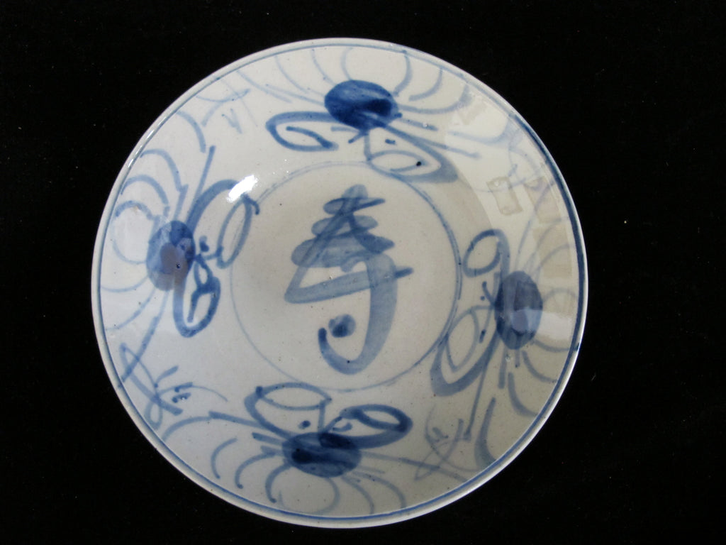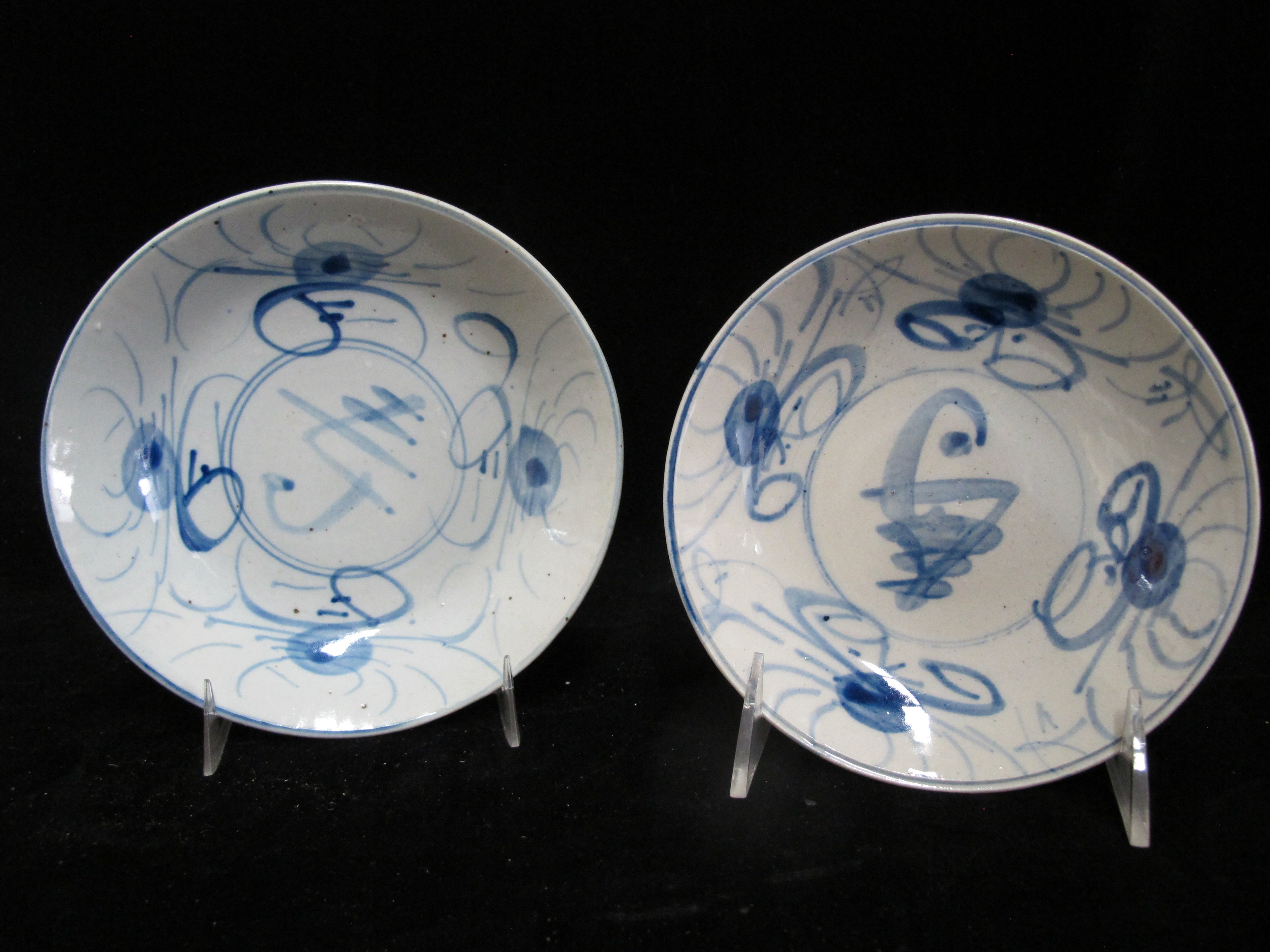 Pair of antique Chinese Swatow ware shallow bowls or saucers. White porcelain with blue crab motif at rim and Chinese character at each center.