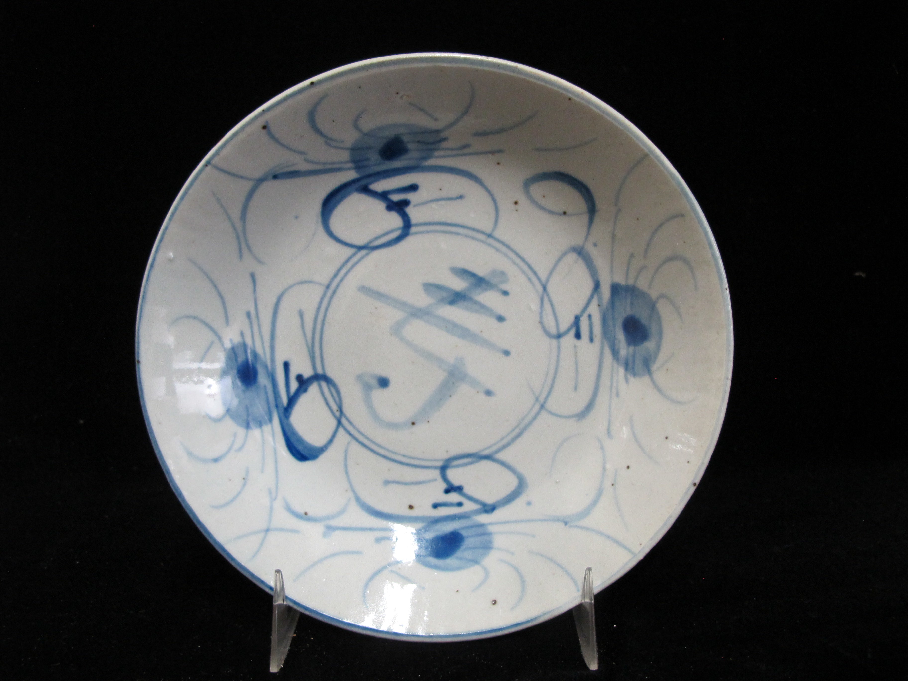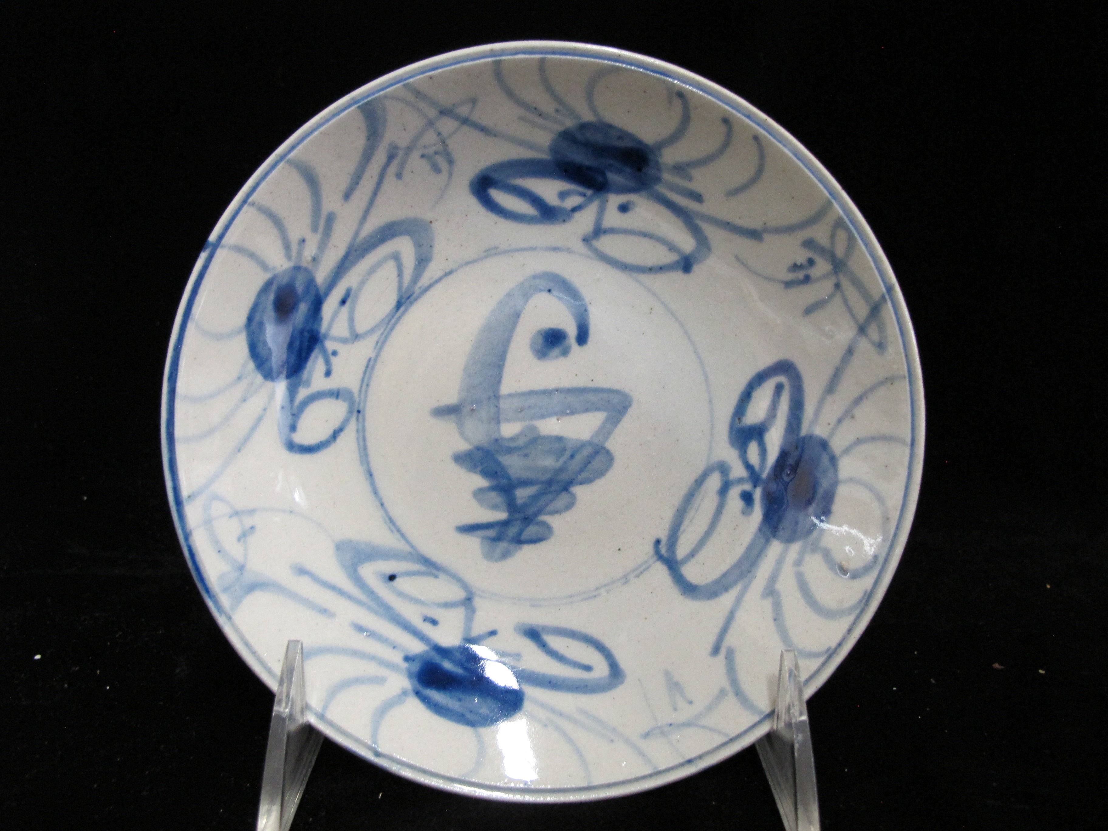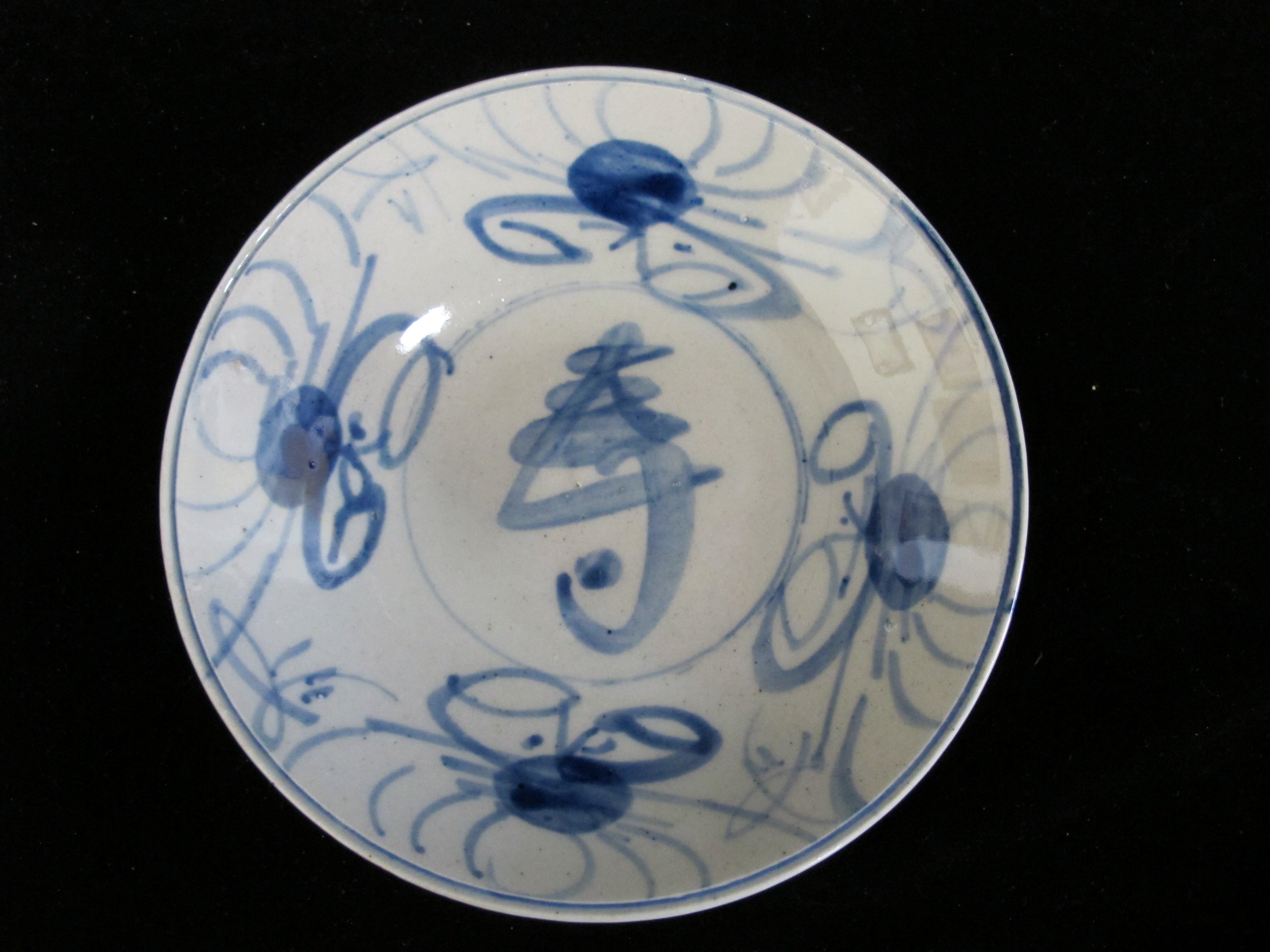 Pair of antique Chinese Swatow ware shallow bowls or saucers. White porcelain with blue crab motif at rim and Chinese character at each center.