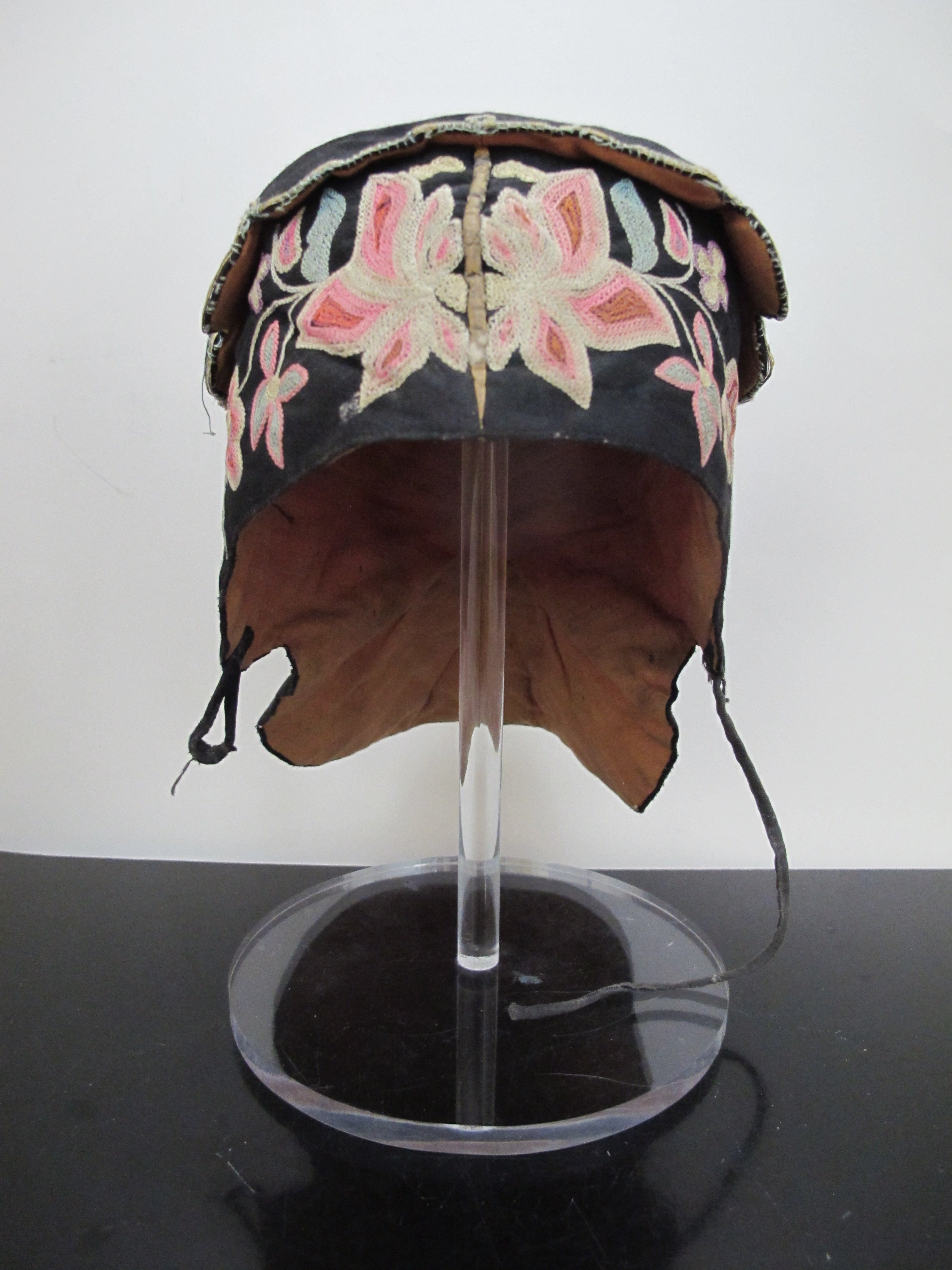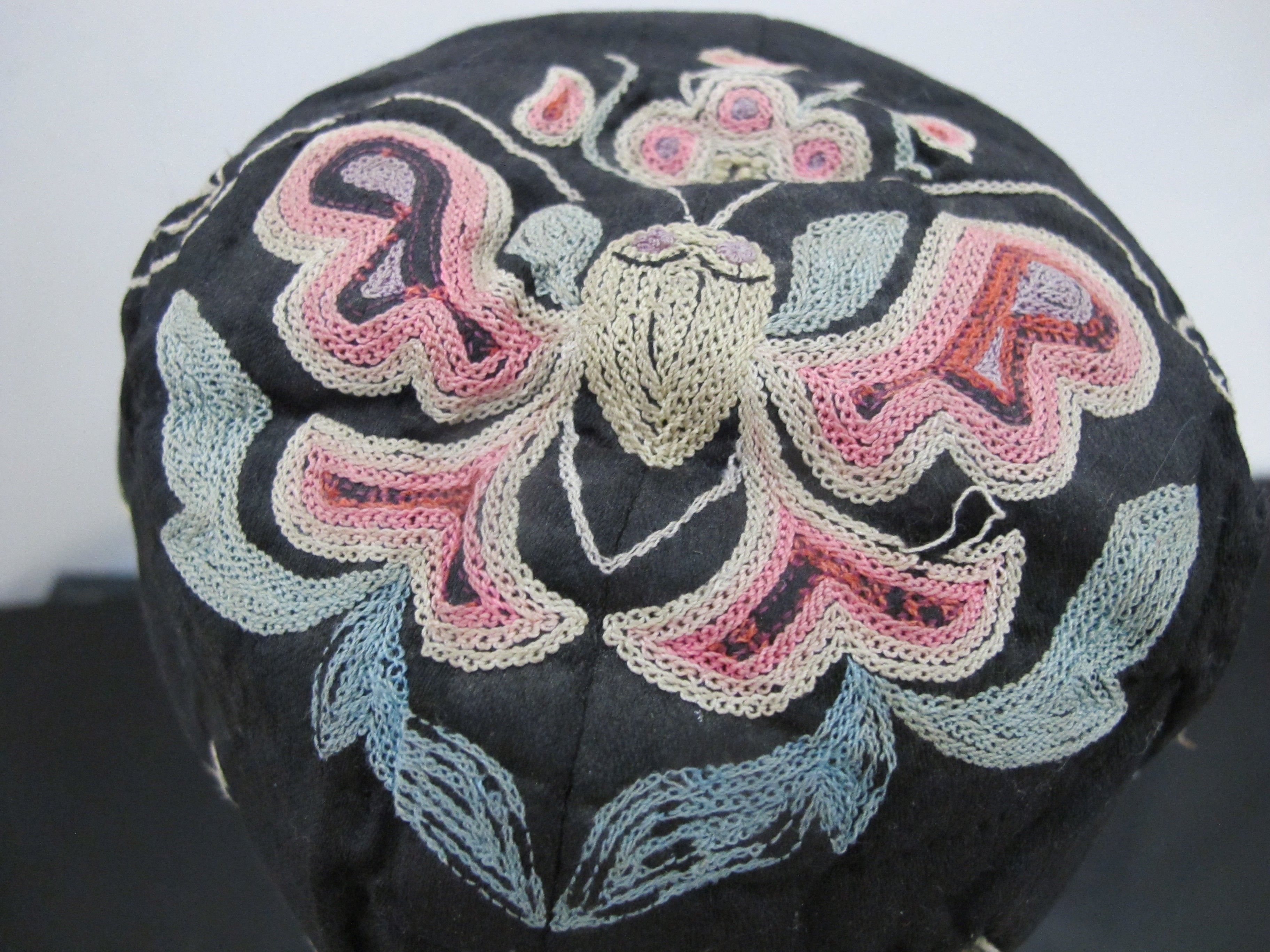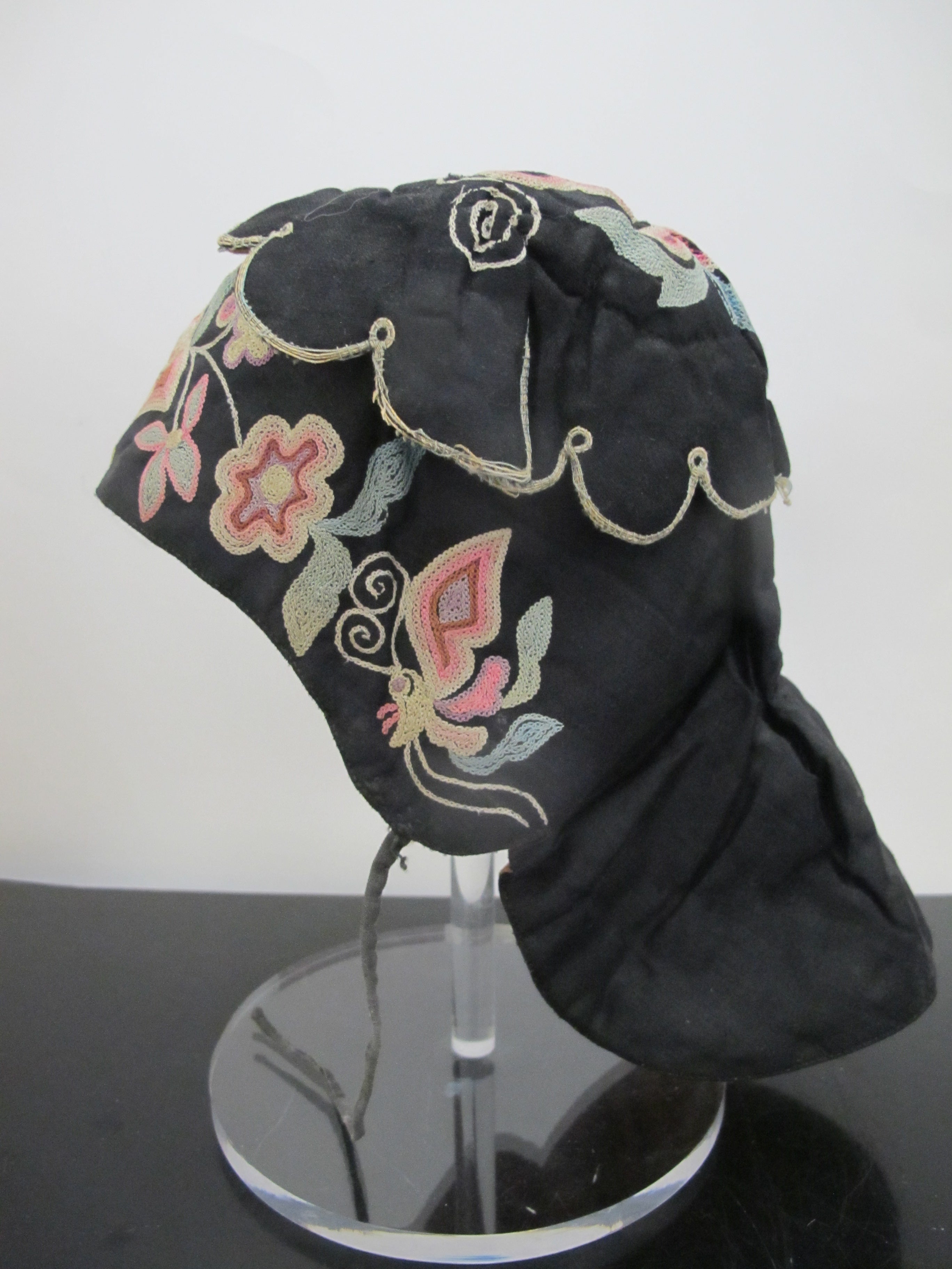 Darling Chinese children's hat, likely from the Qing Dynasty, late 19th or early 20th century. Black silk with heavily hand embroidered floral design.