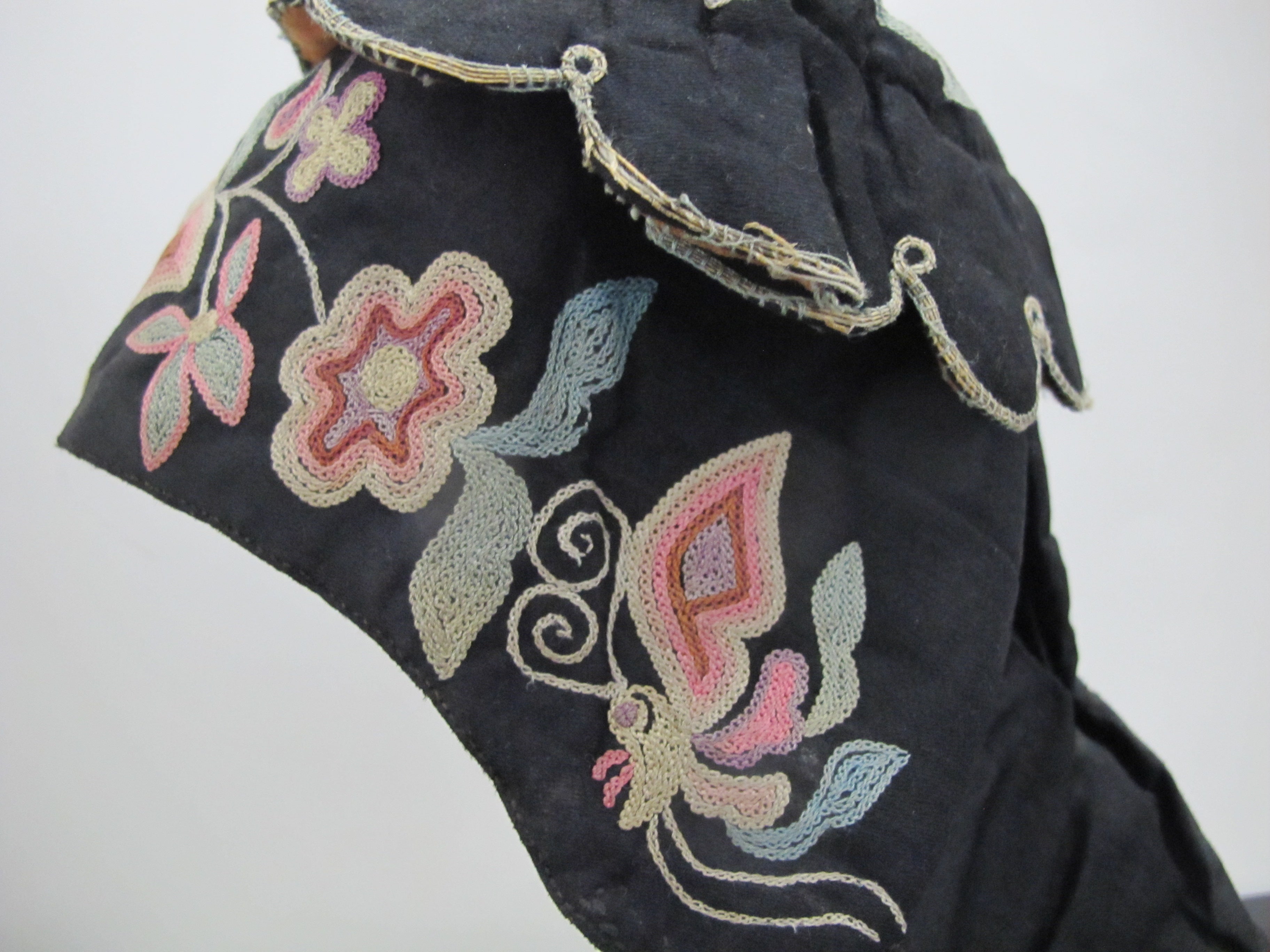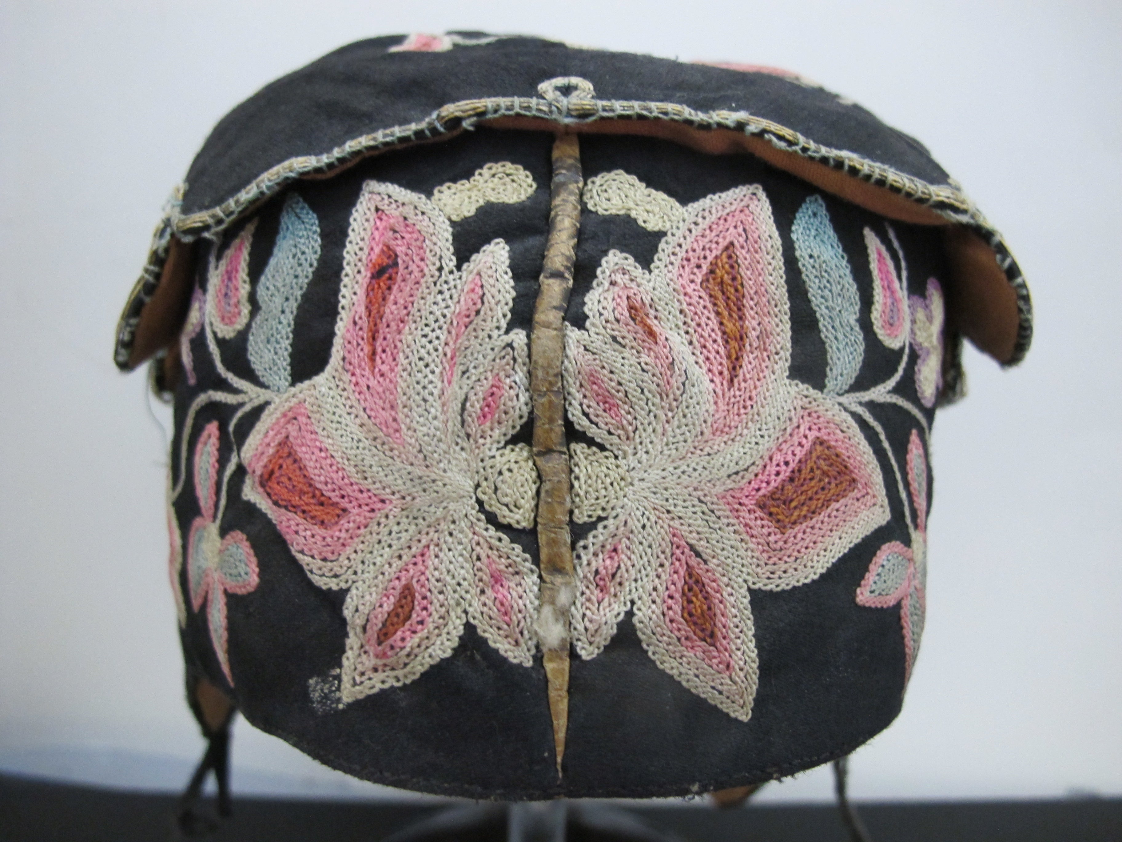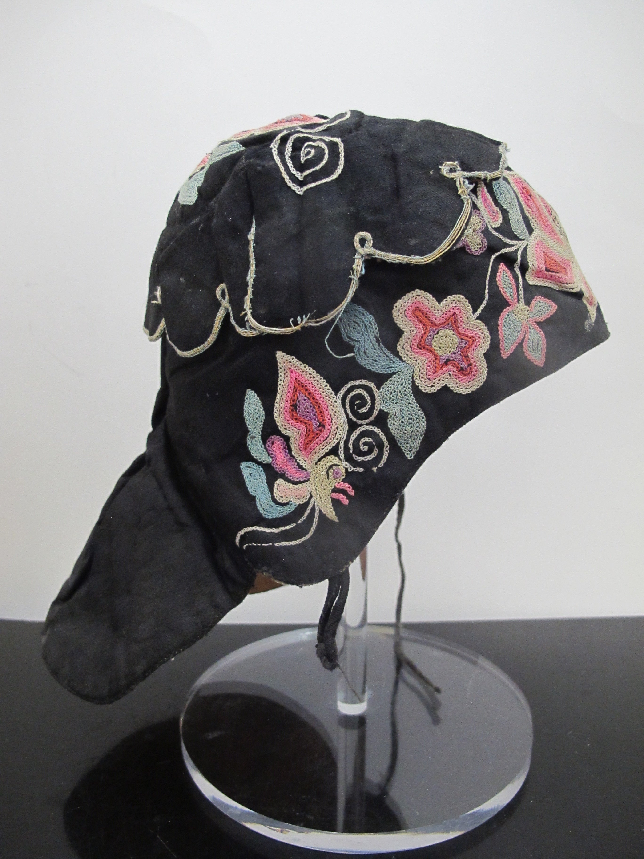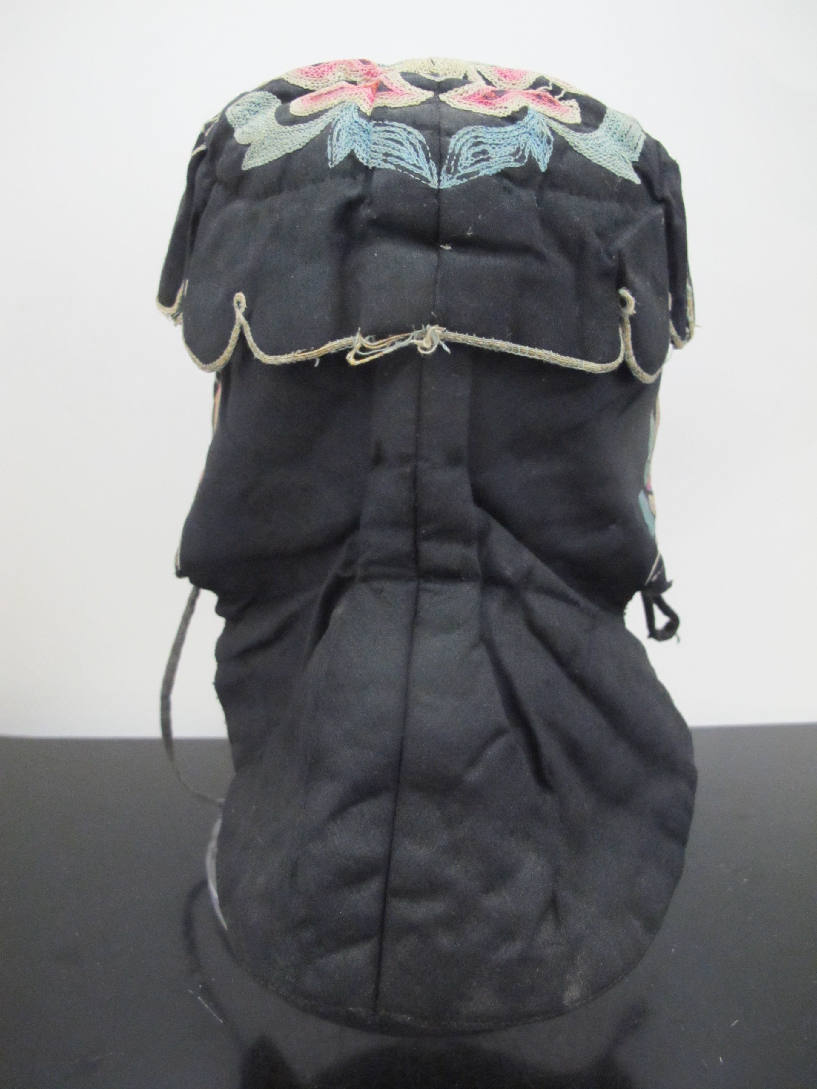 Darling Chinese children's hat, likely from the Qing Dynasty, late 19th or early 20th century. Black silk with heavily hand embroidered floral design.
