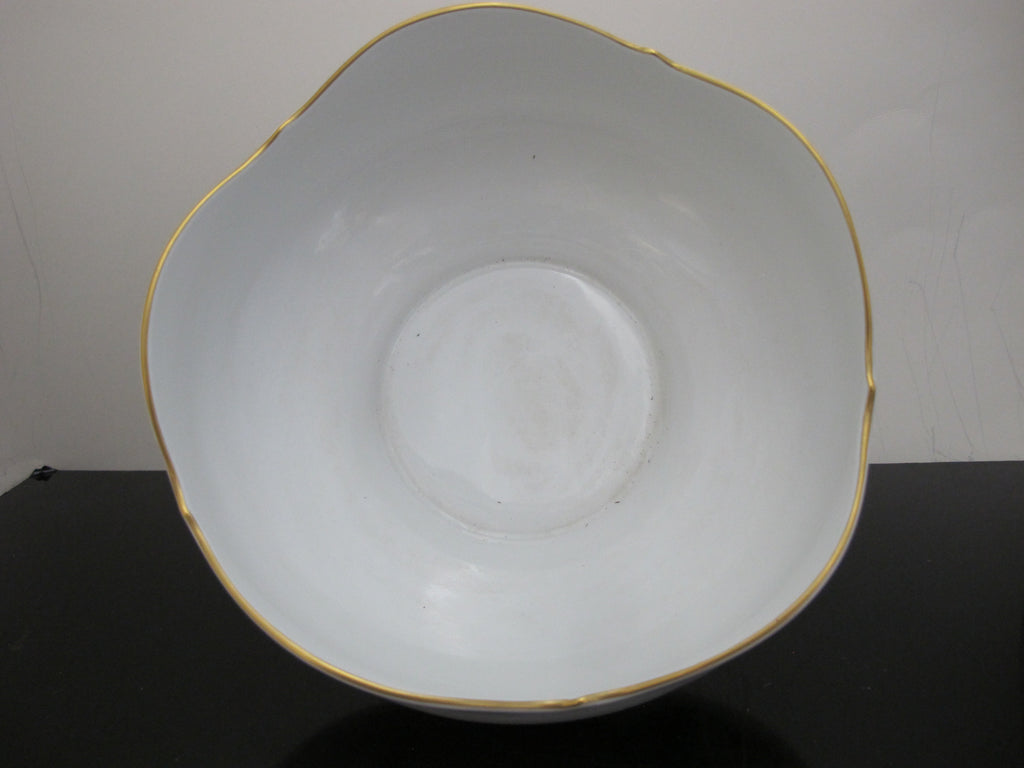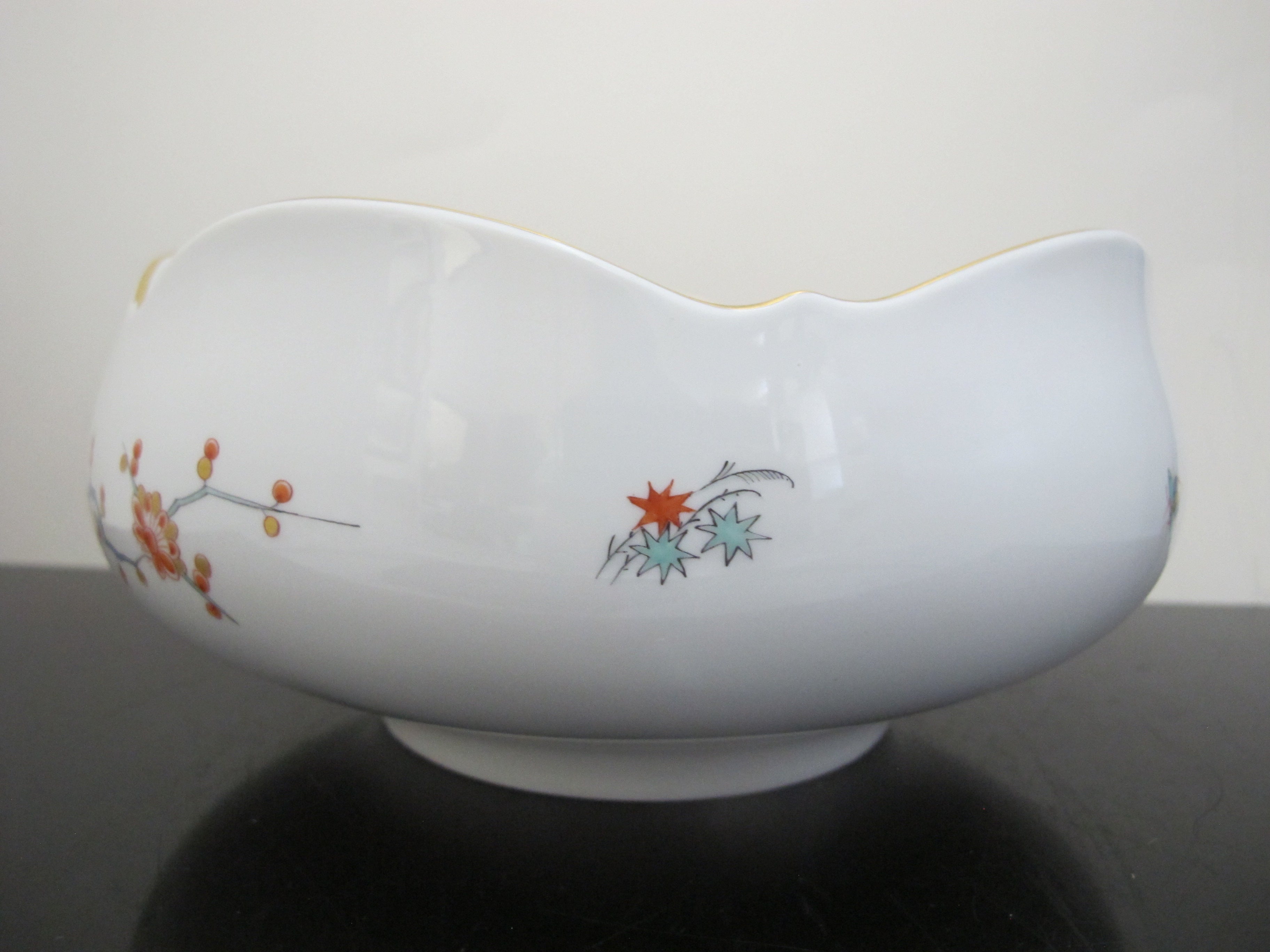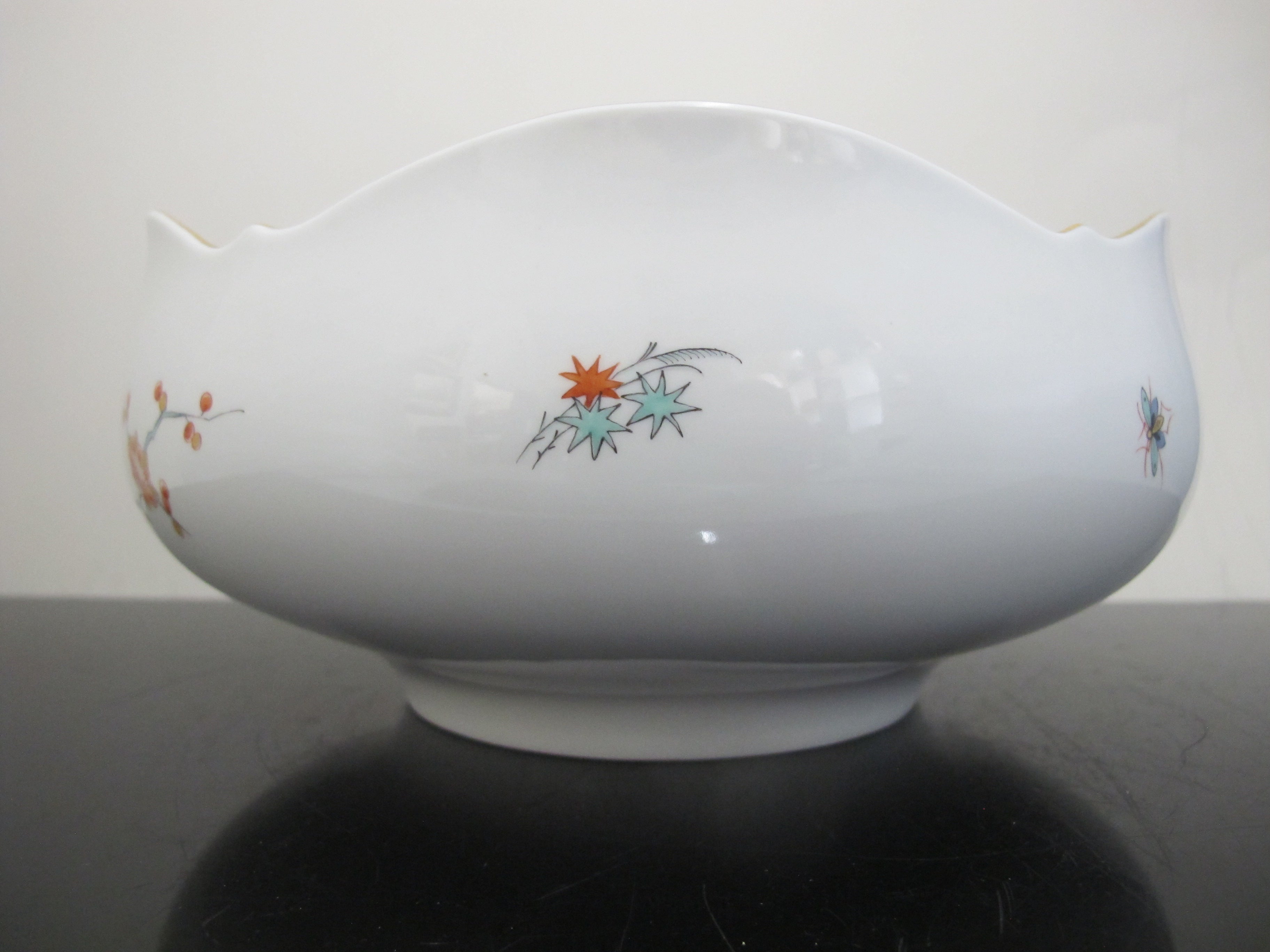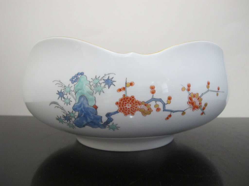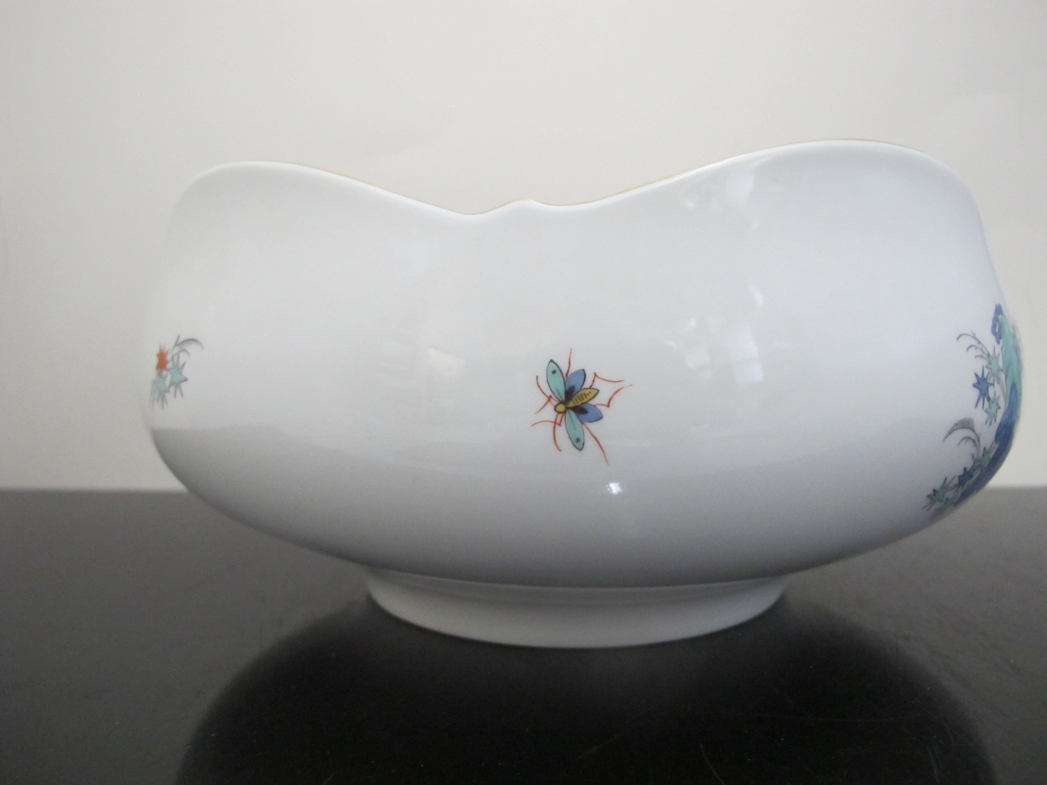 Sweet and lovely antique Meissen porcelain bowl with Japanese Kakiemon insect and flower design. White porcelain showing brightly colored flowers and butterflies. Five rounded sides with gilded trim. Measures 8 1/4" x 4" tall. Excellent condition, no chips, cracks, or repairs. Hallmarks at base.