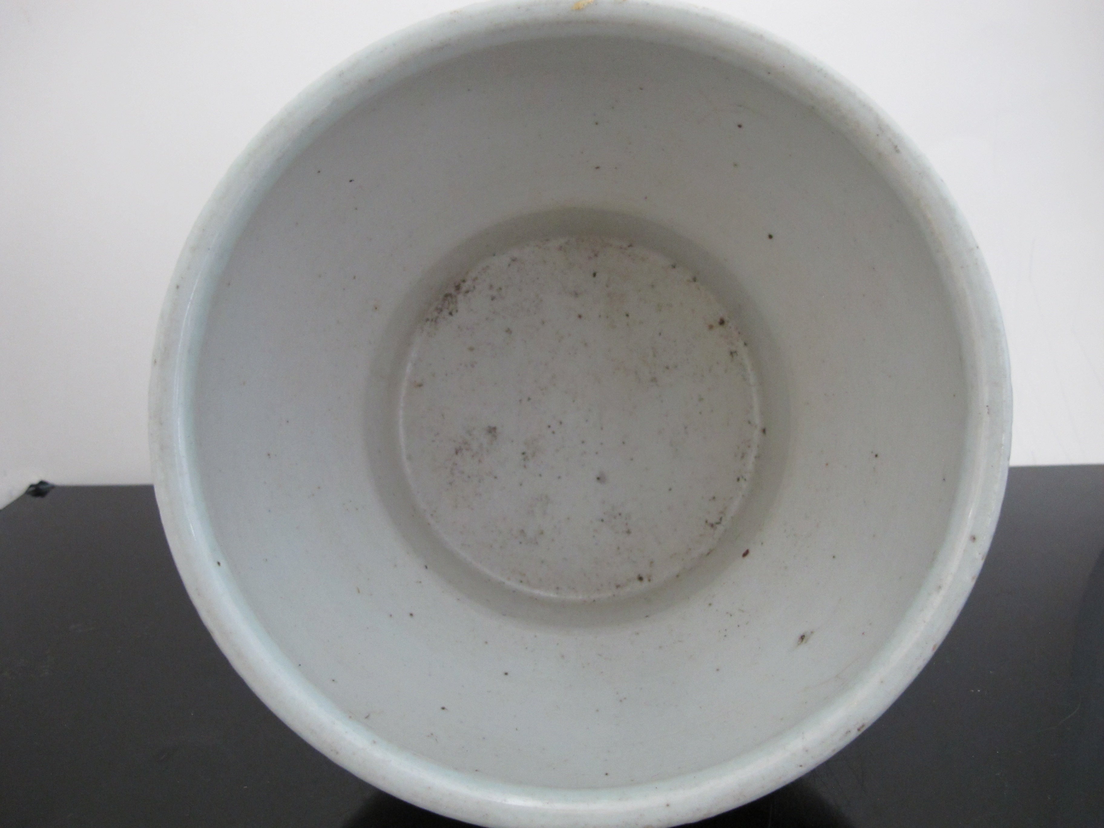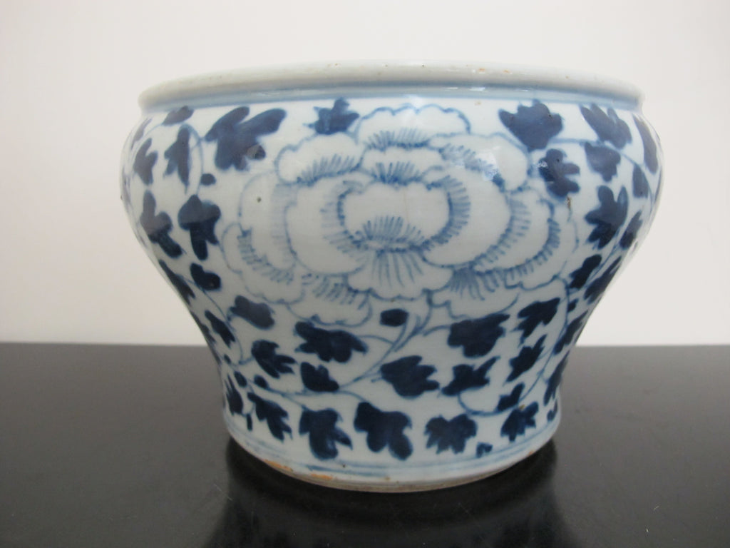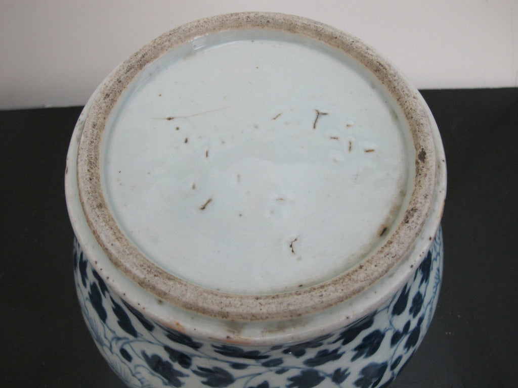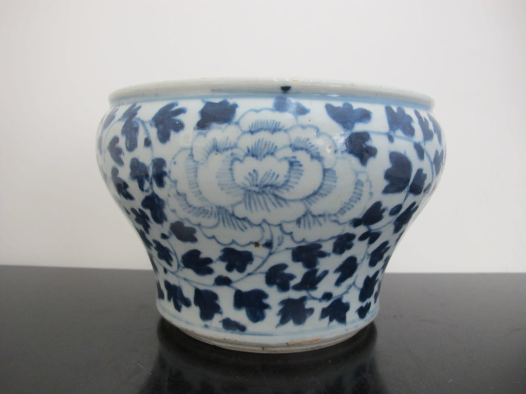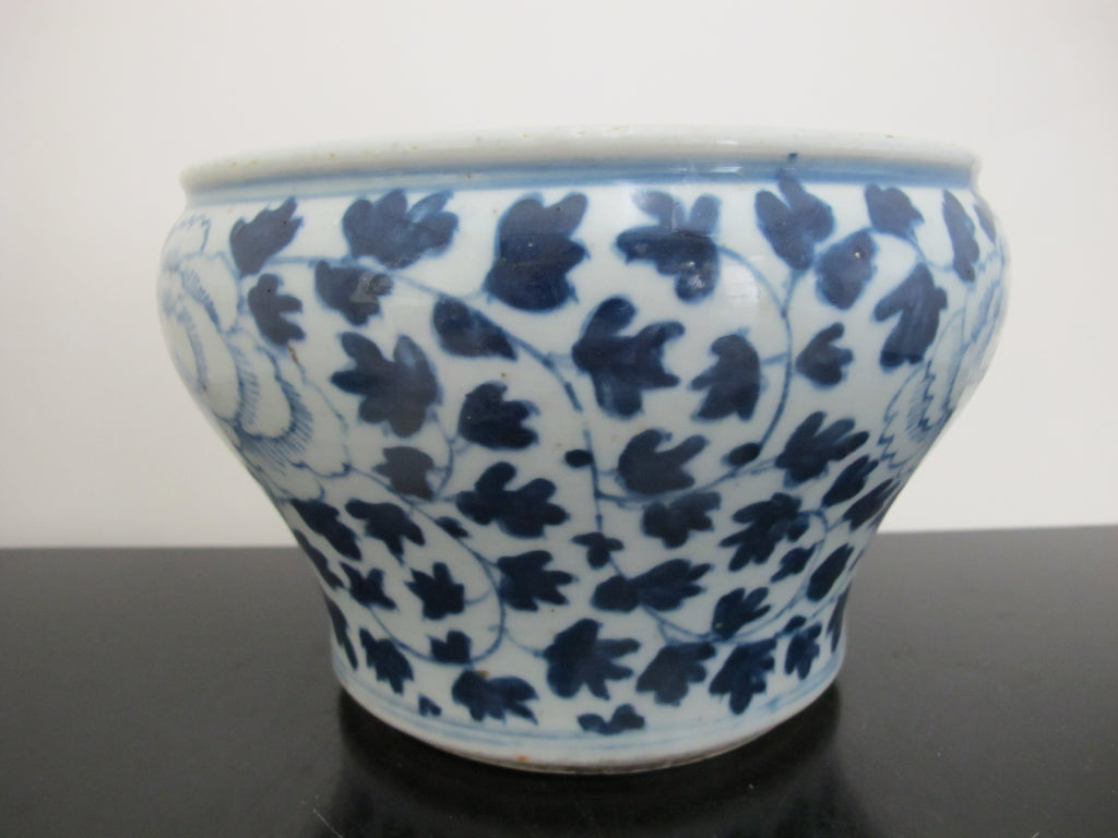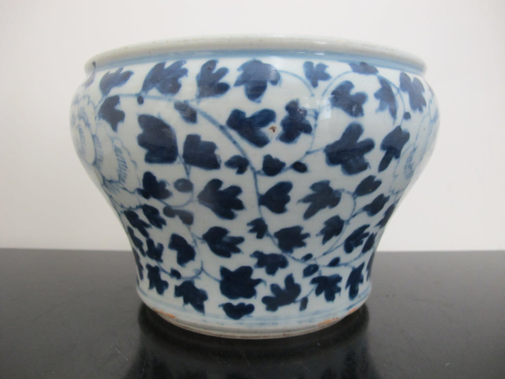 Antique, 19th century Chinese cache pot. White porcelain with blue scrolling vines and flower design. Excellent condition, light wear to glaze considering old age, no major chips, cracks, or repairs.