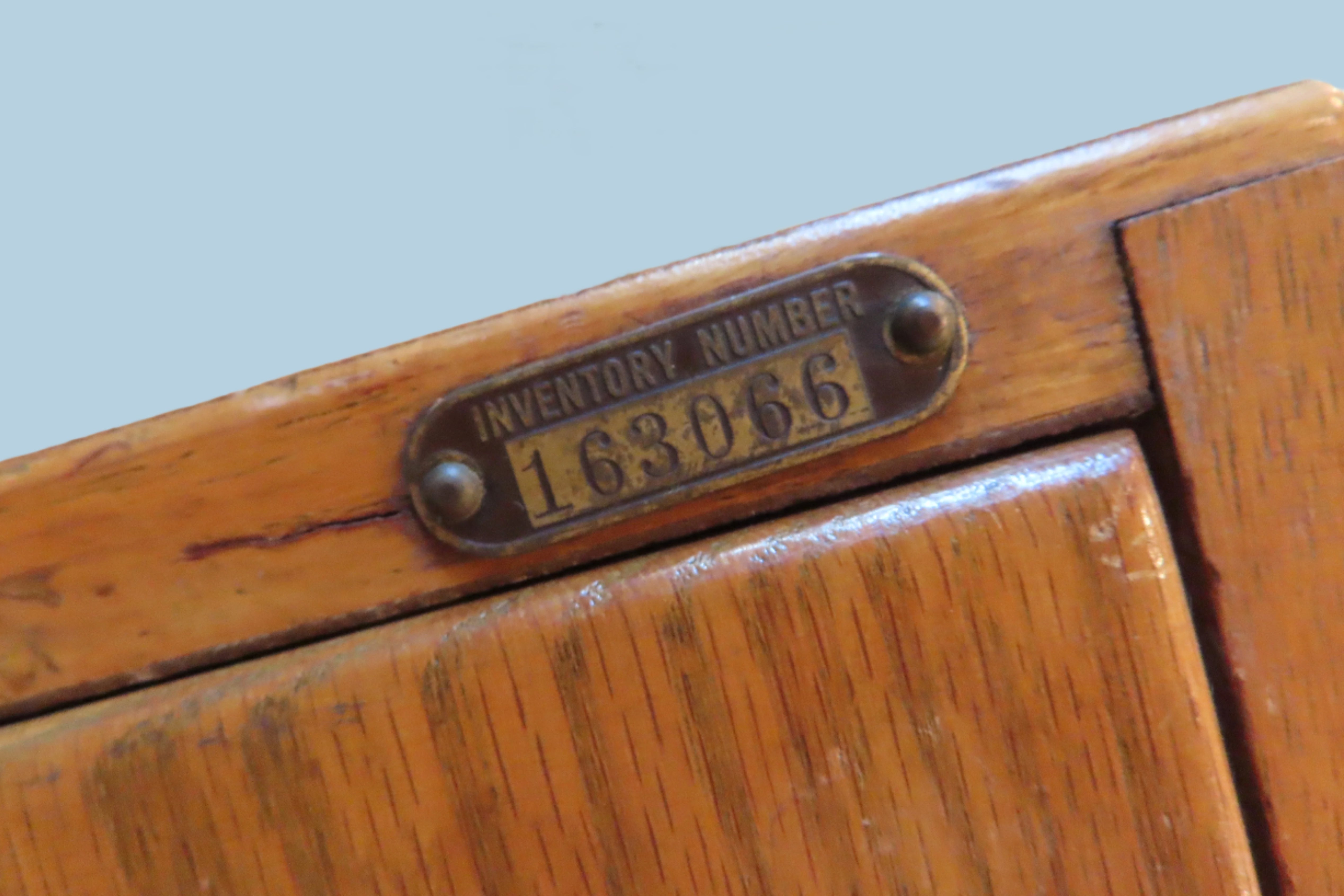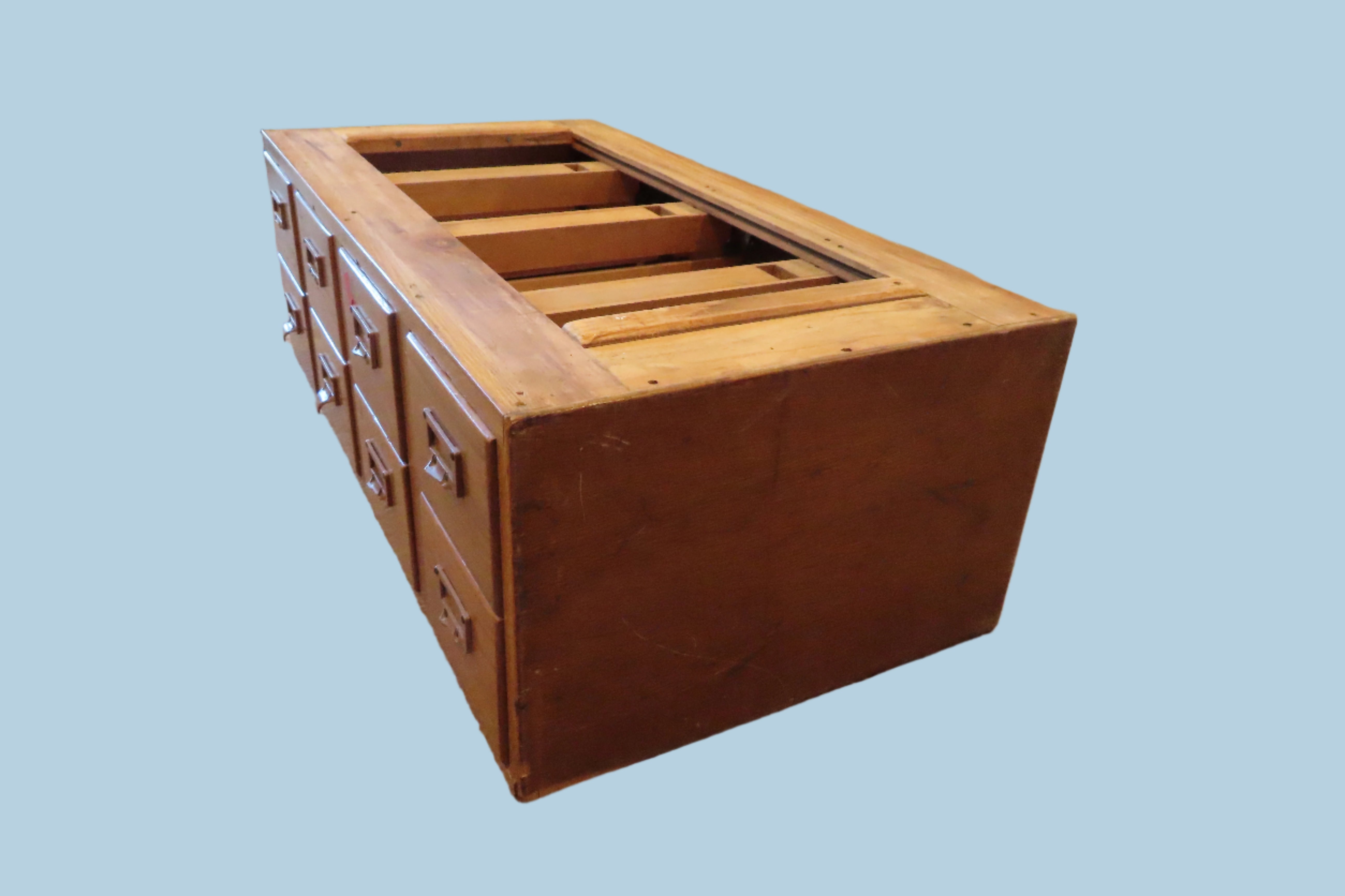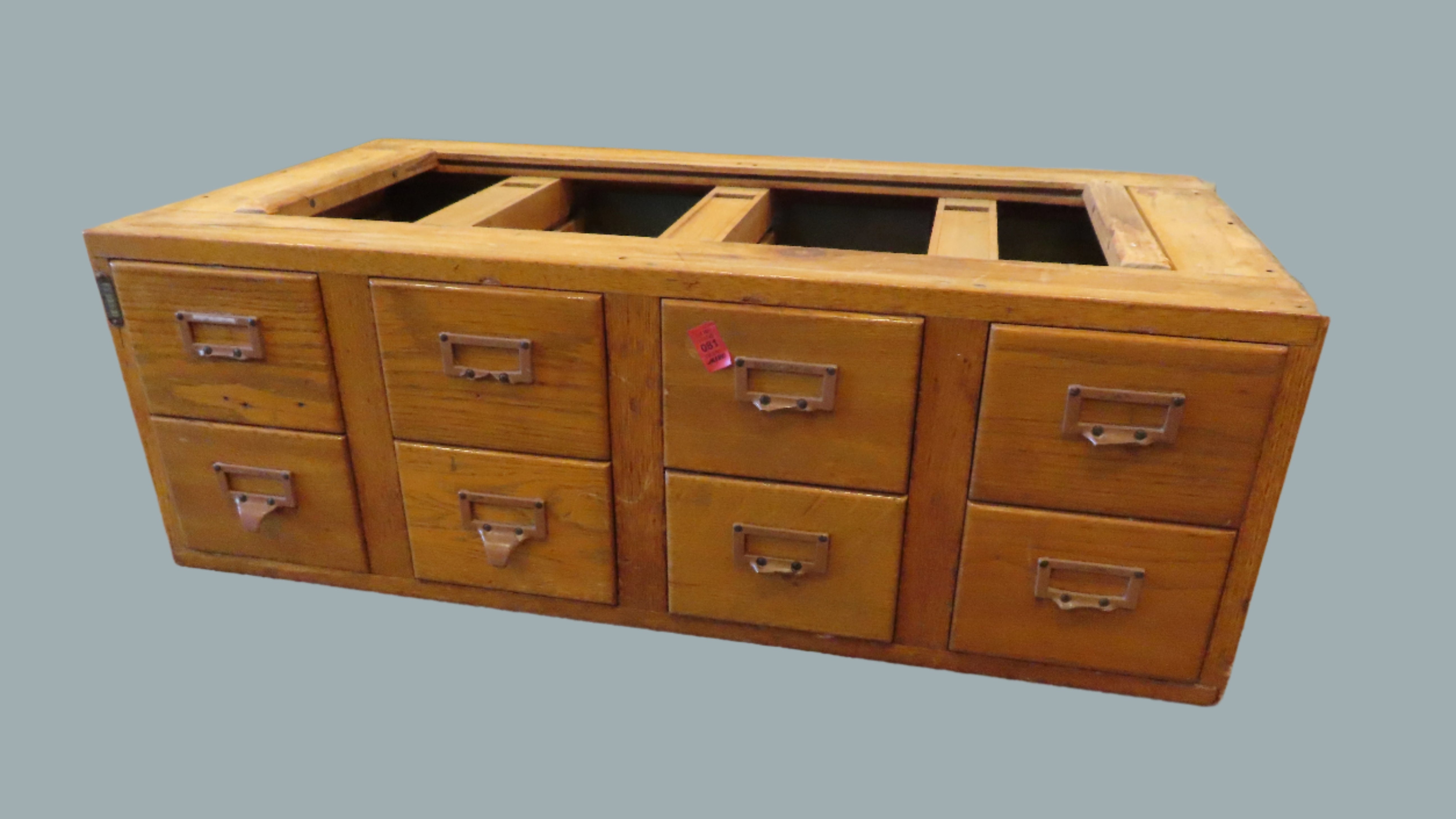 Very cool vintage oak library card filing cabinet. 8 drawers in total, situated in 2 rows of 4. Made to stack with others of it's kind. Super cool for organizing or just for decorating a space with a more vintage aesthetic. Tag on left front side says Inventory Number 163066.