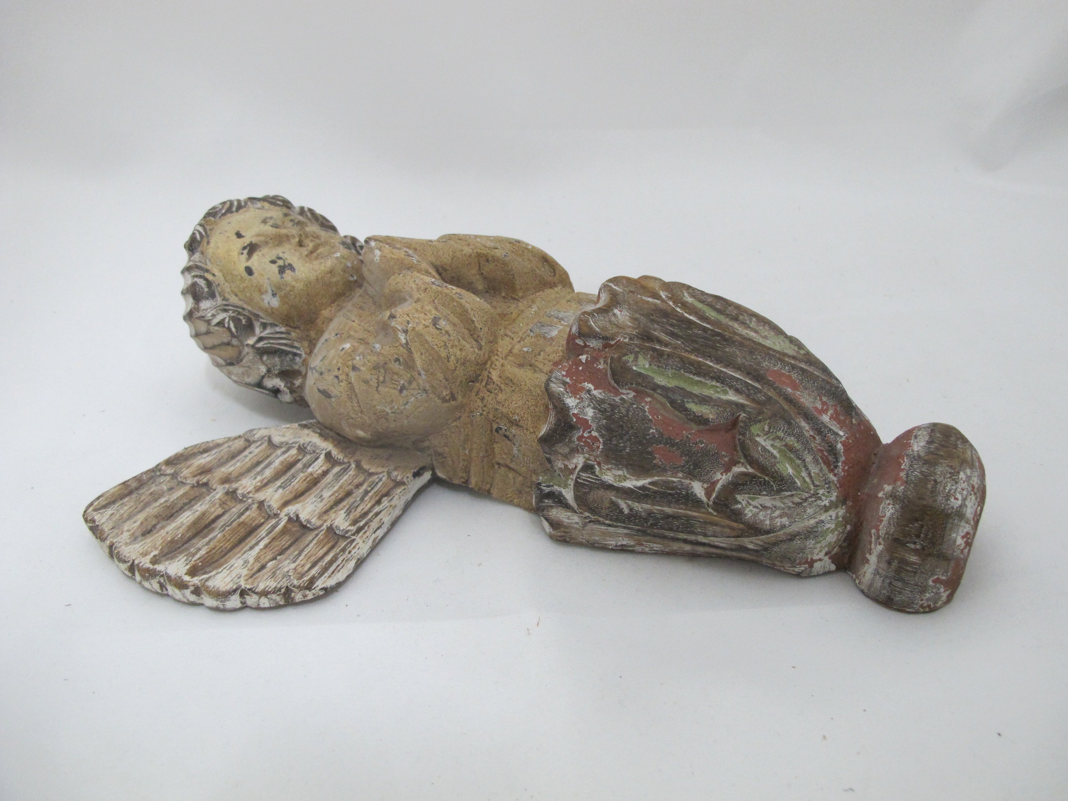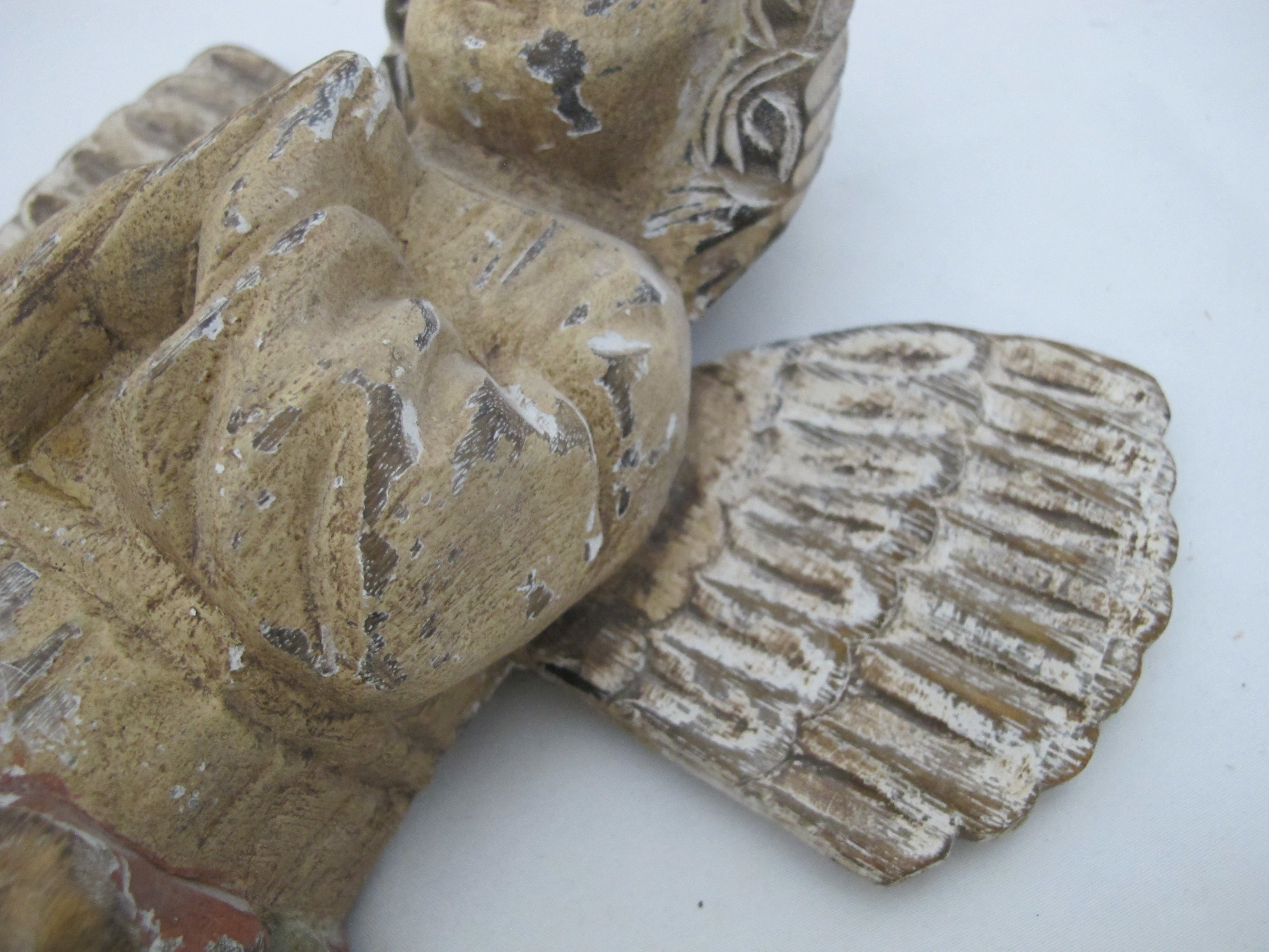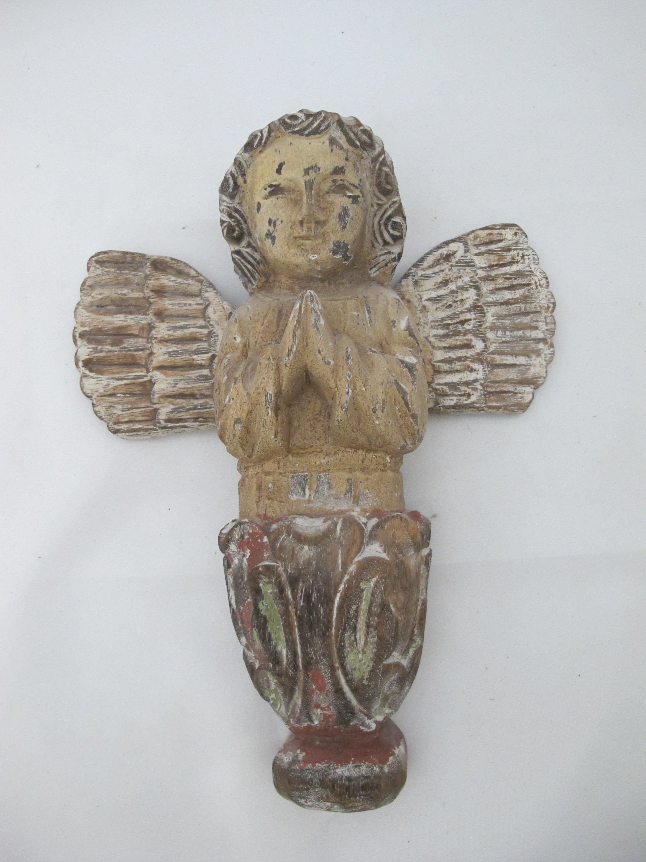 Really sweet hand carved wood polychrome praying angel. Measures 12" x 9 1/2" x 3 1/4".