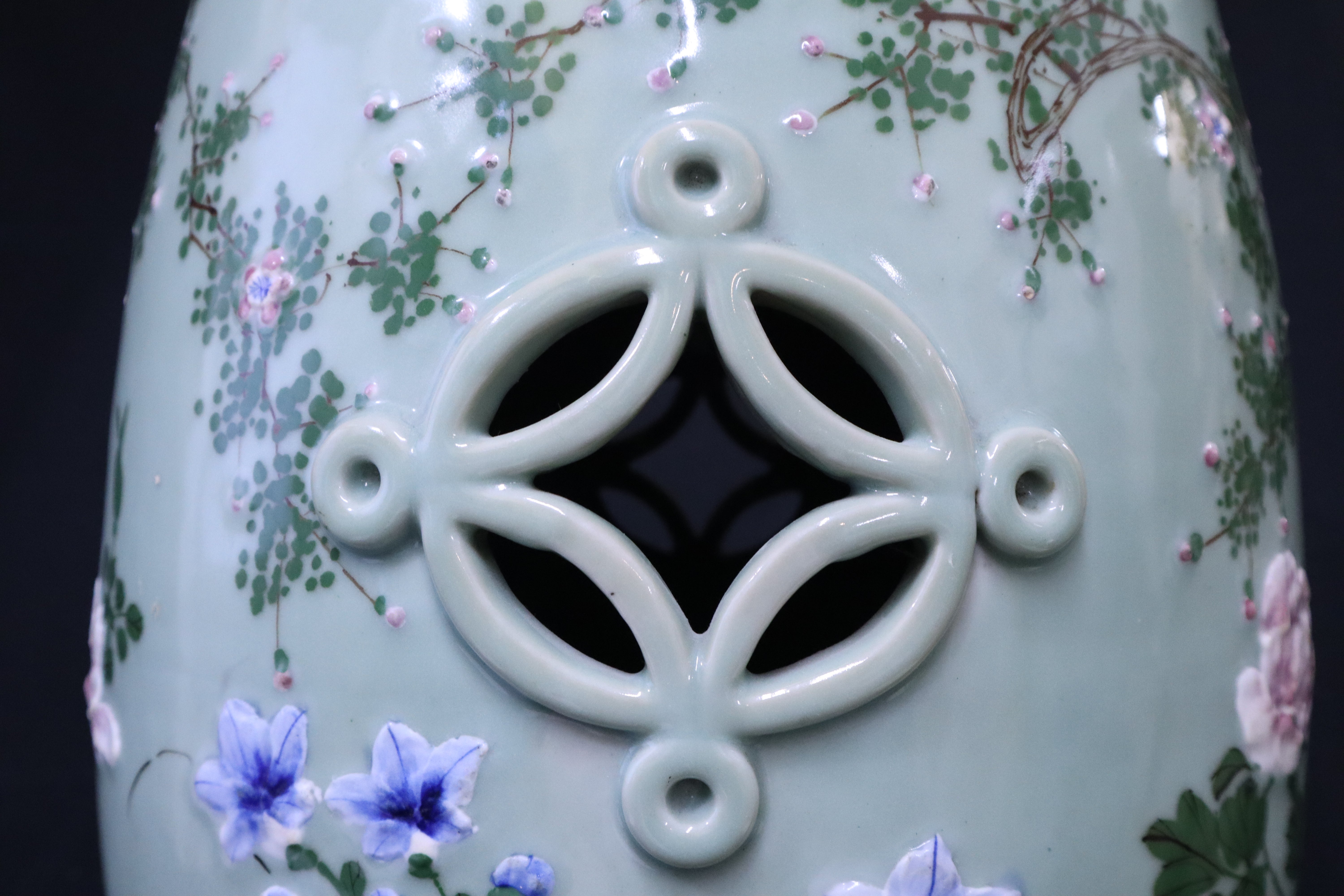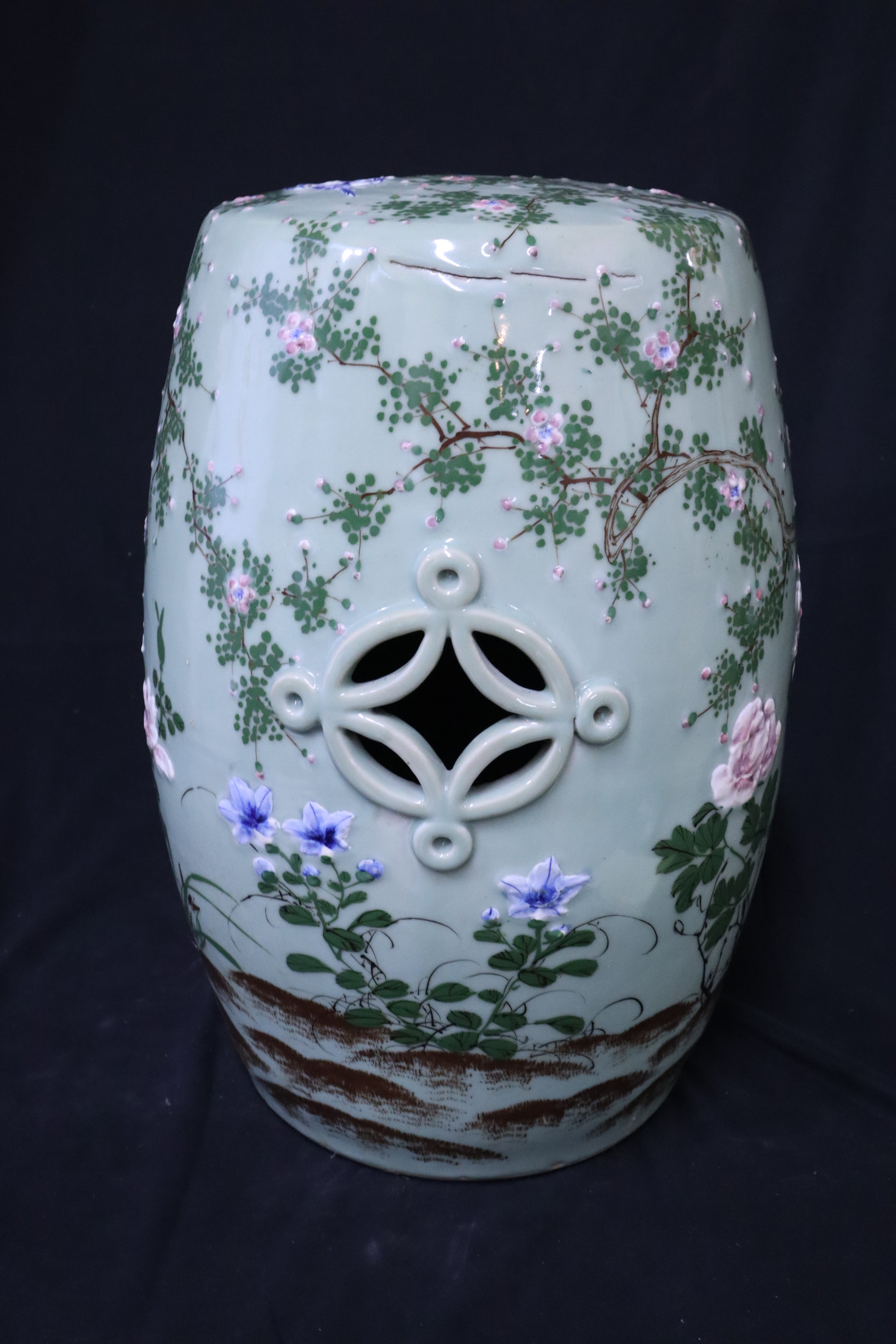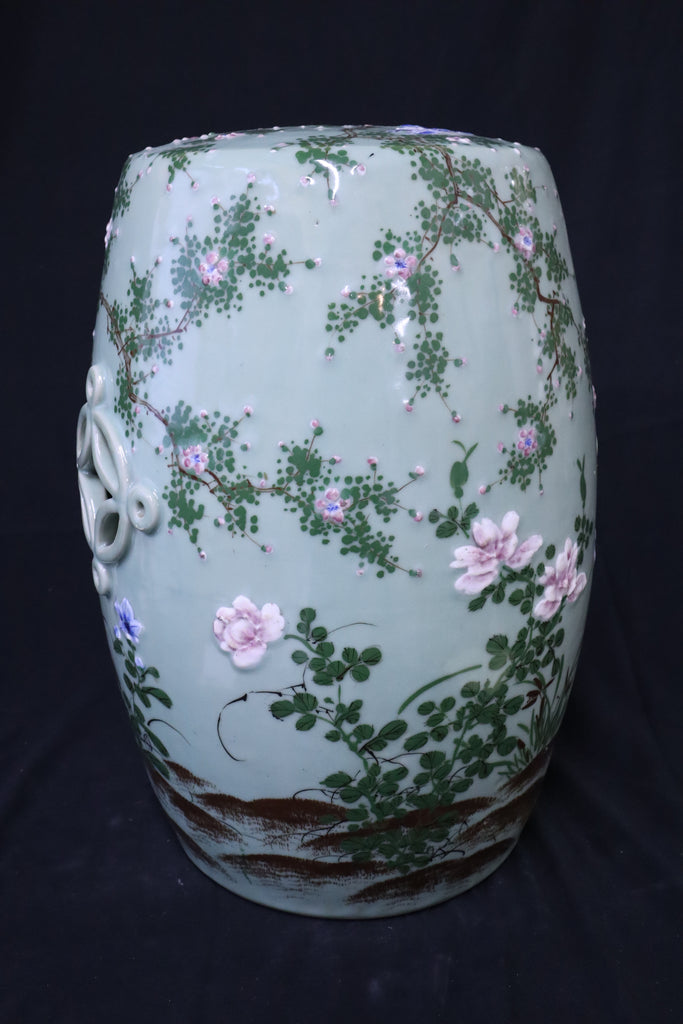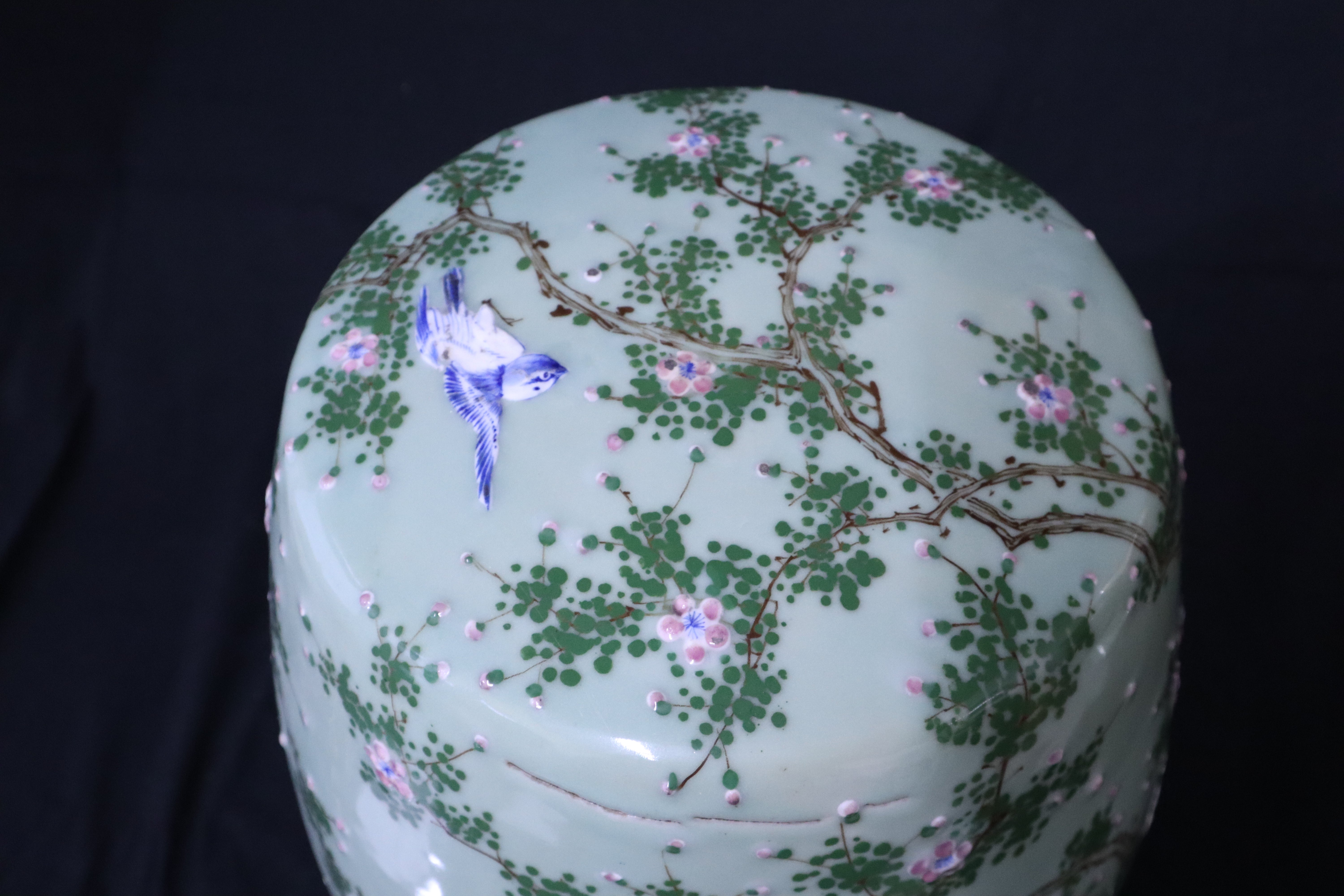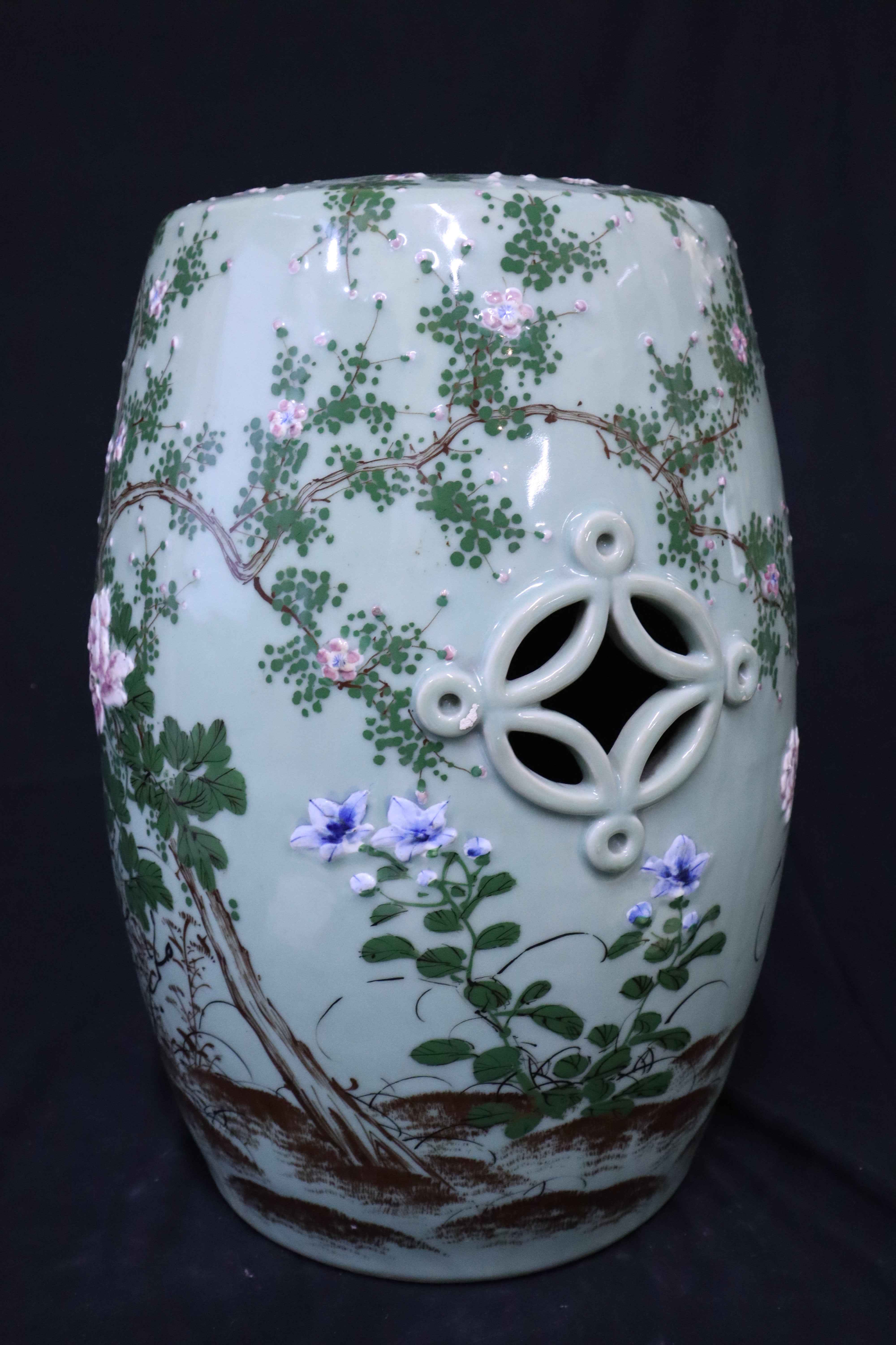 Beautiful Japanese Celadon Garden Stool with Tree Branches, Flowers & Bird