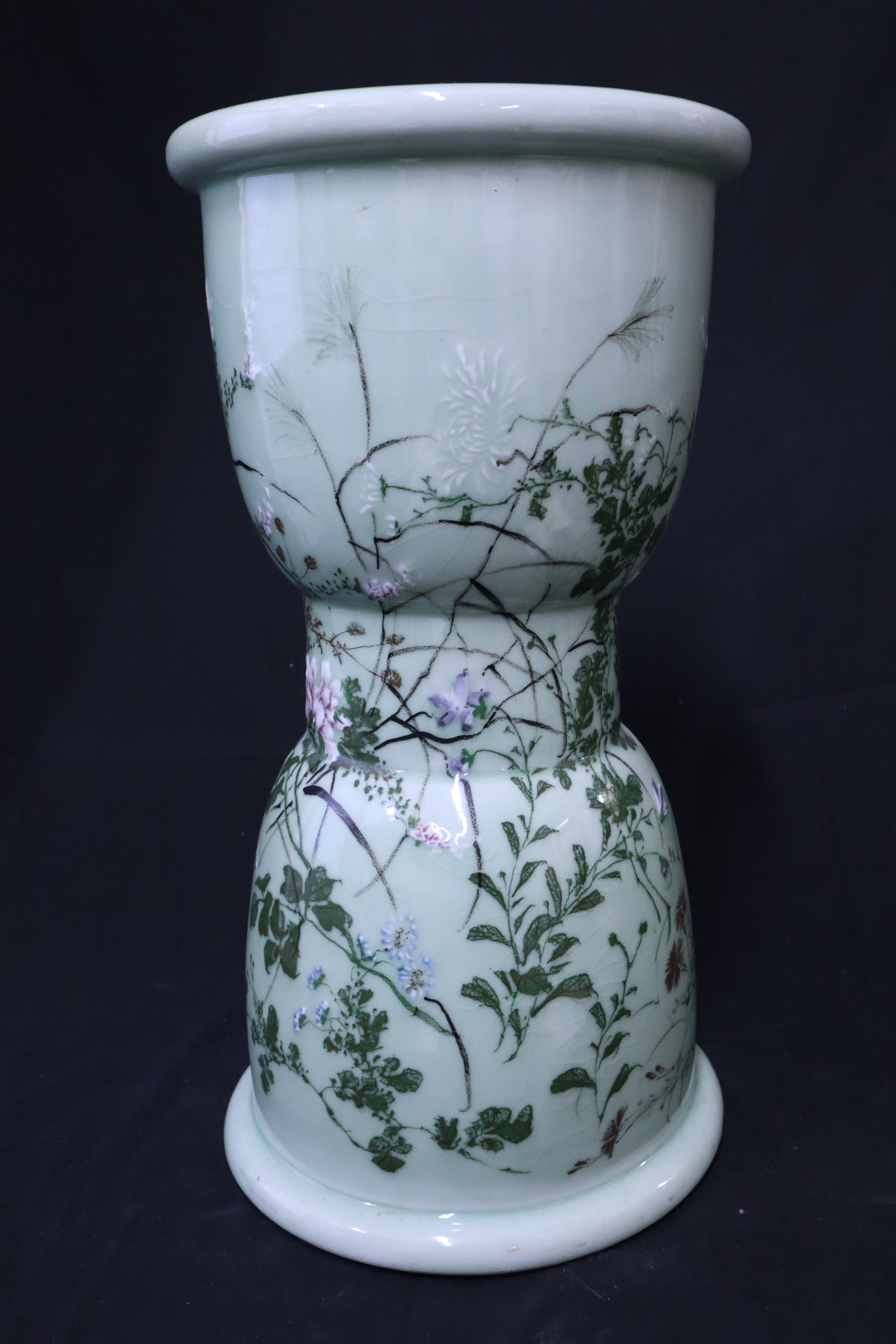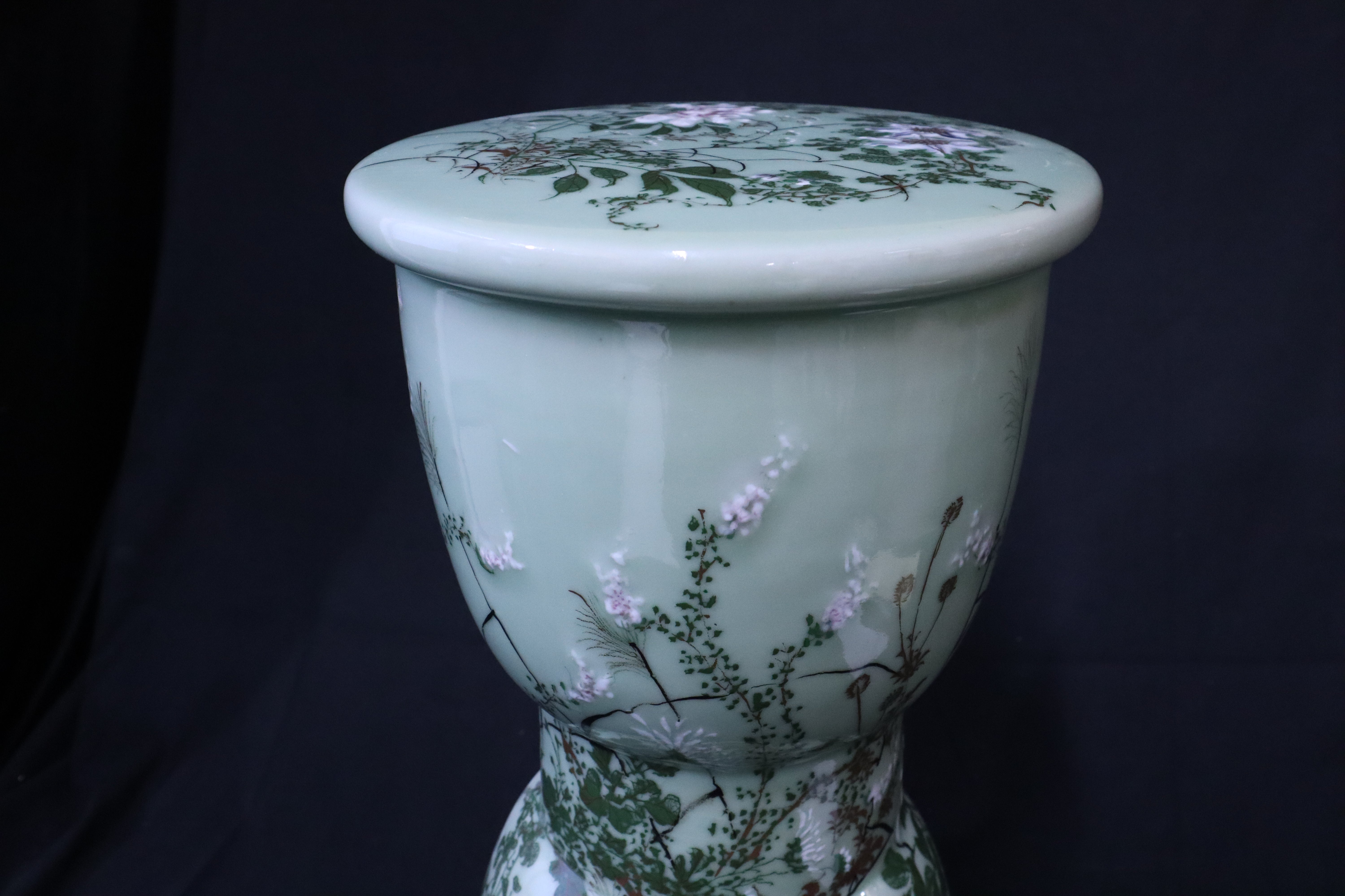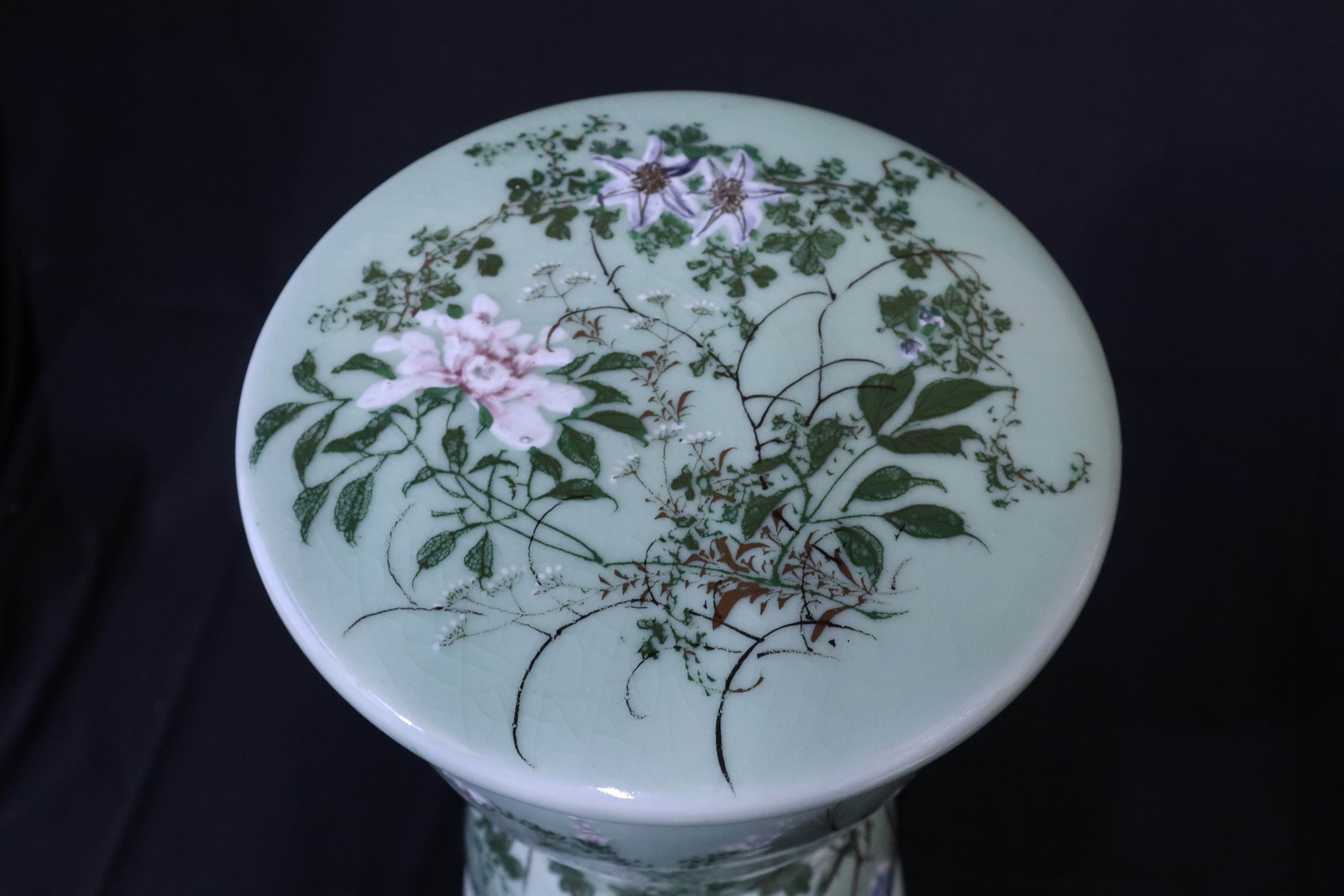 Beautiful Japanese Celadon Hour Glass Garden Stool with Tree Branches & Passion Fruit Flowers