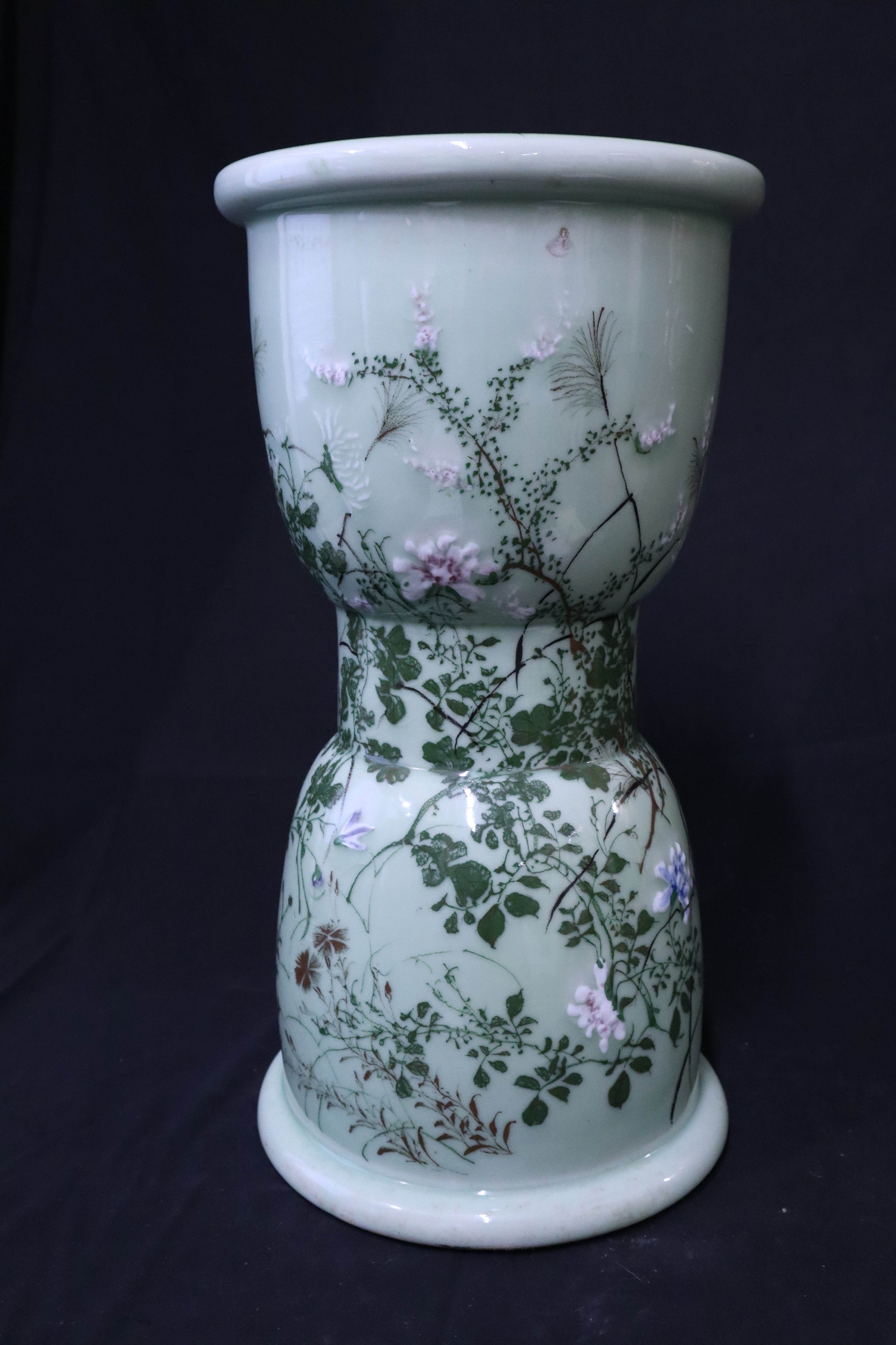 Beautiful and uniquely shaped vintage Japanese celadon garden stool. Light blue background decorated with tree branches with pink and blue flowers growing off them. Passionfruit flower blooms are included on the top face. This stool has a fun hour glass shape, the middle is tapered in while the top of the stool has a drum like appearance.