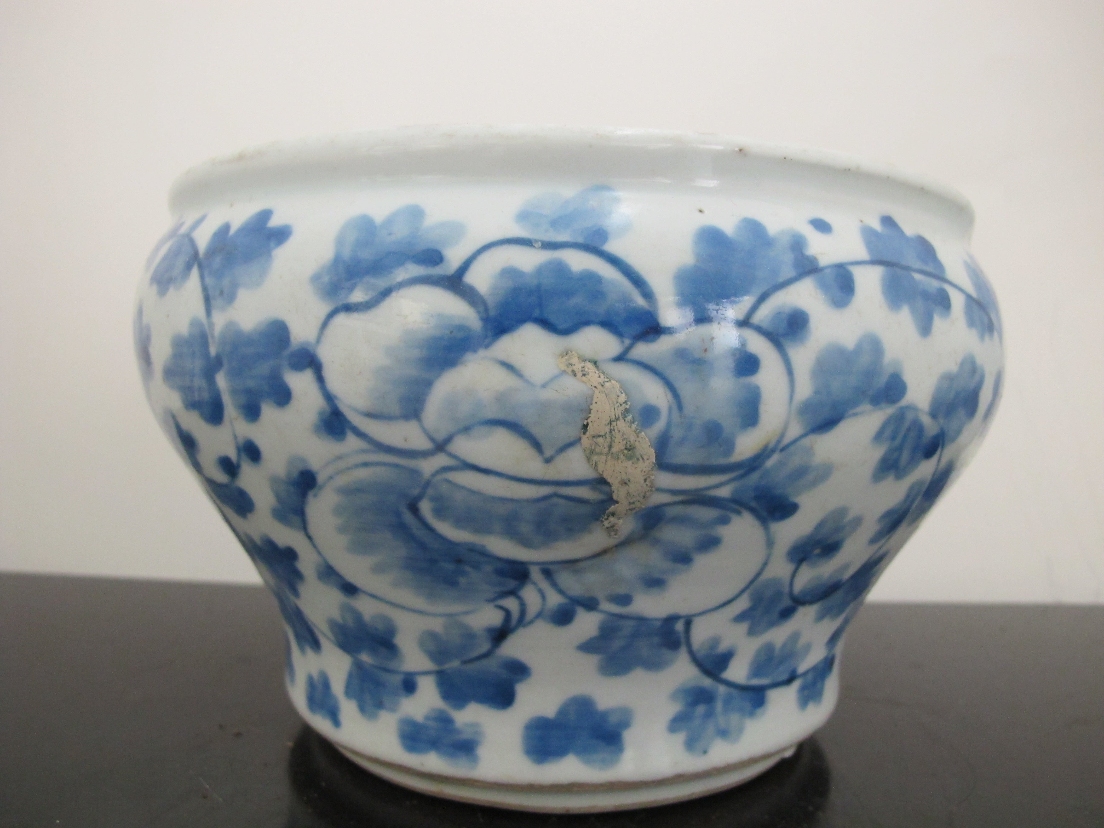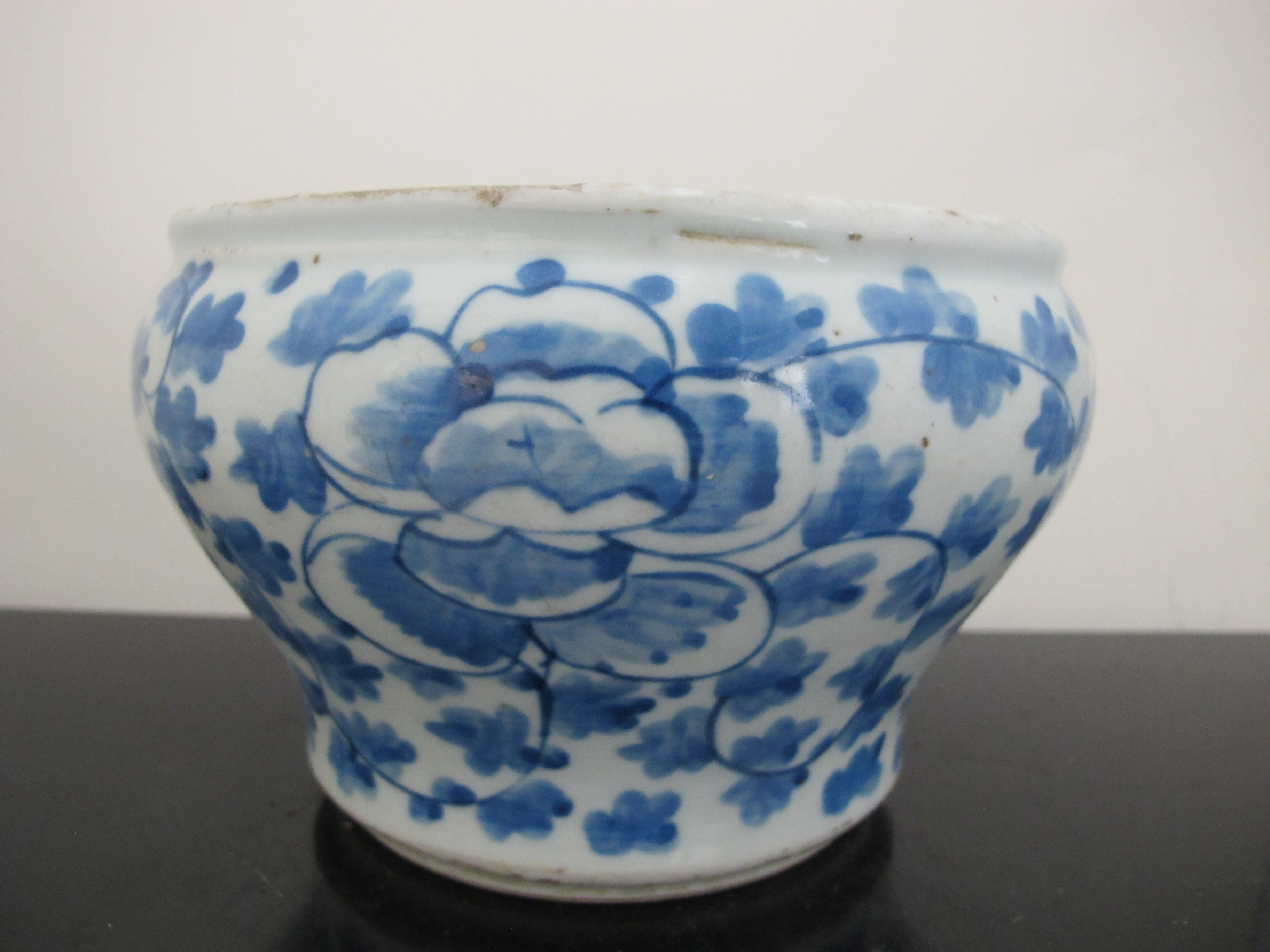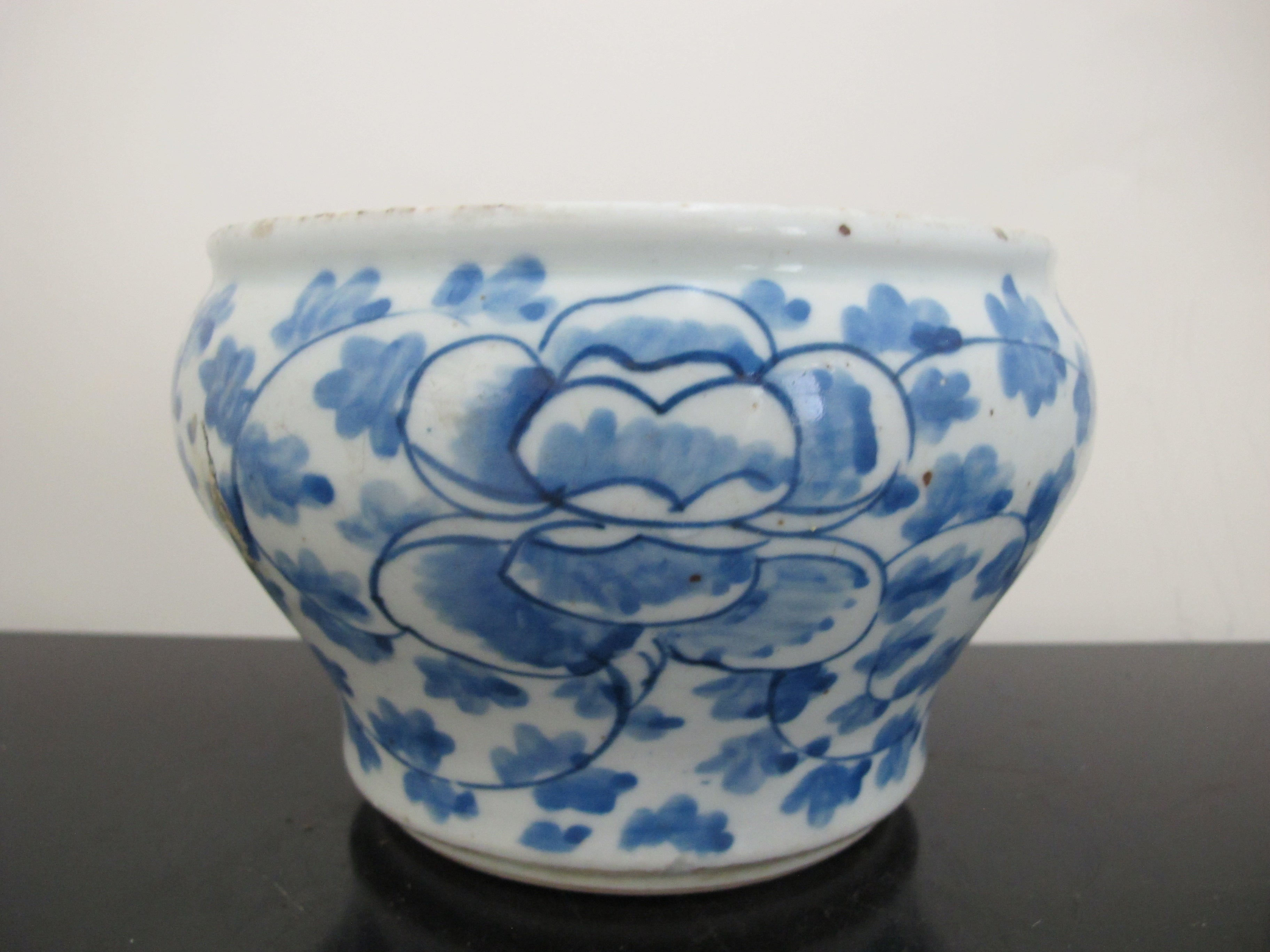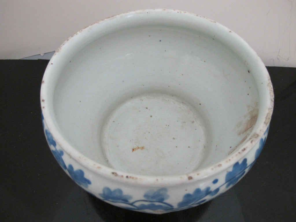 Antique, 19th century Chinese cache pot. White porcelain with blue scrolling peonies design. Good condition, showing some repairs where you may see white and wear at rim, all as photographed.