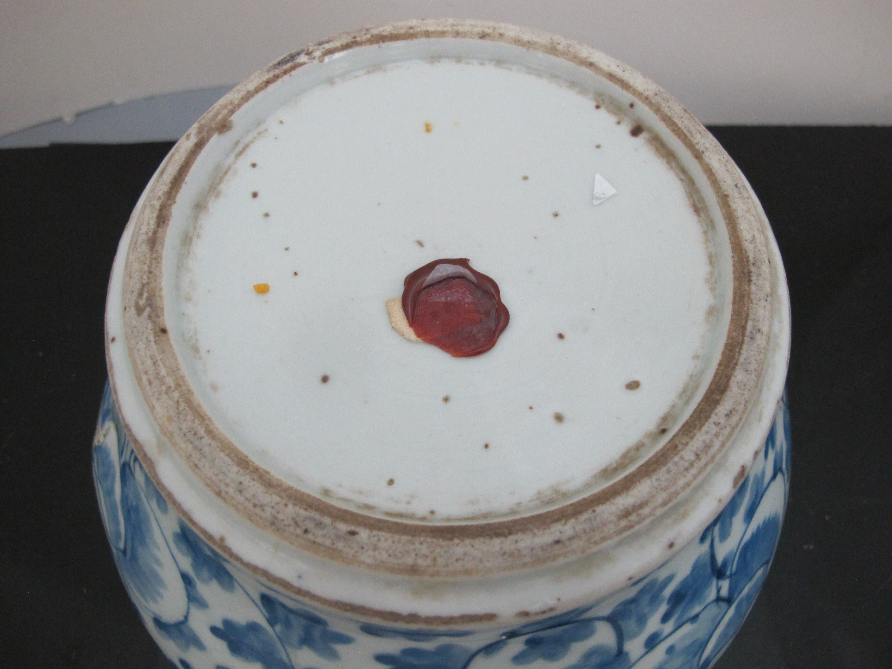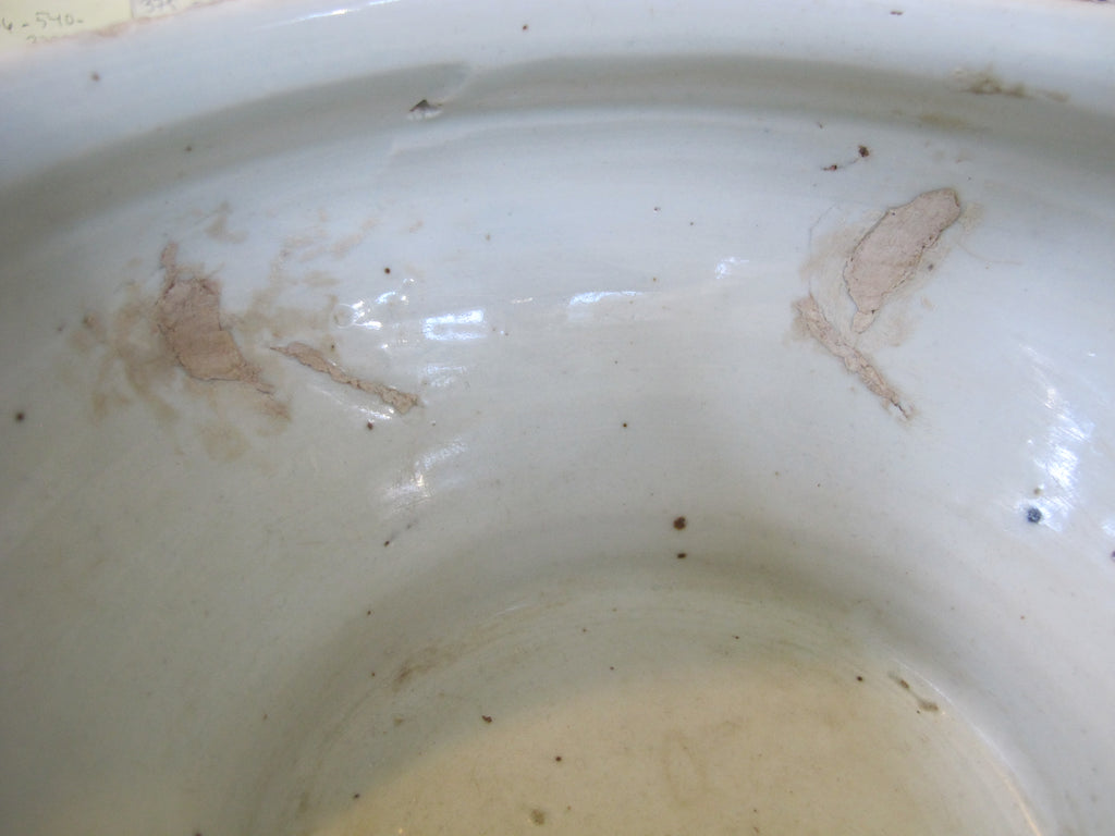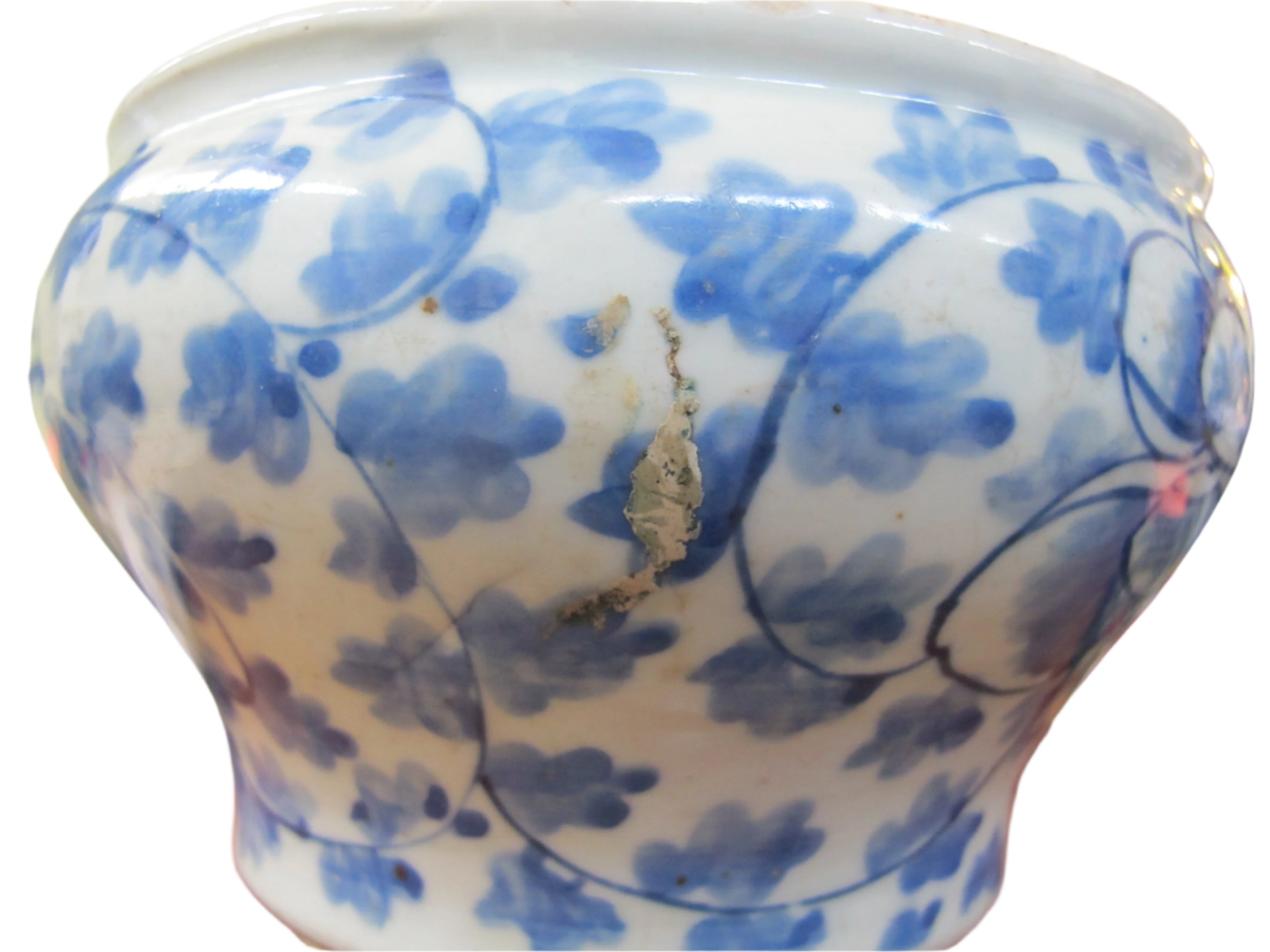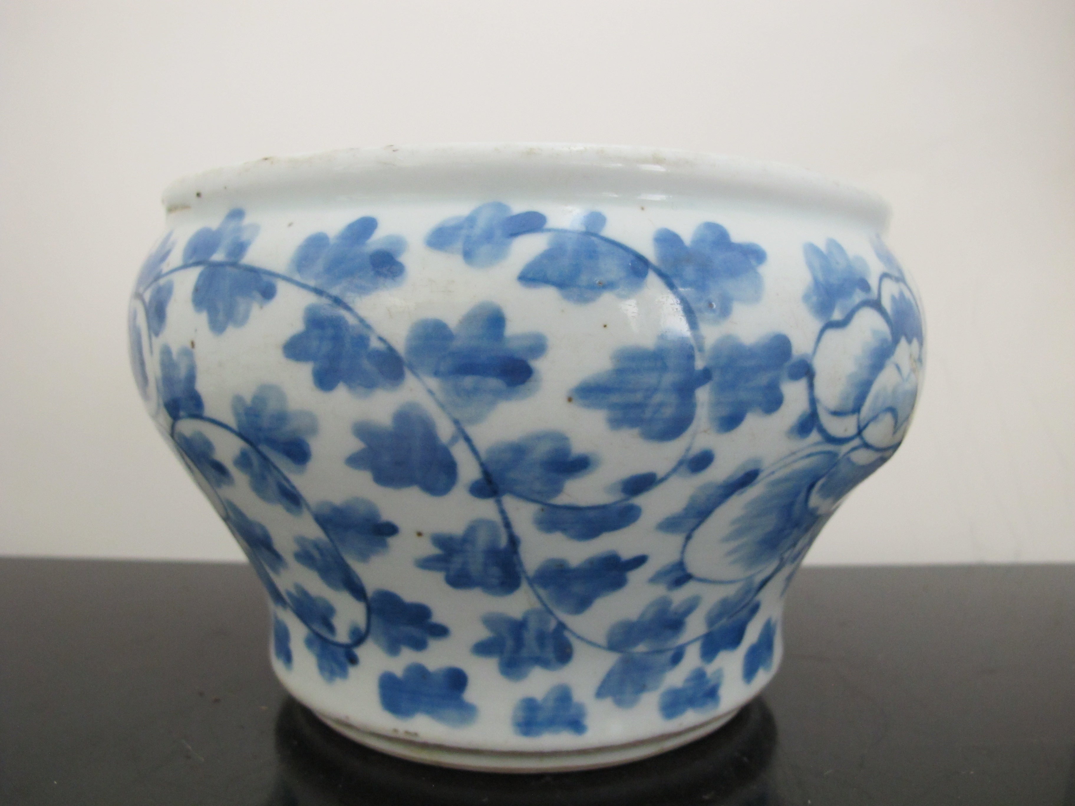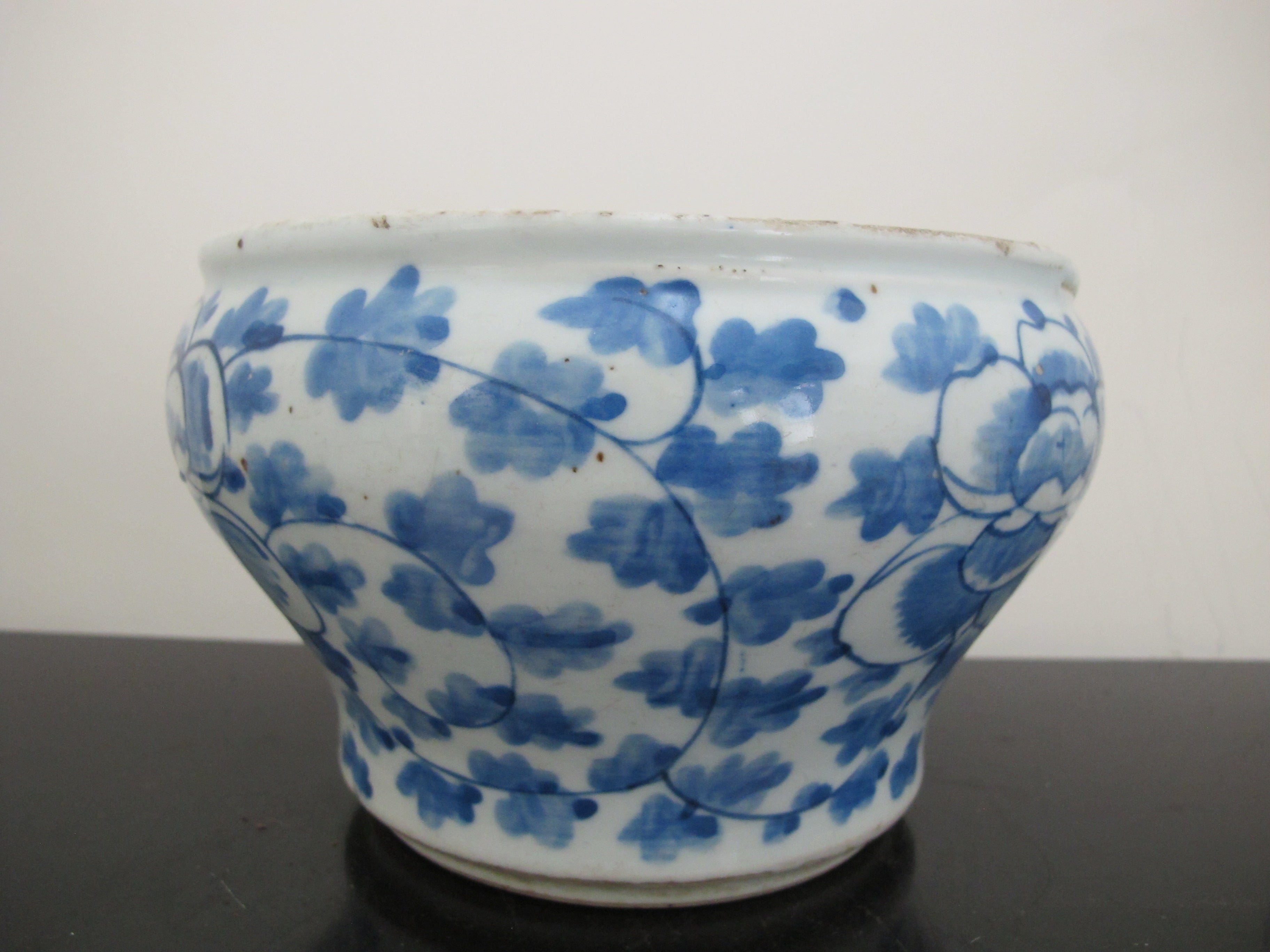 Antique, 19th century Chinese cache pot. White porcelain with blue scrolling peonies design. Good condition, showing some repairs where you may see white and wear at rim, all as photographed.