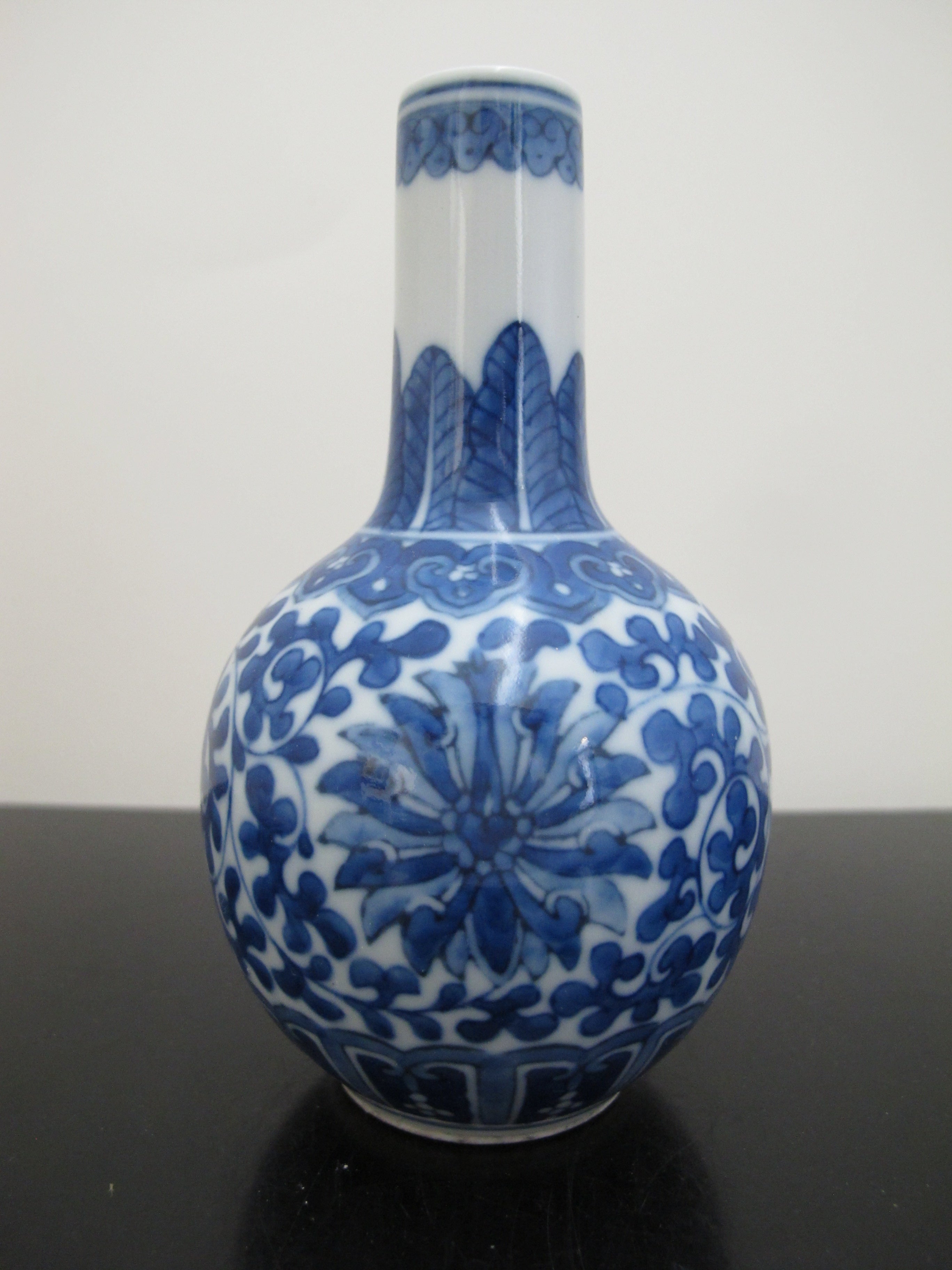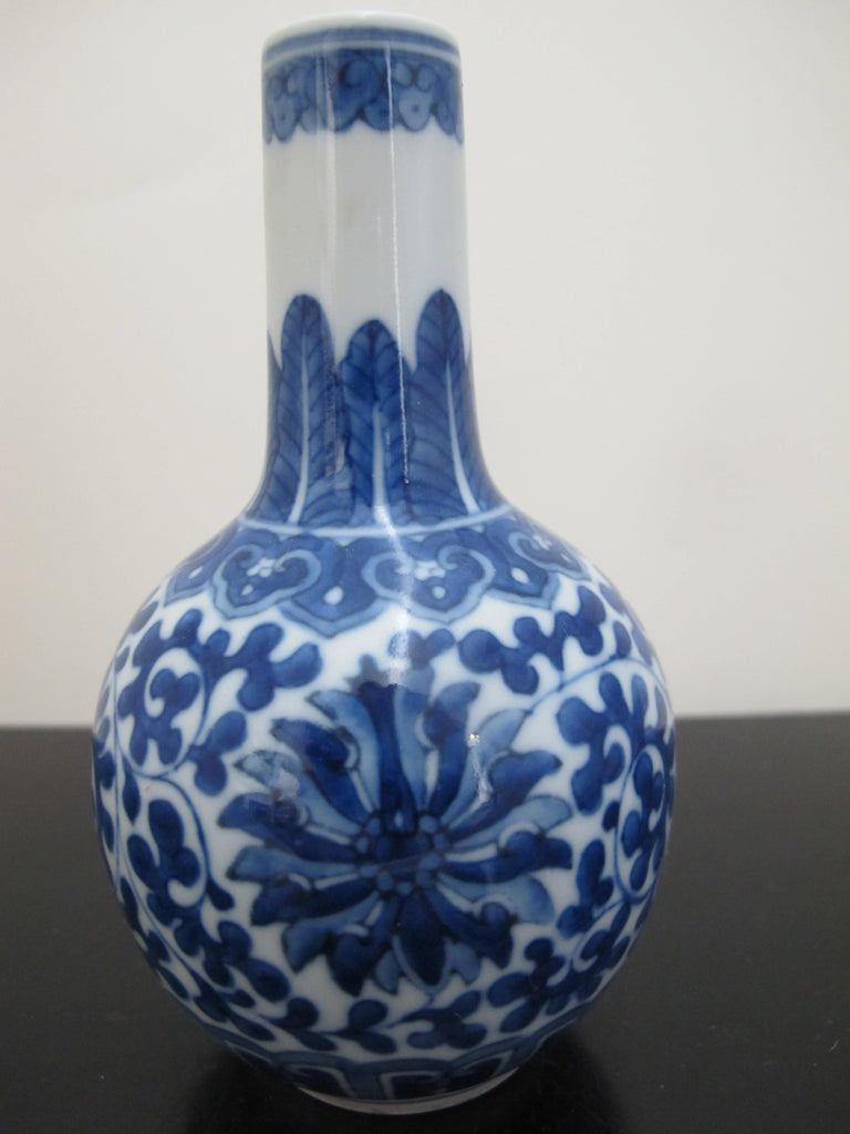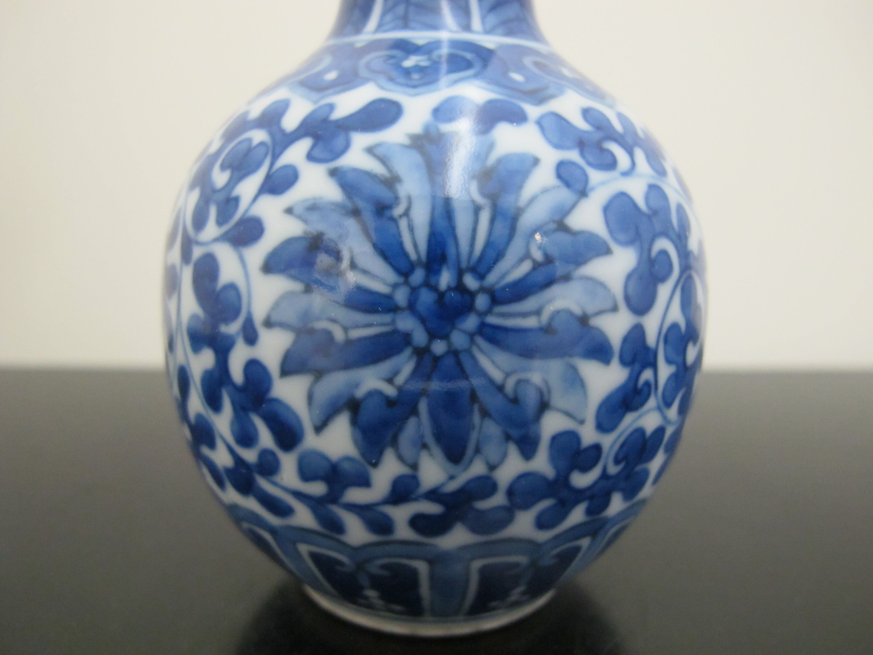 Sweet little Chinese bud vase. Glaze white porcelain with blue lotus flower design. Measures 5" tall x 2 1/2". Excellent condition, no chips, cracks, or repairs.