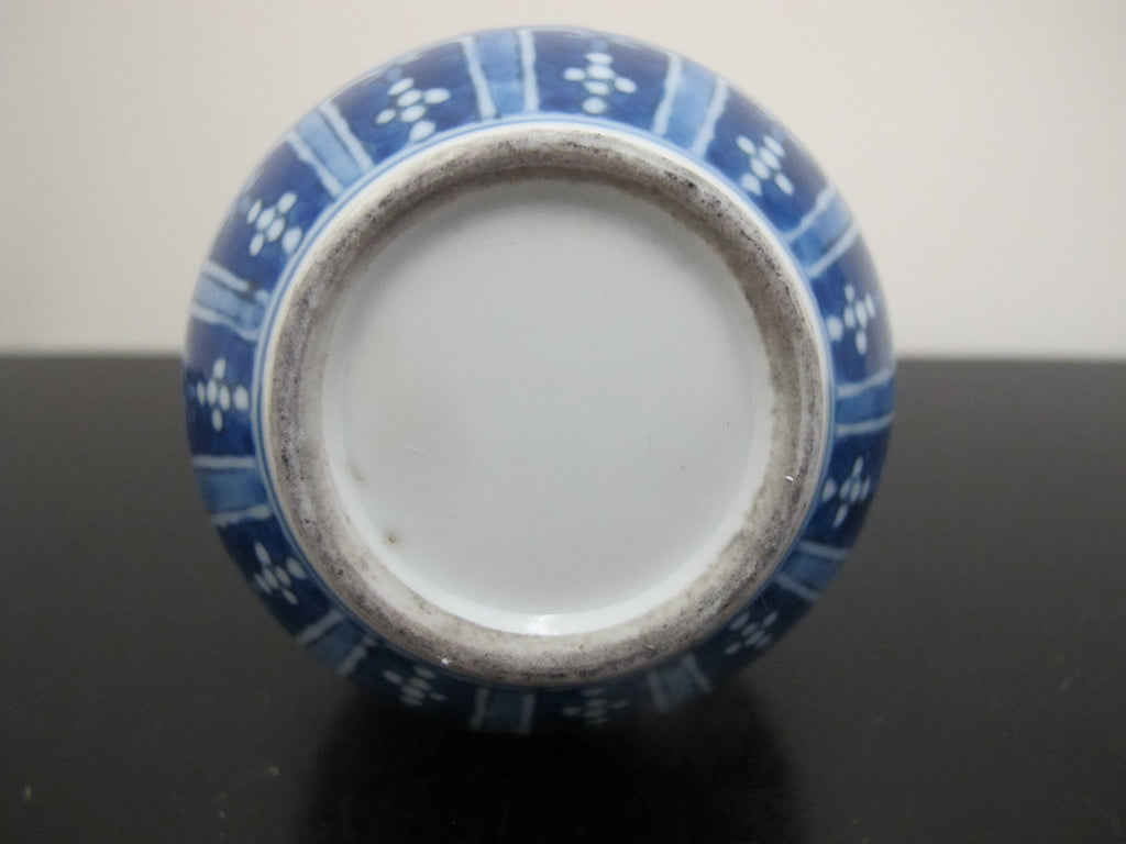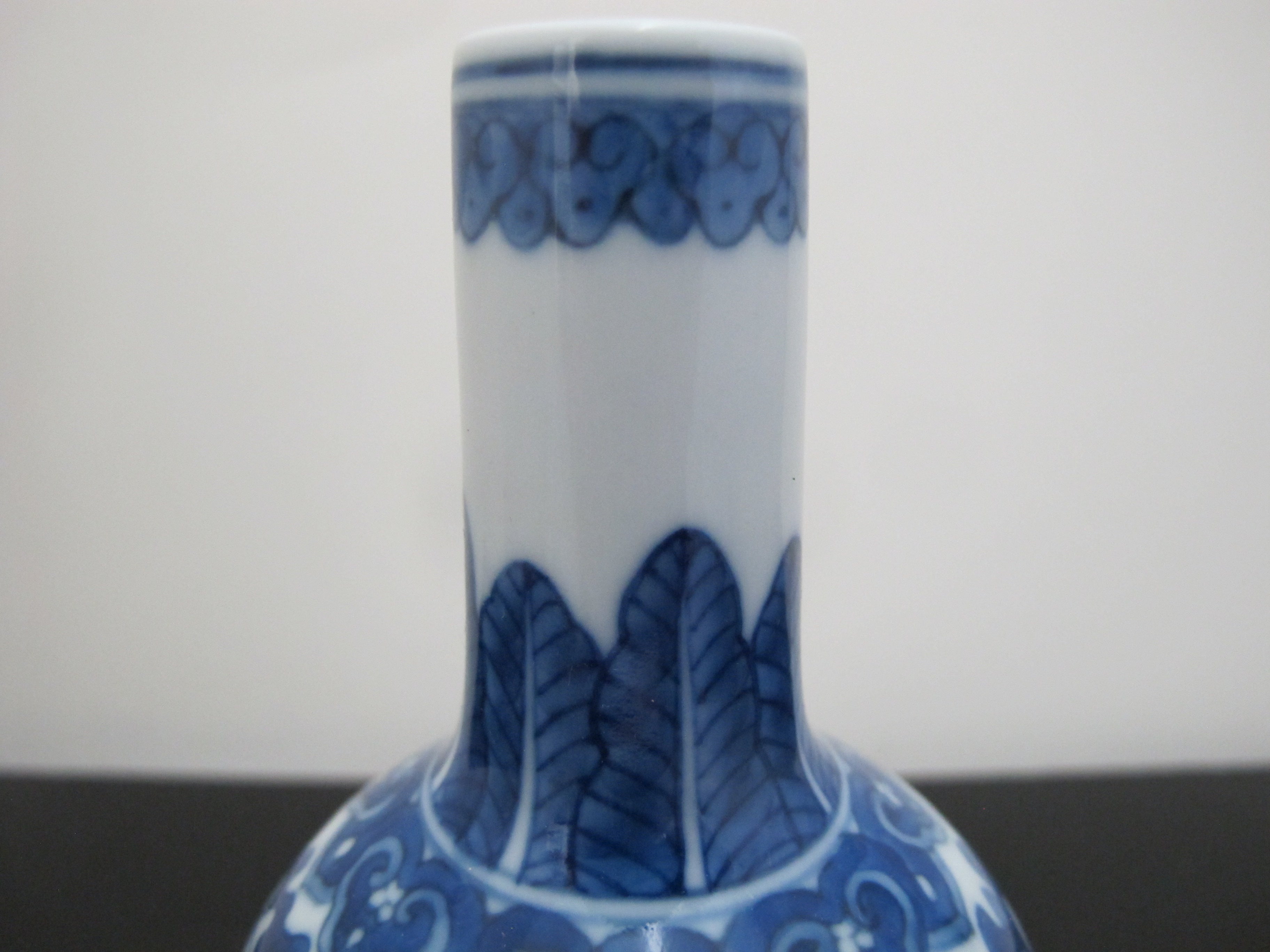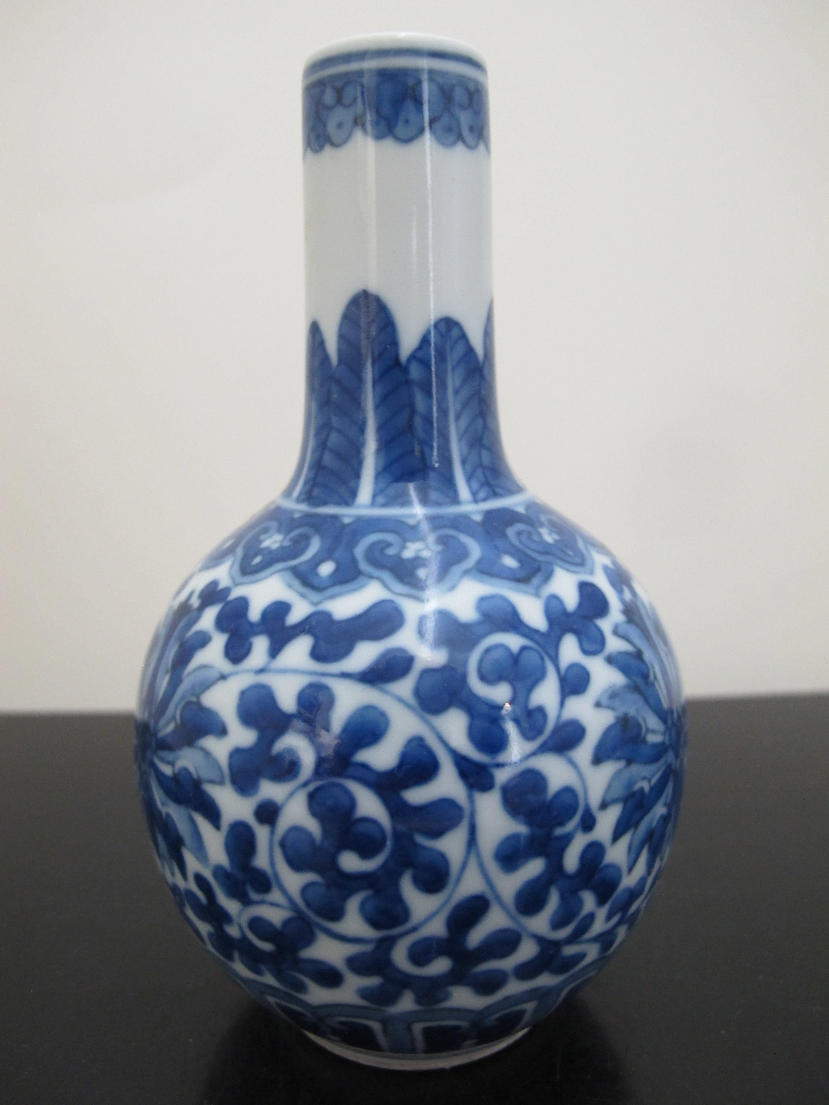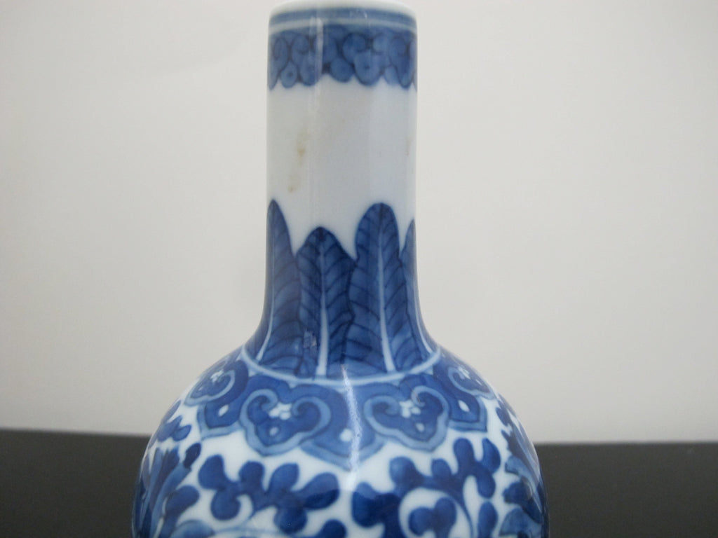 Sweet little Chinese bud vase. Glaze white porcelain with blue lotus flower design. Measures 5" tall x 2 1/2". Excellent condition, no chips, cracks, or repairs.