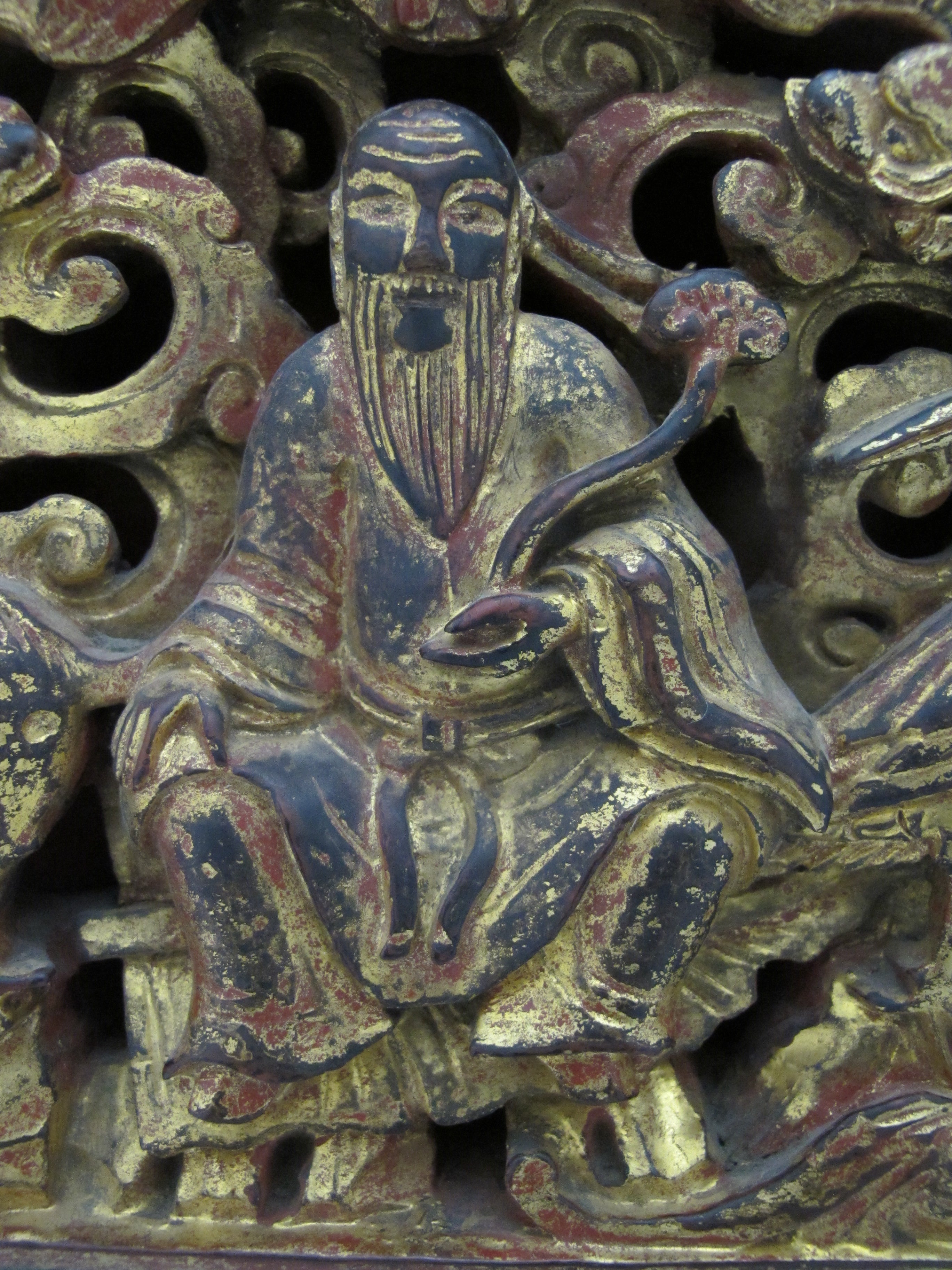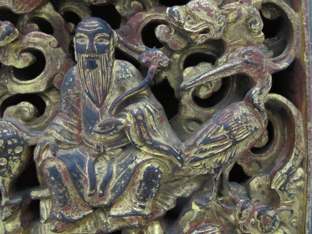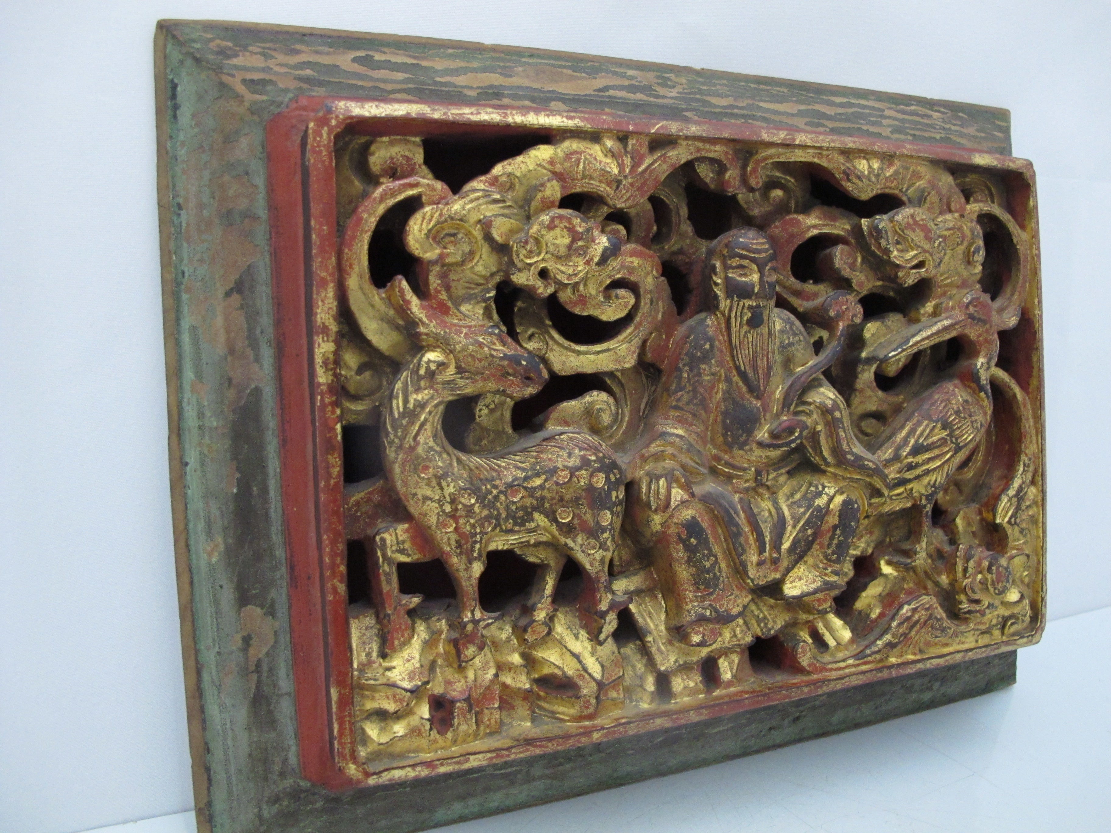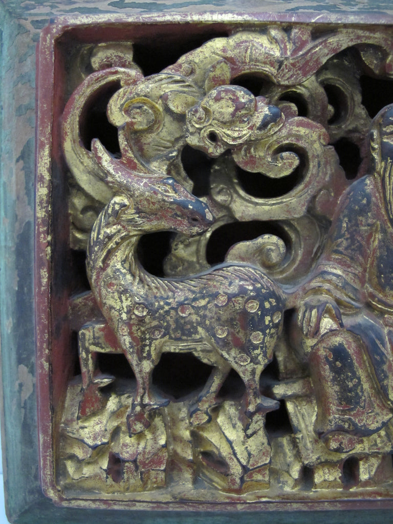 Chinese Qing Dynasty era carved wood panel. Finely carved in high relief with intricate scene showing a seated Immortal with deer on one side and crane on the opposite. There are also griffins in carving to the left and right above his head.