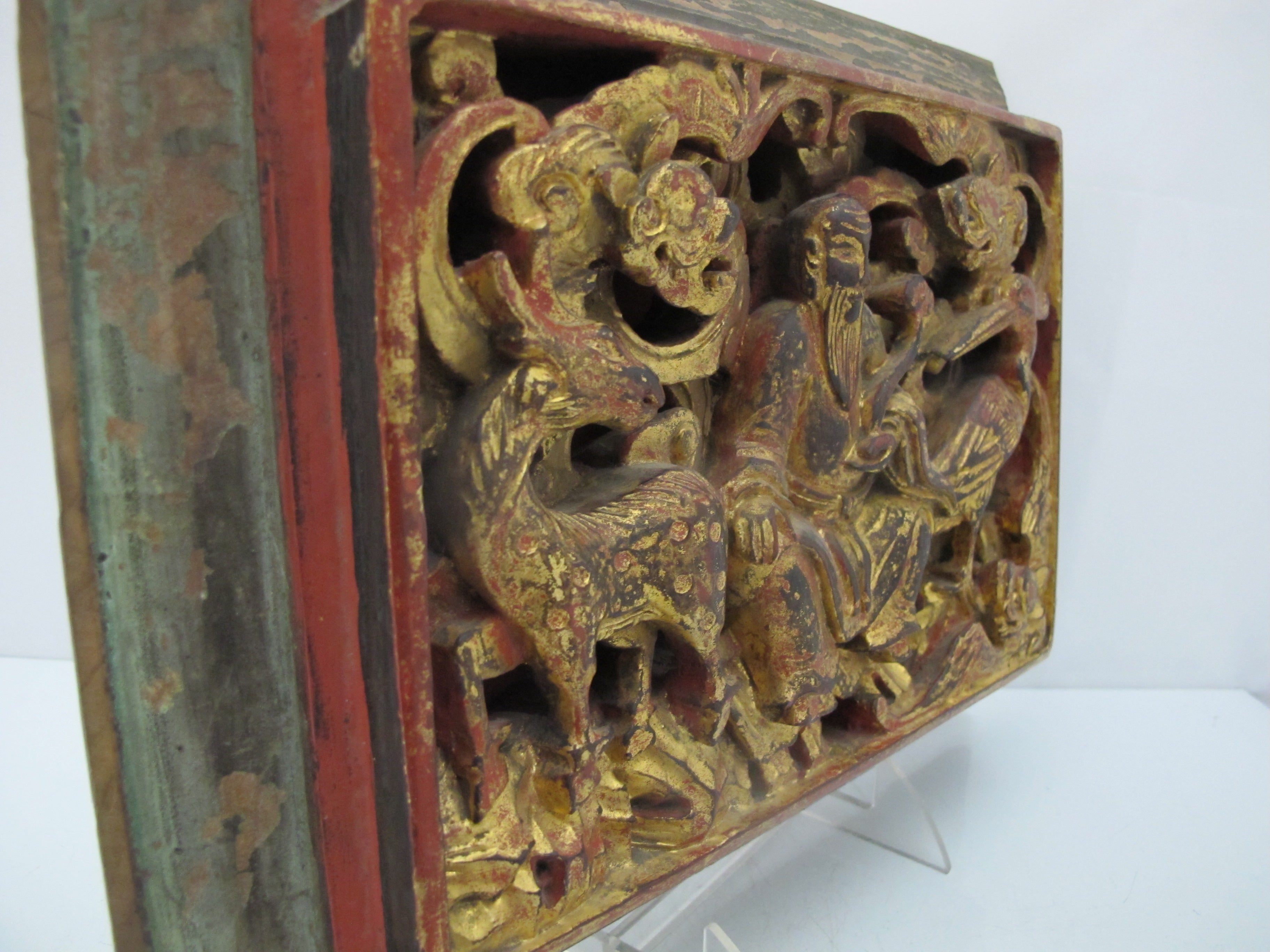 CHINESE Carved Gilt & Red Pierced Wood IMMORTAL with DEER & Crane Wall Art Panel