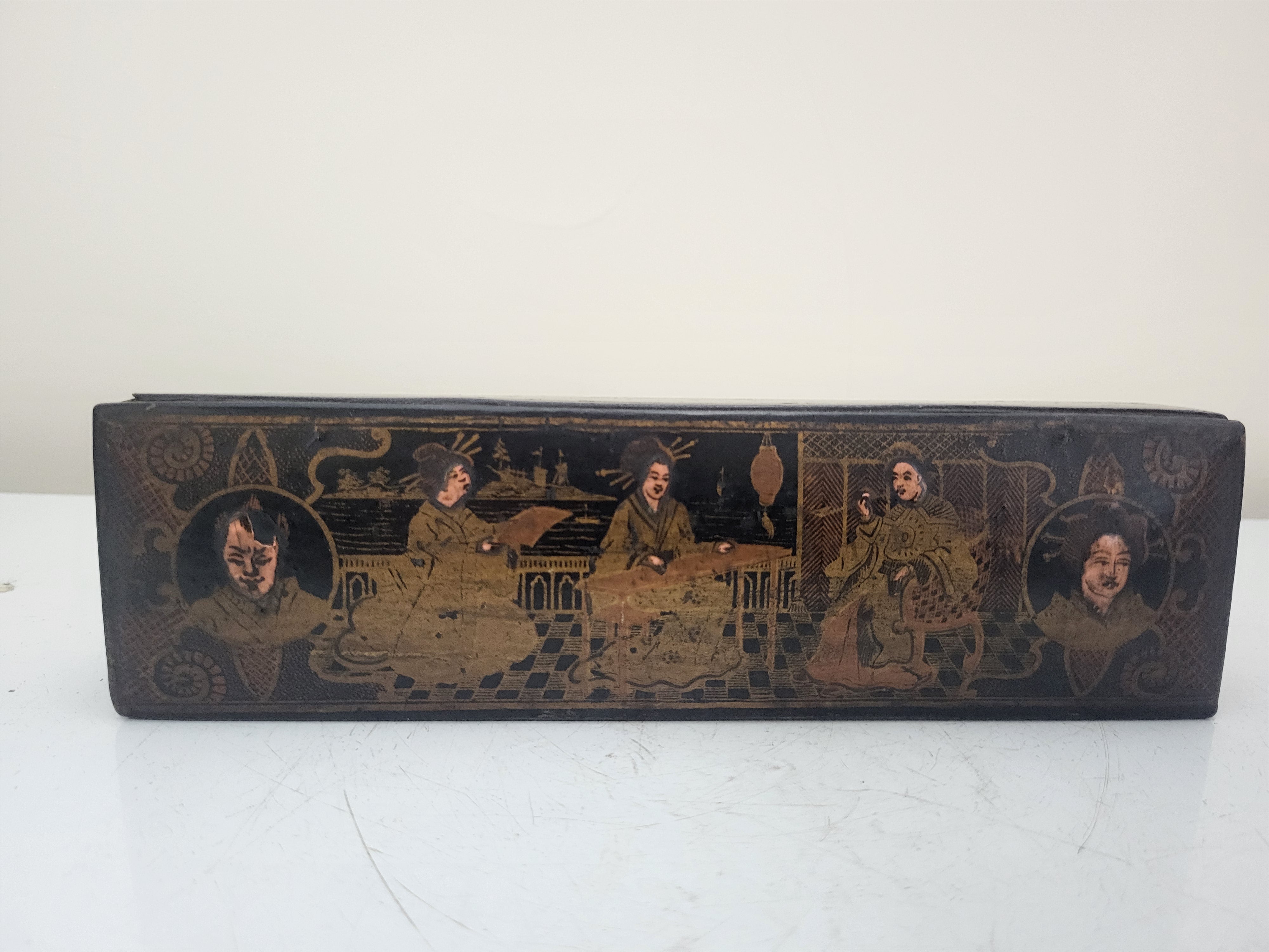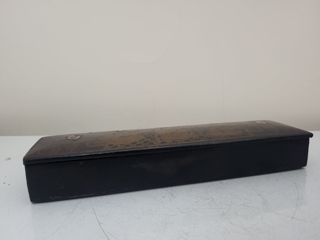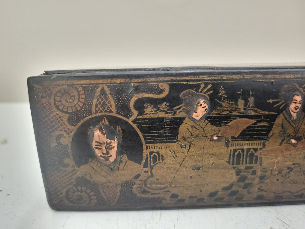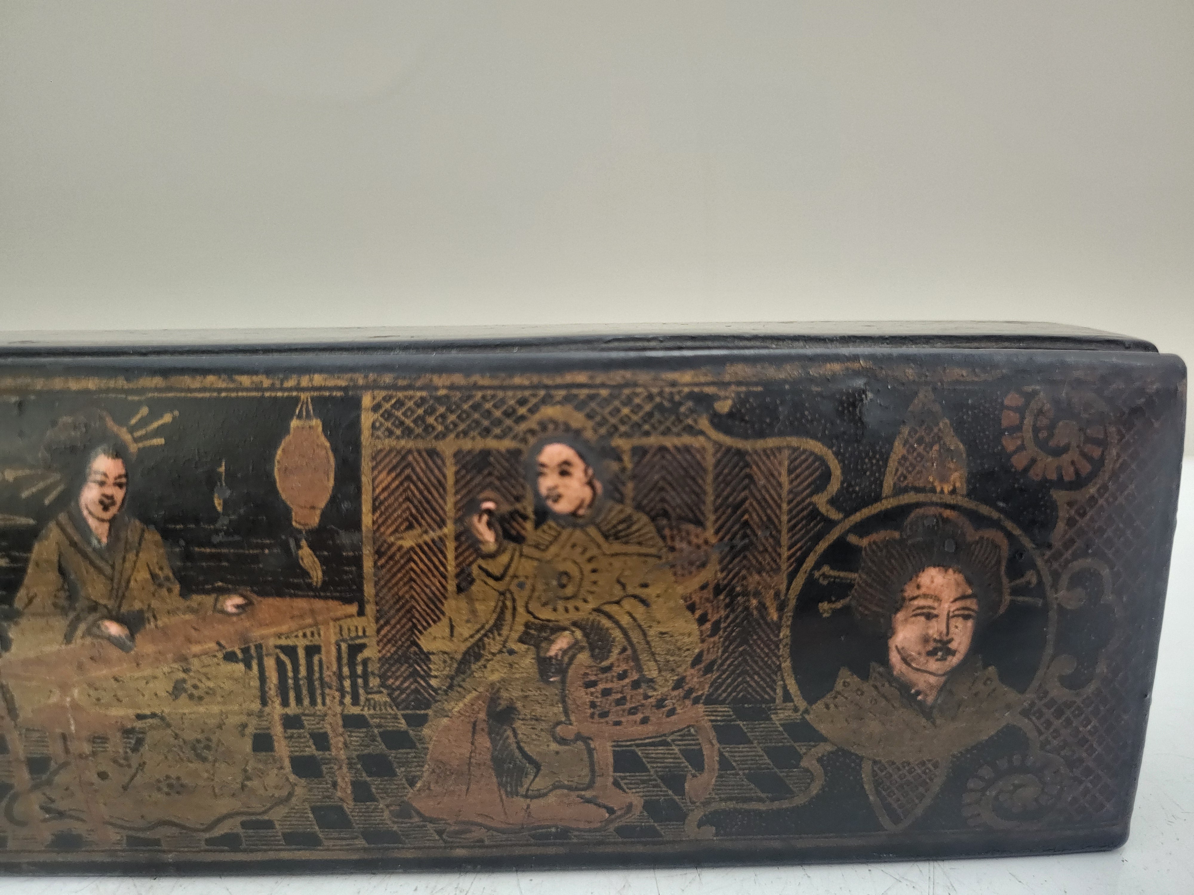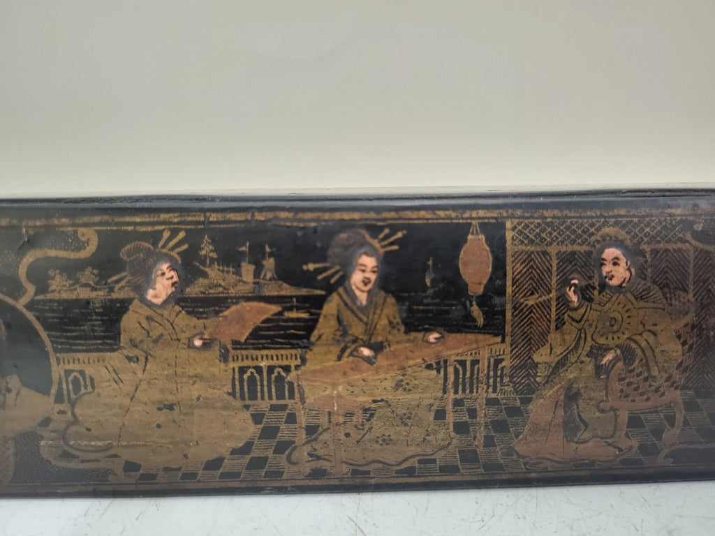 Beautiful antique Chinese calligraphy box. Black lacquered wood with elaborate gilt figural design. Hinged lid opens to 3 compartments for pencils and writing materials. Could be used for small trinkets or jewelry. Elongated box measures 7 3/4" x 2" x 1" tall. Excellent condition.