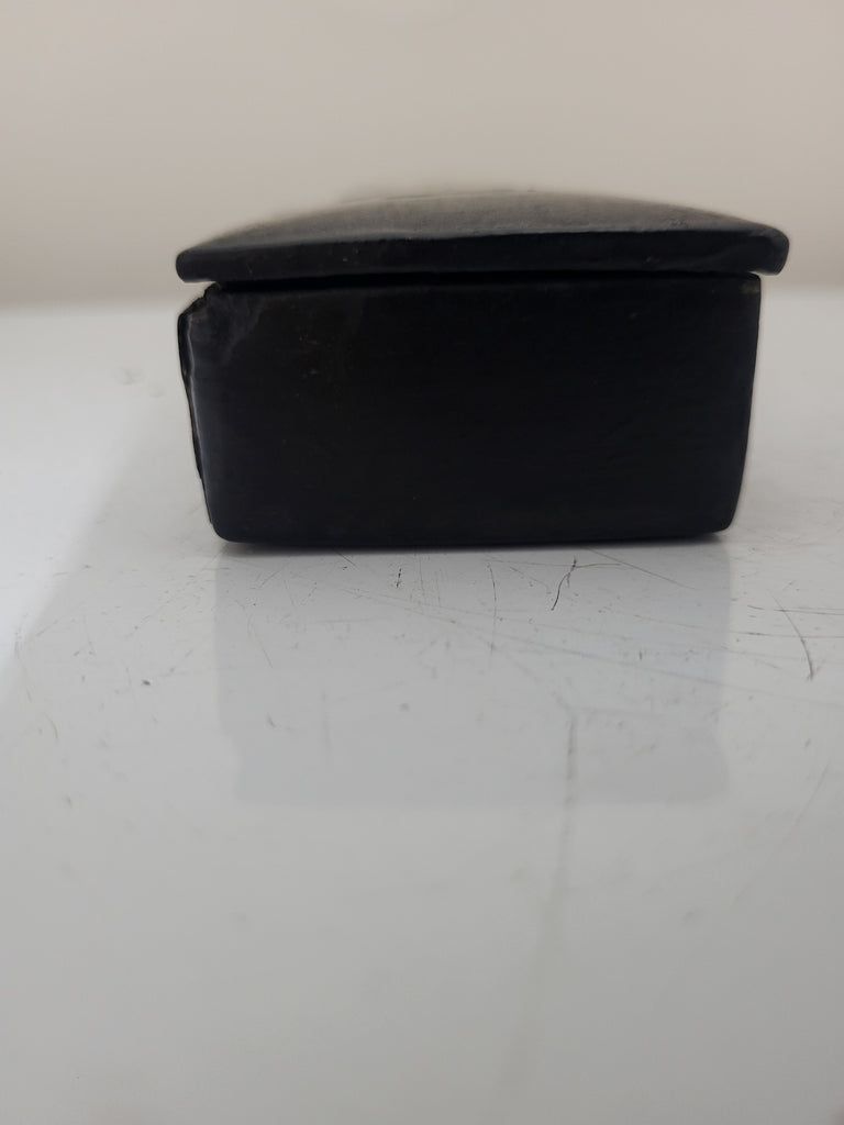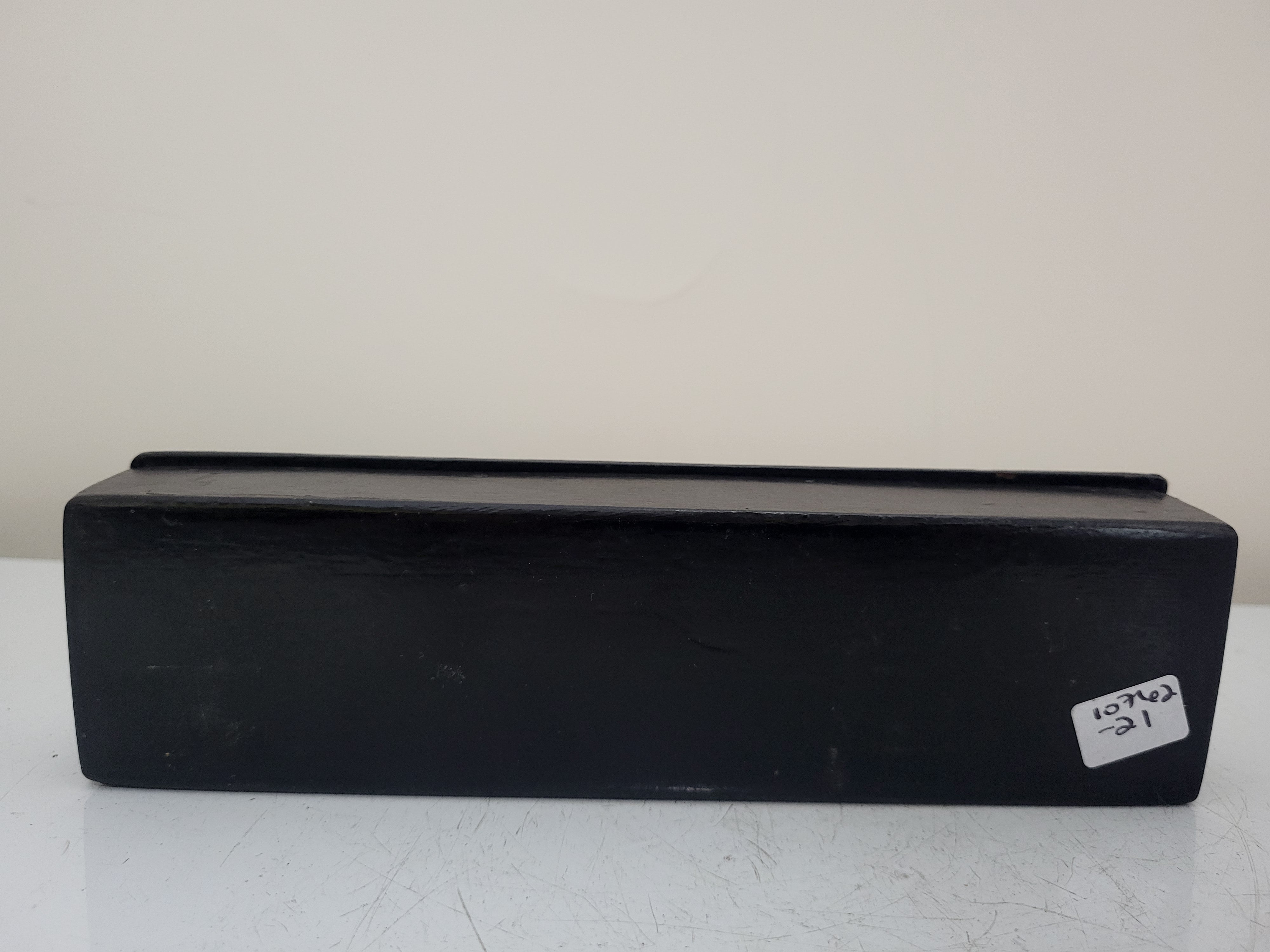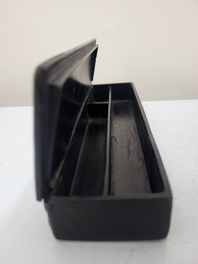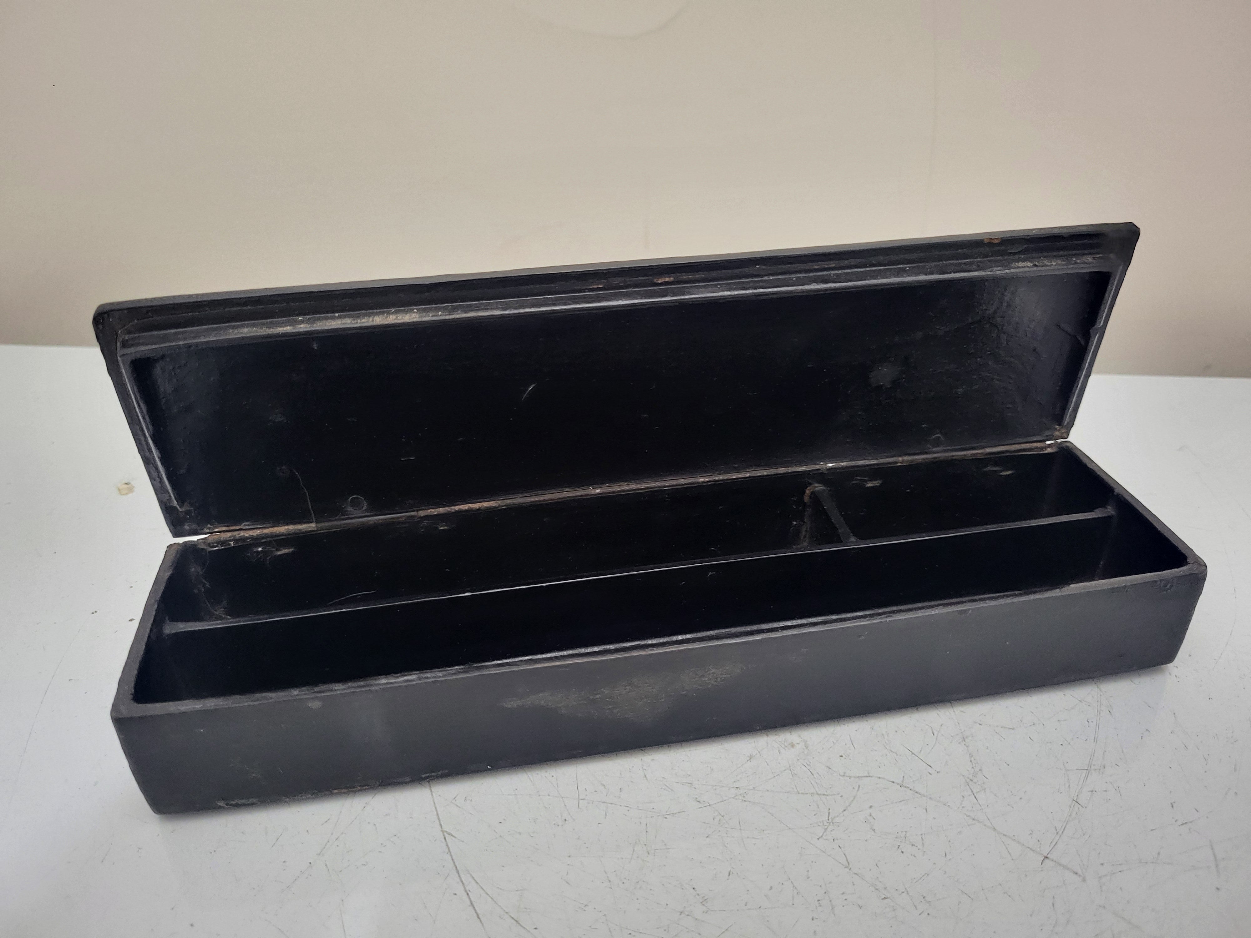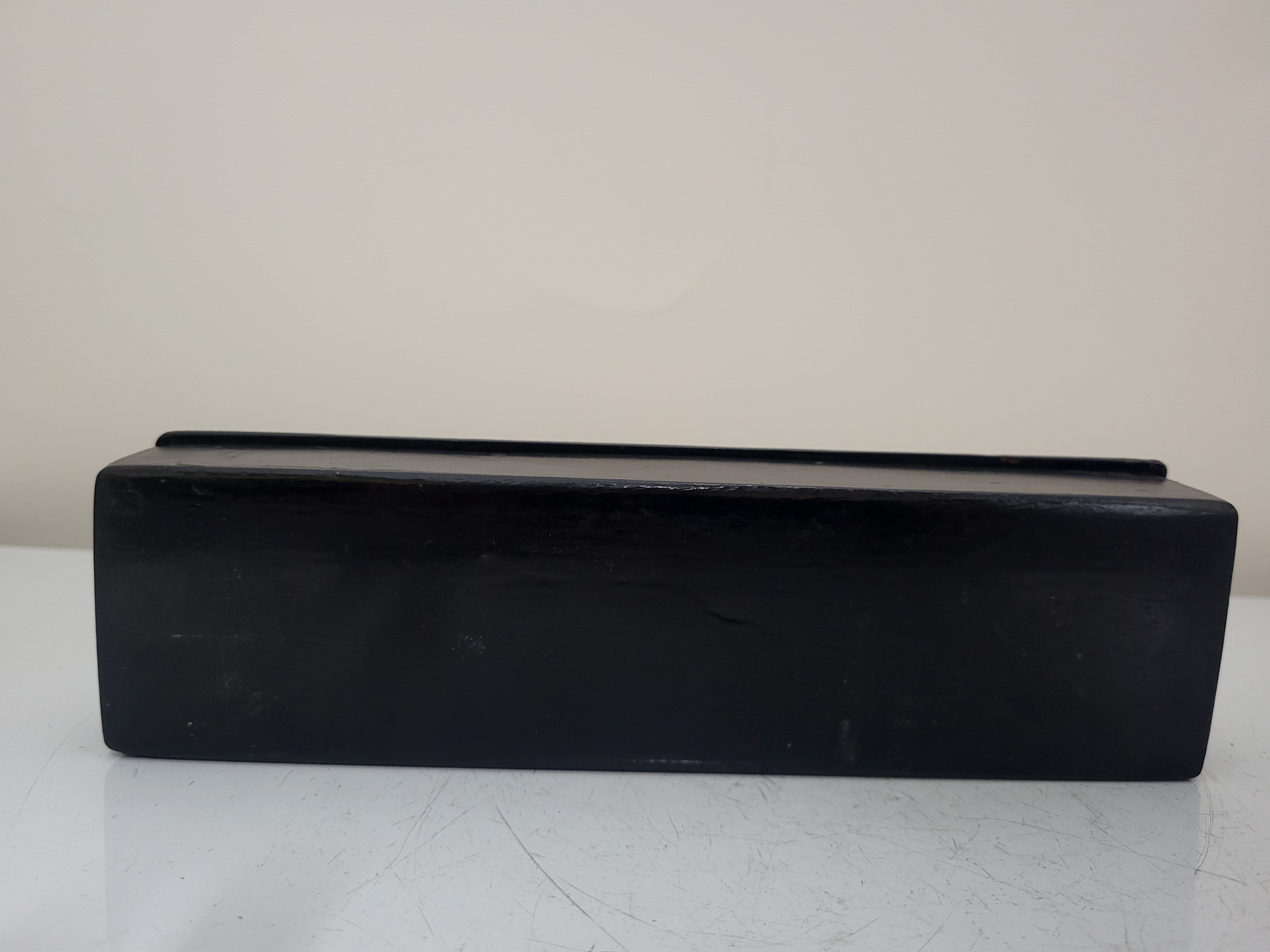 Beautiful antique Chinese calligraphy box. Black lacquered wood with elaborate gilt figural design. Hinged lid opens to 3 compartments for pencils and writing materials. Could be used for small trinkets or jewelry. Elongated box measures 7 3/4" x 2" x 1" tall. Excellent condition.