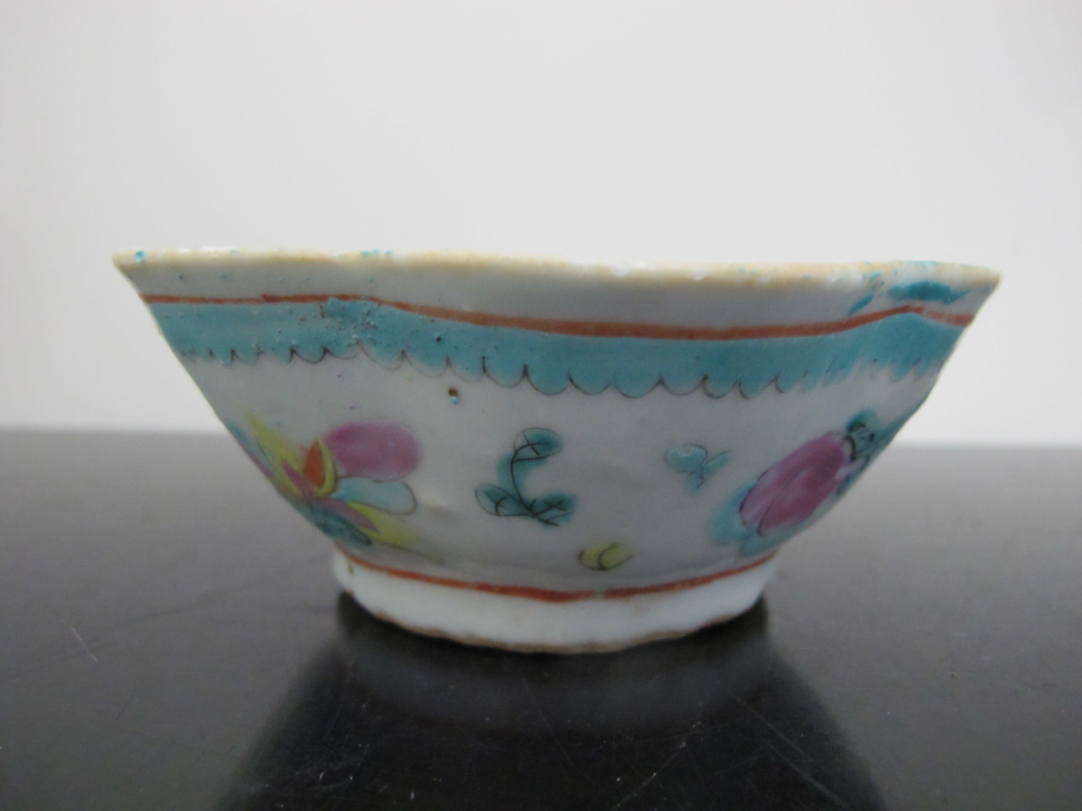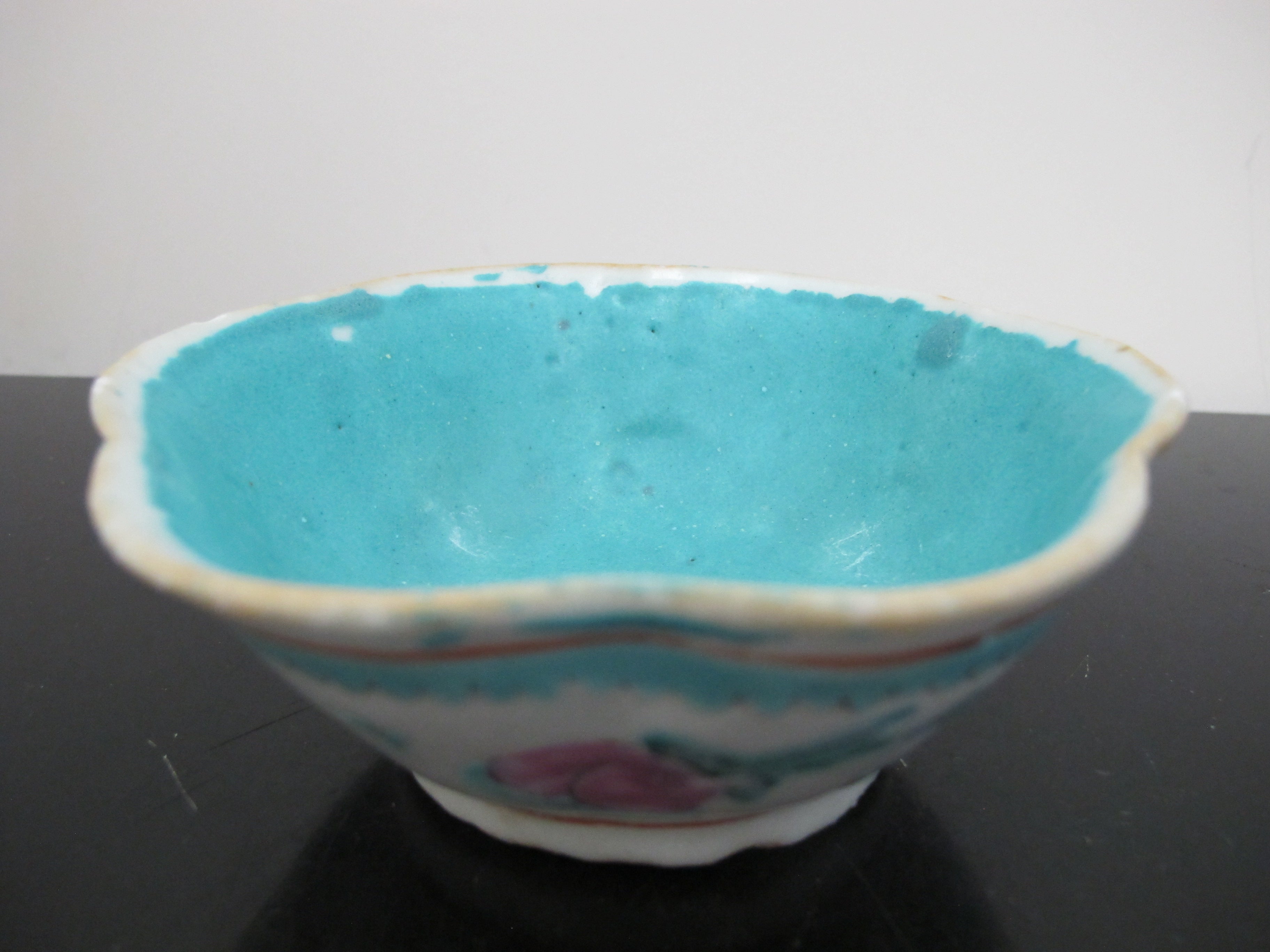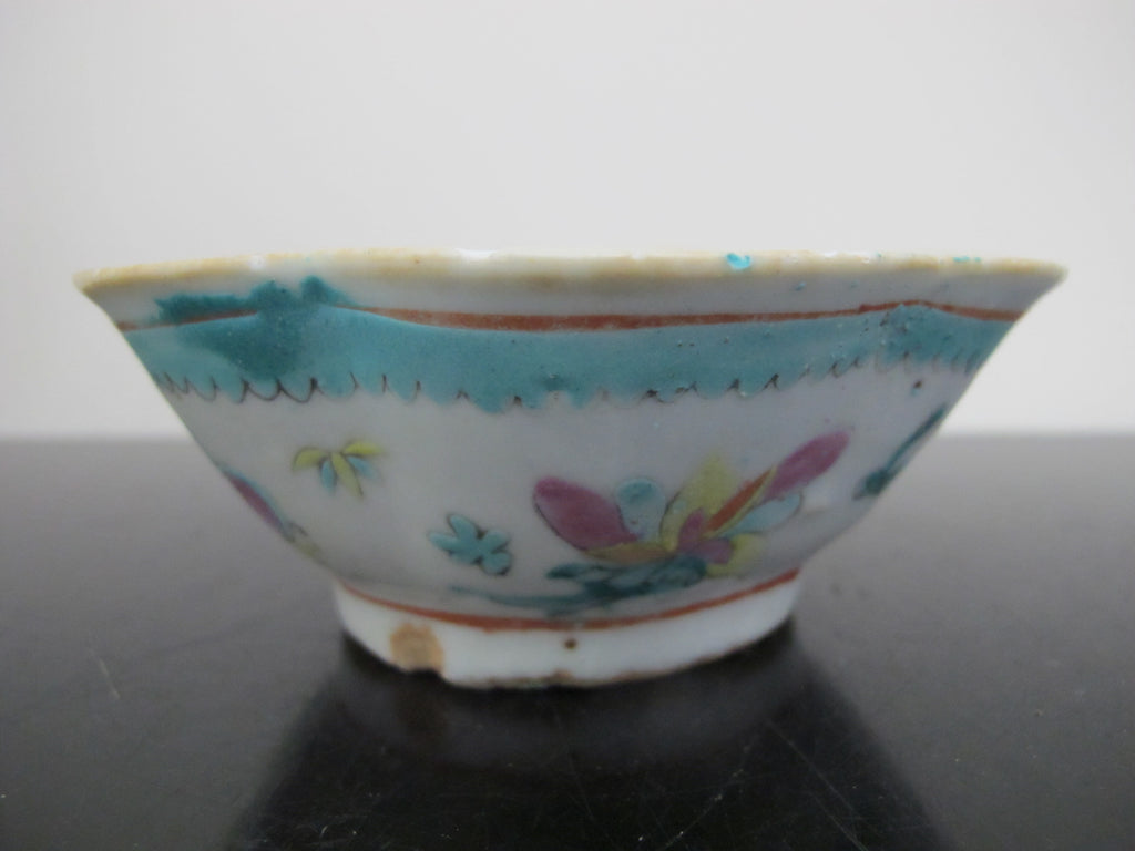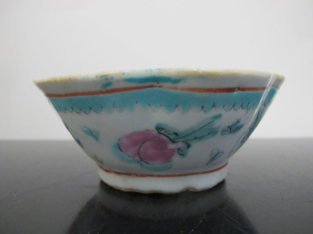 Precious antique Chinese Nonya or Nyona porcelain rice bowl with scalloped hexagonal rim. White backdrop showing a whimsical fruit, flower, and butterfly design design. Inner bowl is a bright turquoise blue. Measures 5" wide x 2" tall. Excellent condition, showing typical wear for old age. Light wear to glaze and a couple fleabite chips at rim and chip at base edge, no major chips, cracks, or repairs. Stamp mark at base.