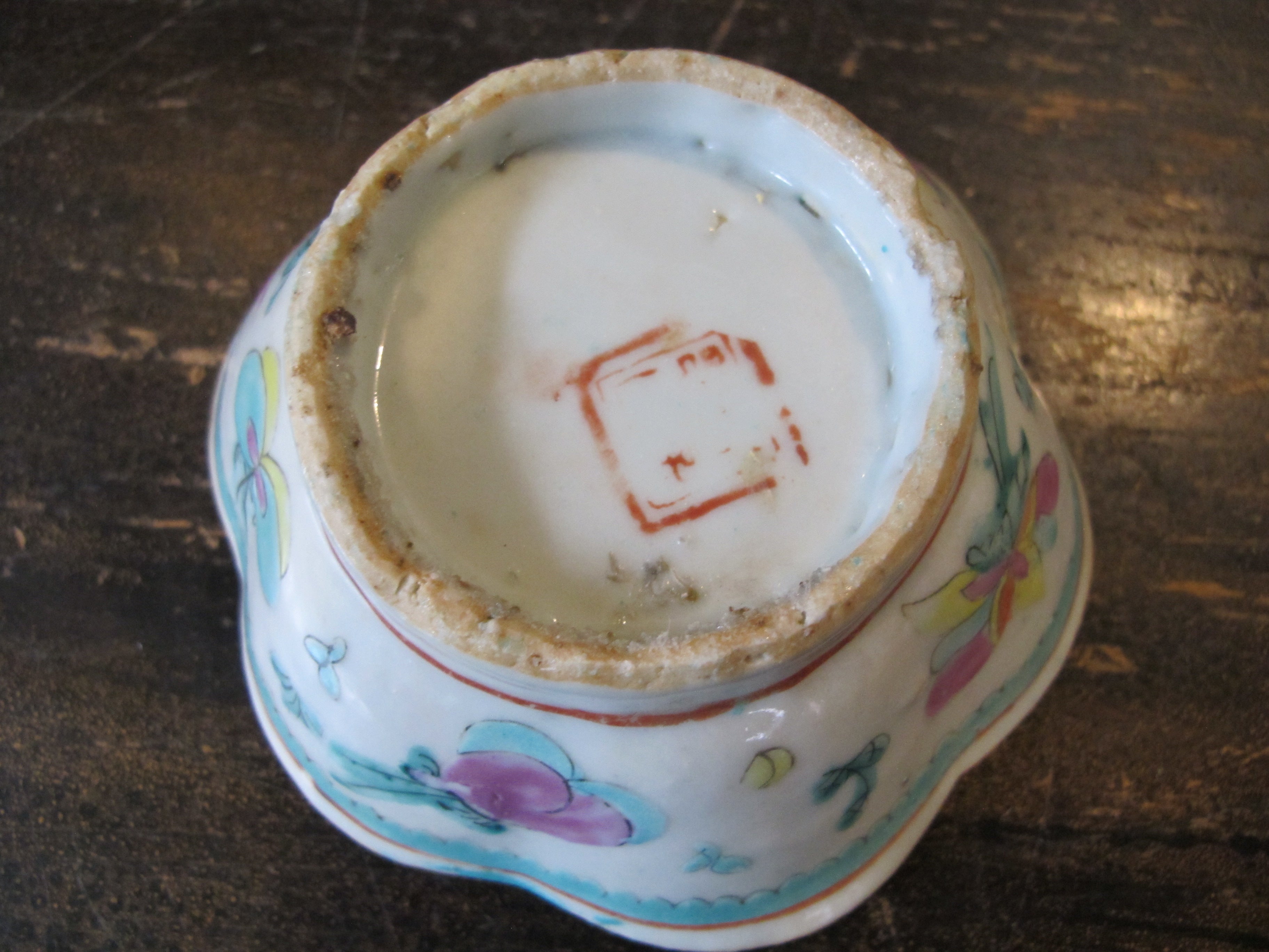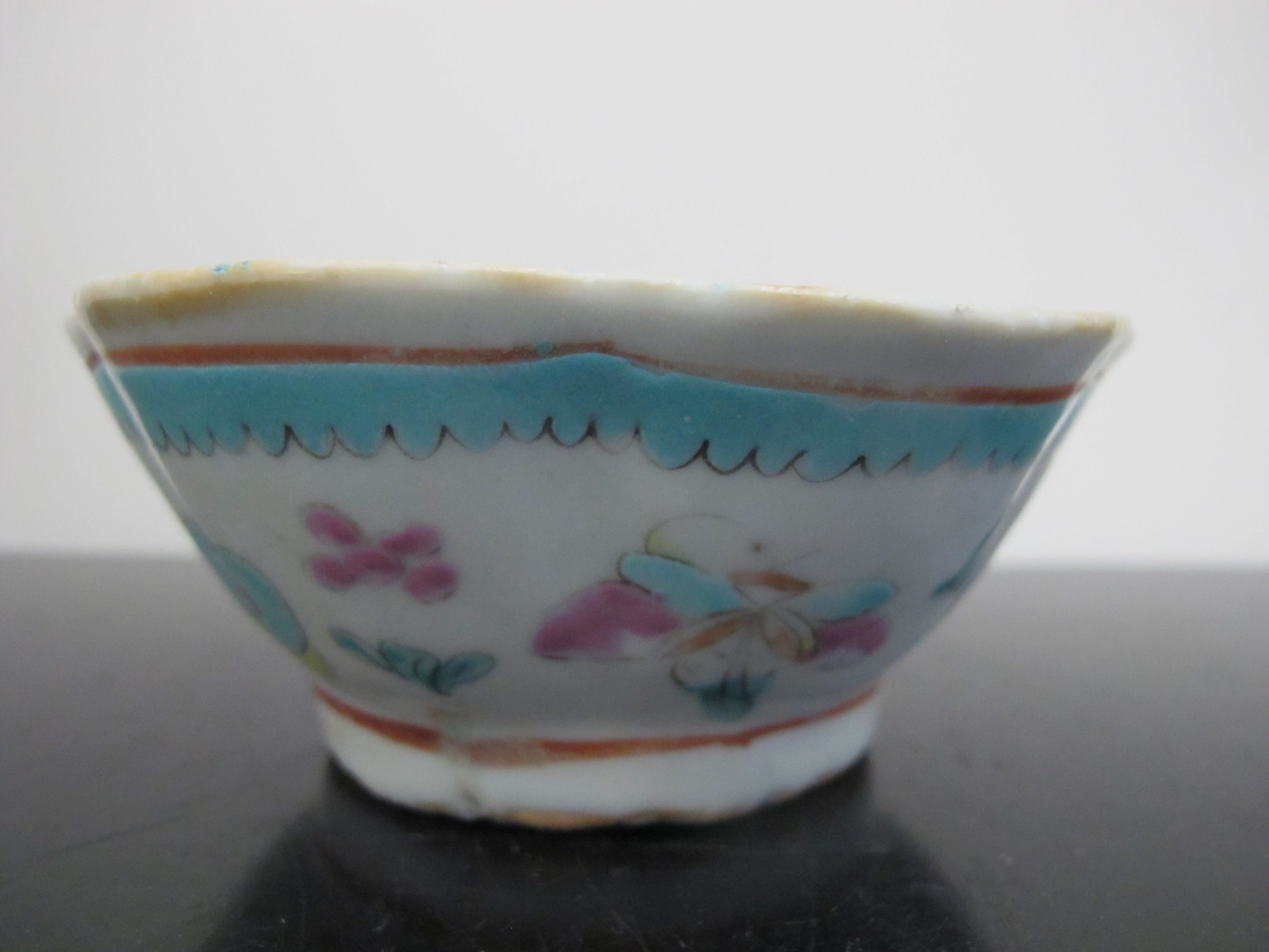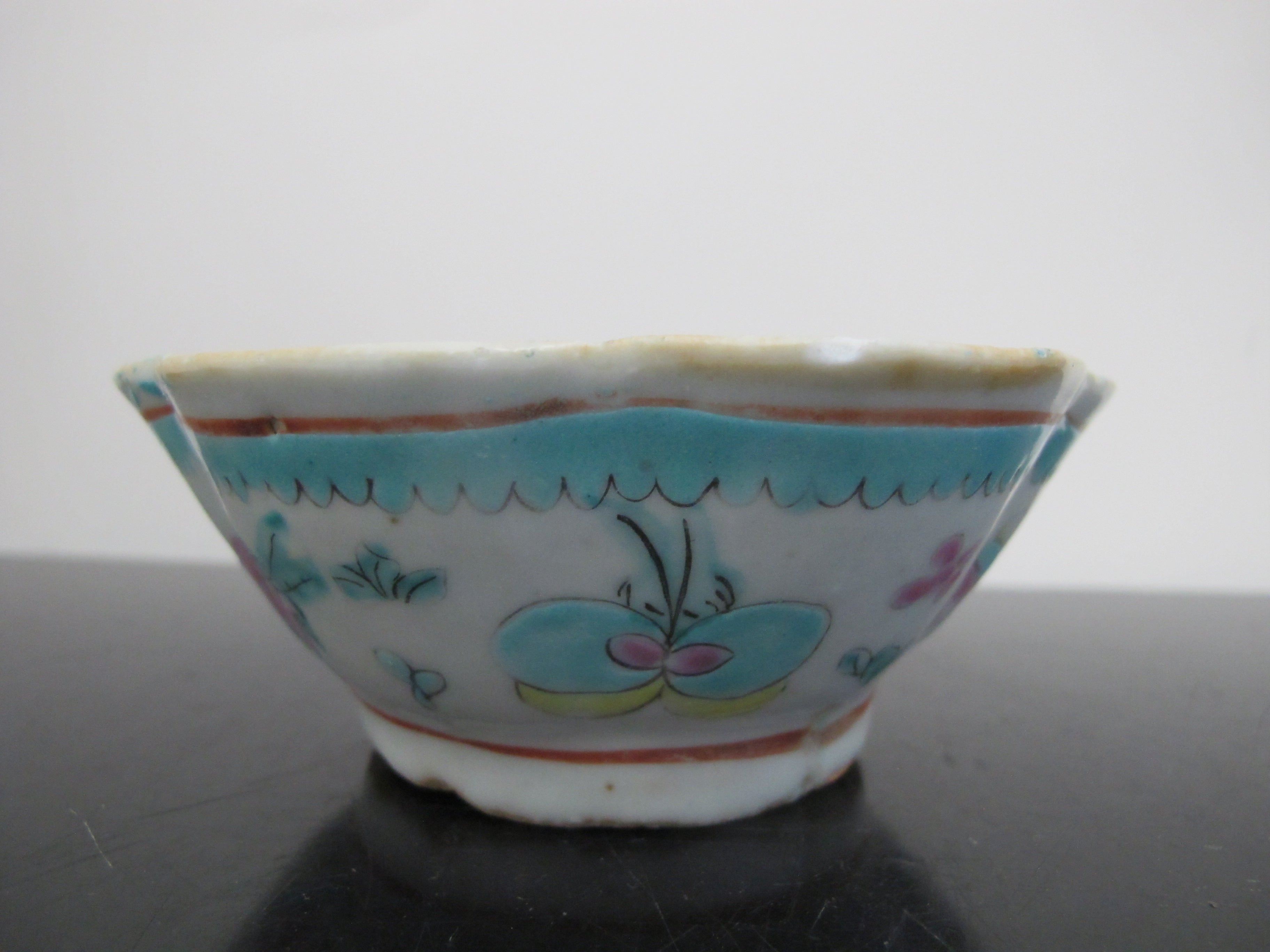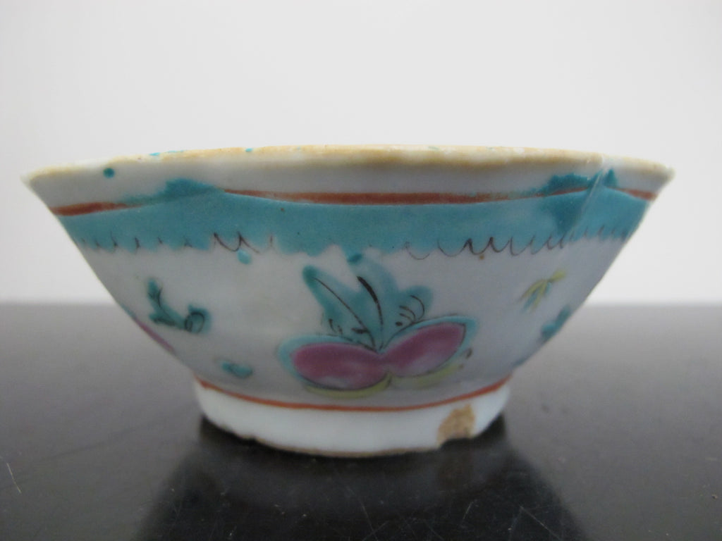 Precious antique Chinese Nonya or Nyona porcelain rice bowl with scalloped hexagonal rim. White backdrop showing a whimsical fruit, flower, and butterfly design design. Inner bowl is a bright turquoise blue. Measures 5" wide x 2" tall. Excellent condition, showing typical wear for old age. Light wear to glaze and a couple fleabite chips at rim and chip at base edge, no major chips, cracks, or repairs. Stamp mark at base.
