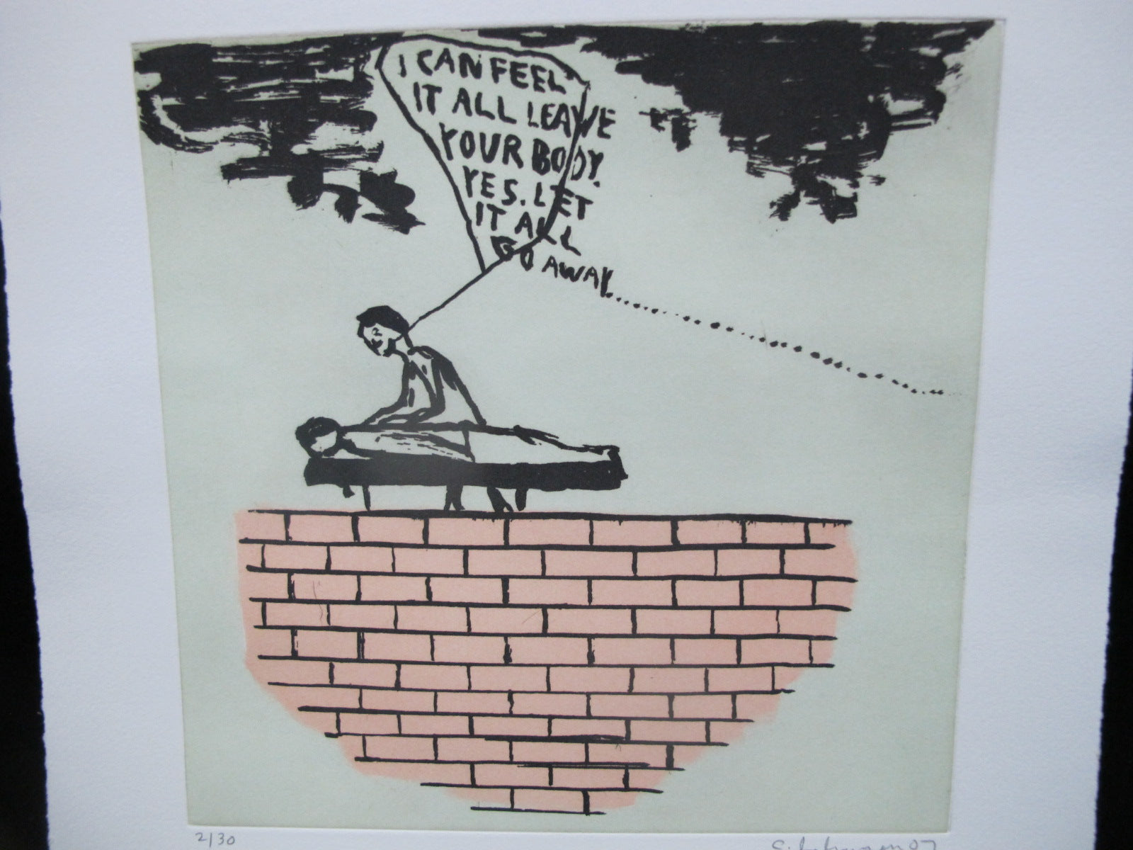 Chris Johanson (1968, California) aquatint etching on thick Somerset white paper, "Perceptions #6", "I Can Feel It All Leave Your Body. Yes. Let It All Go Away......"