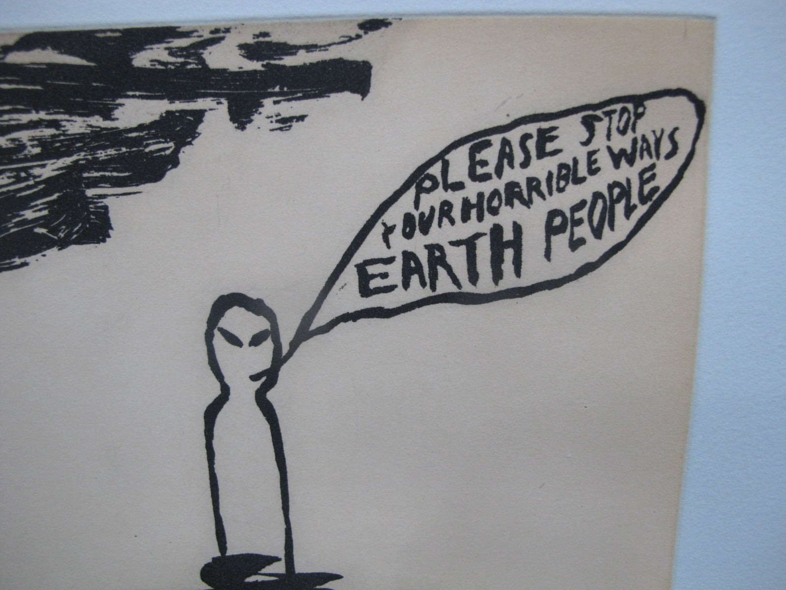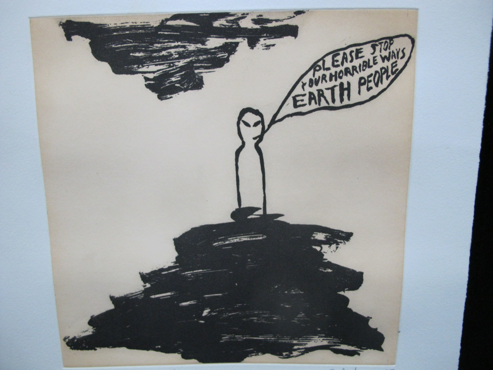 Chris Johanson (1968, California) aquatint etching on thick Somerset white paper, "Perceptions #5", "Please Stop Your Horrible Ways Earth People".