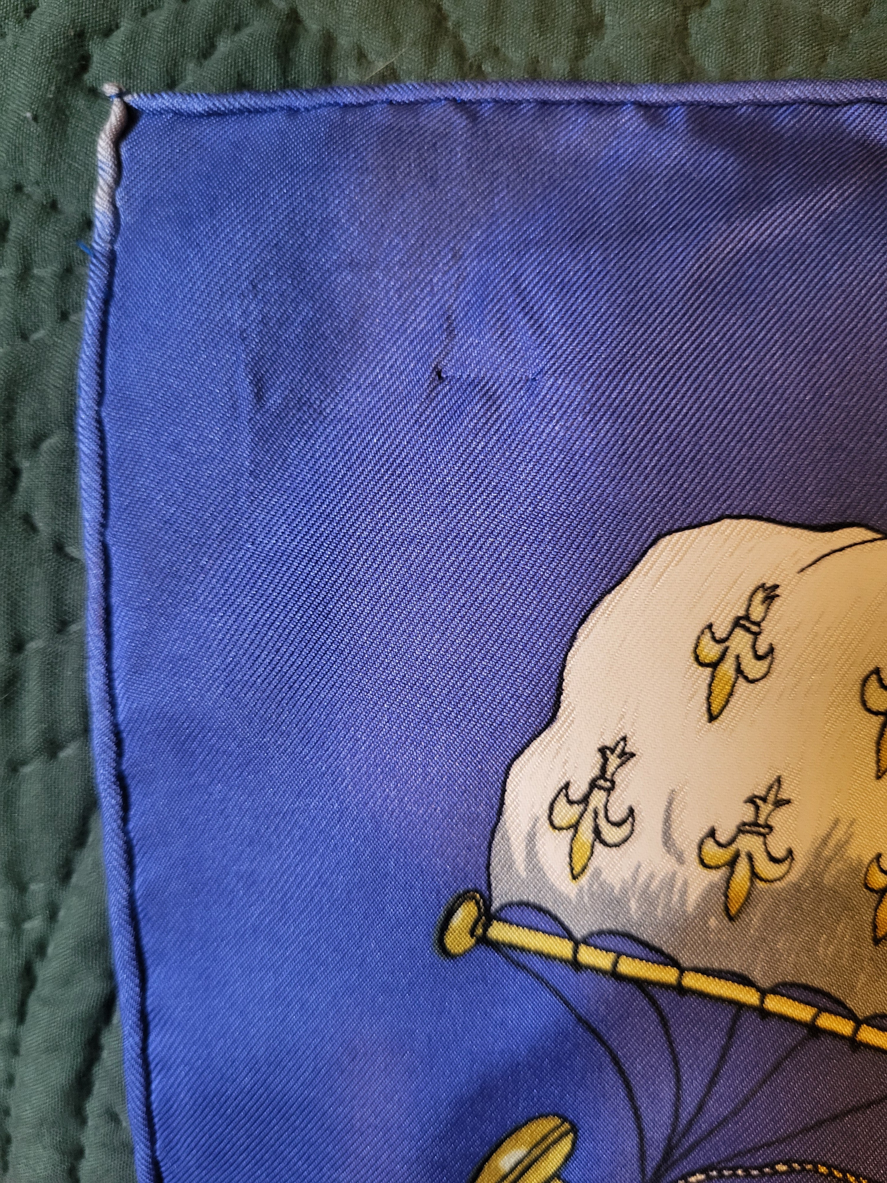 Excellent preowned condition. Shows creases, lightly wrinkled from storage. Discoloration and minor snag at one corner, as photographed. No other stains, snags, or tears.