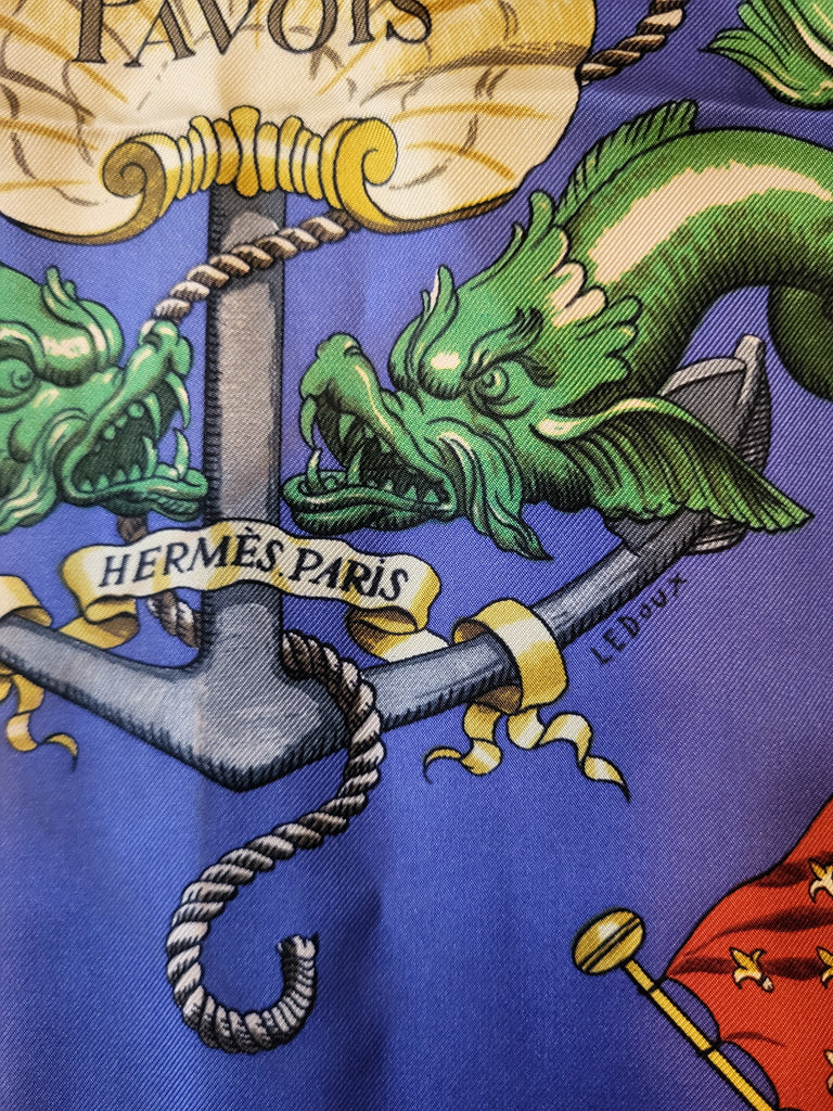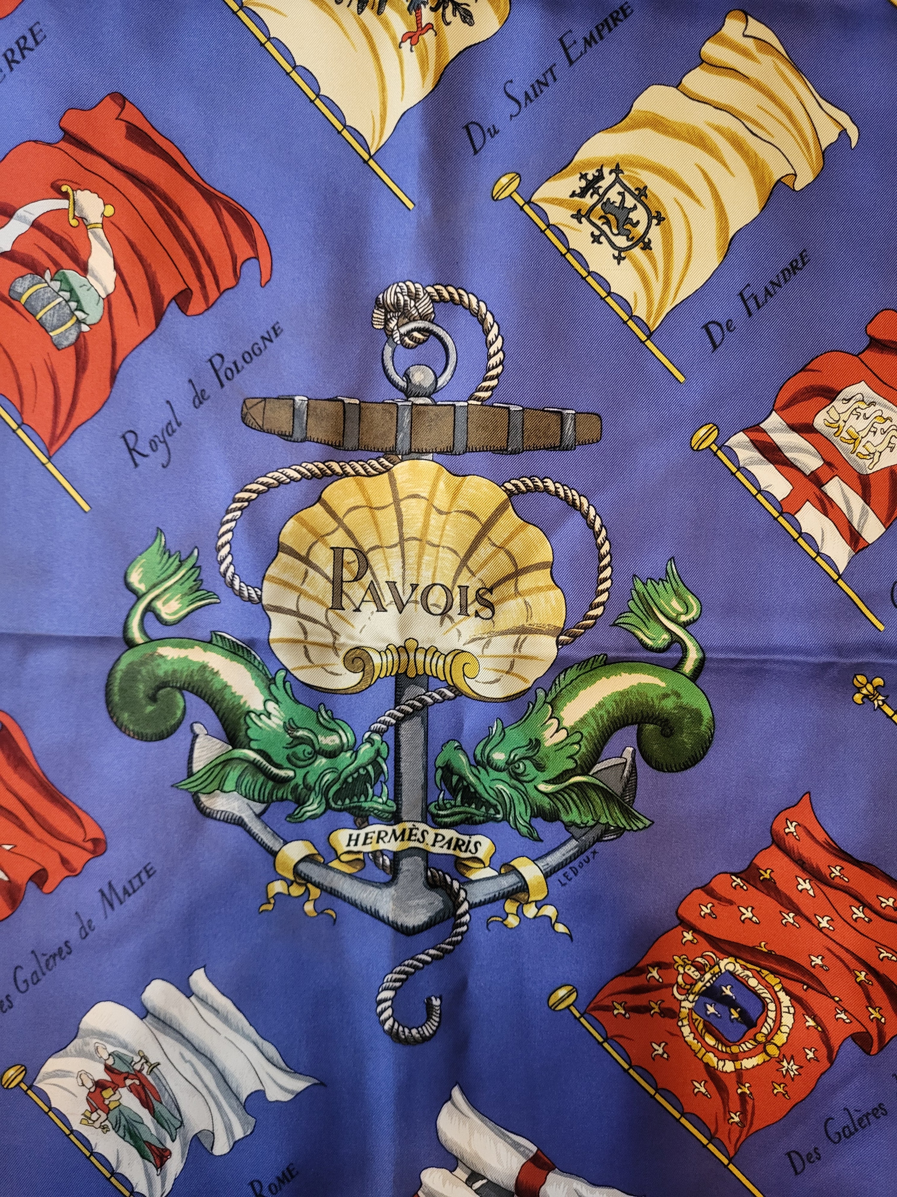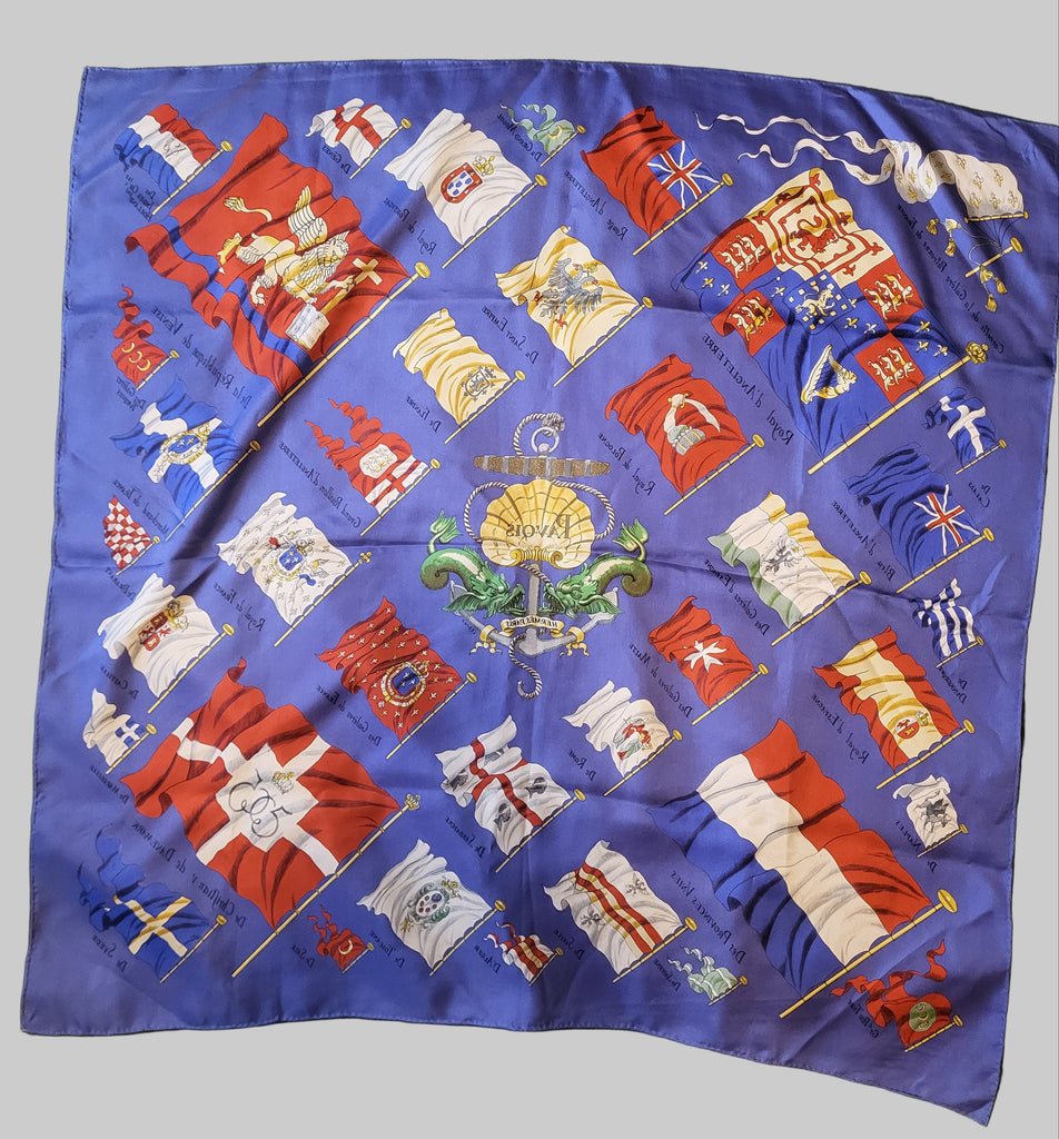 Vintage Hermes France Carre 90 graphic, 'Pavoi' designer scarf. Designed by Philippe LeDoux in the 1960's, showing a bright blue background with central baroque naval anchor motif surrounded by numerous historic and royal nautical flags from medieval European kingdoms.