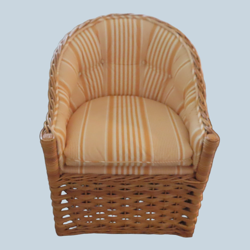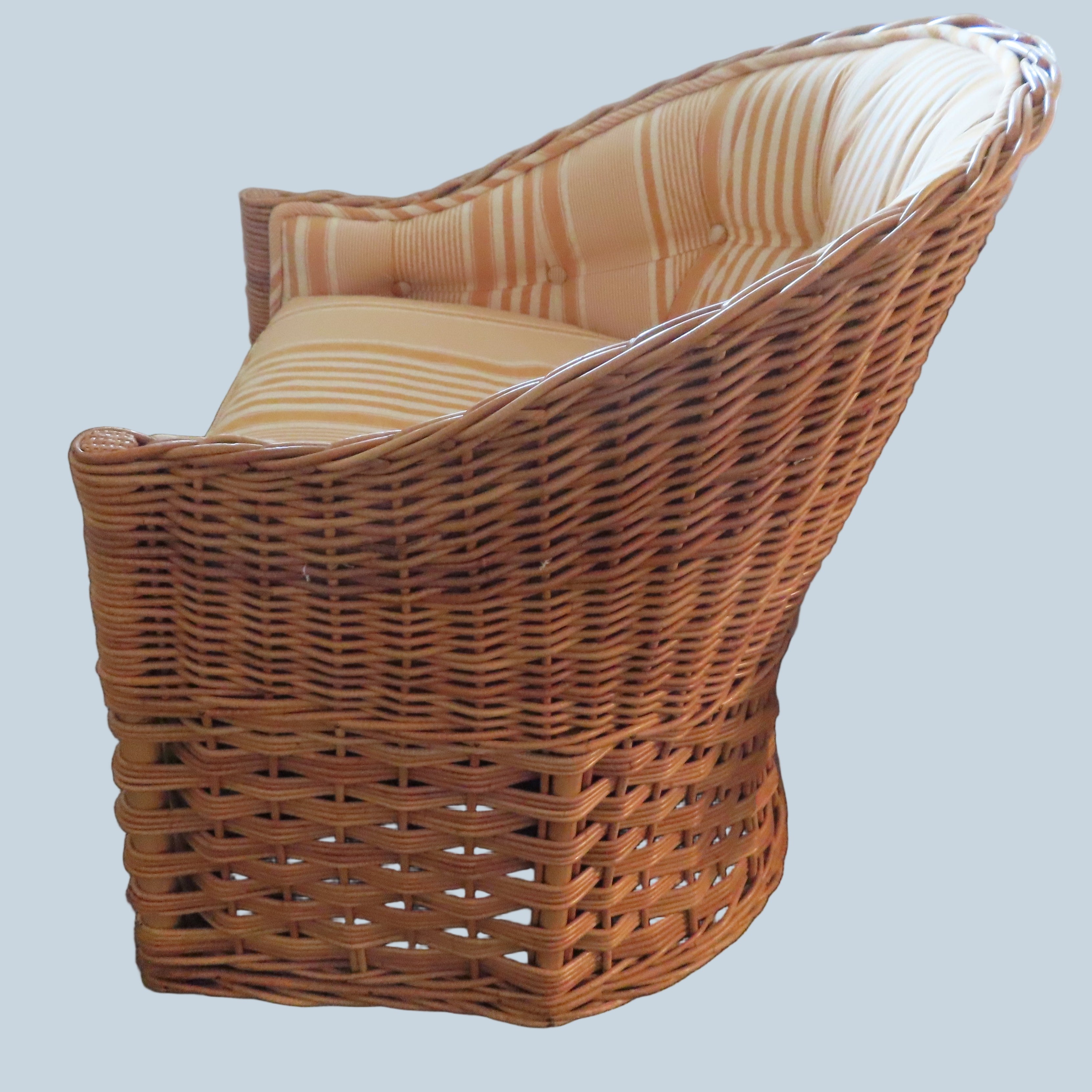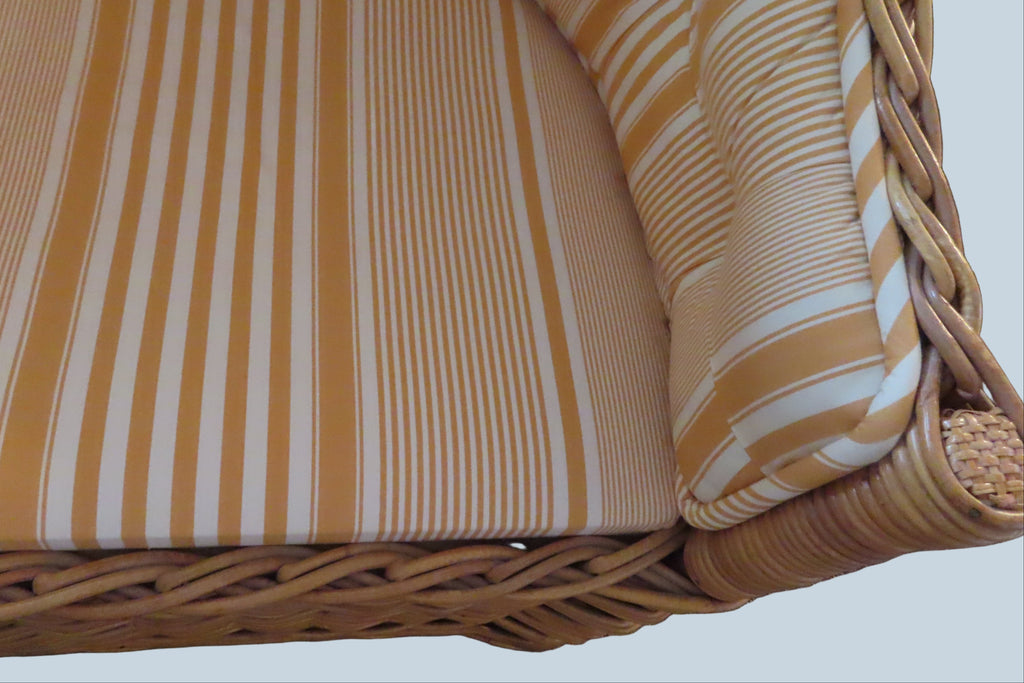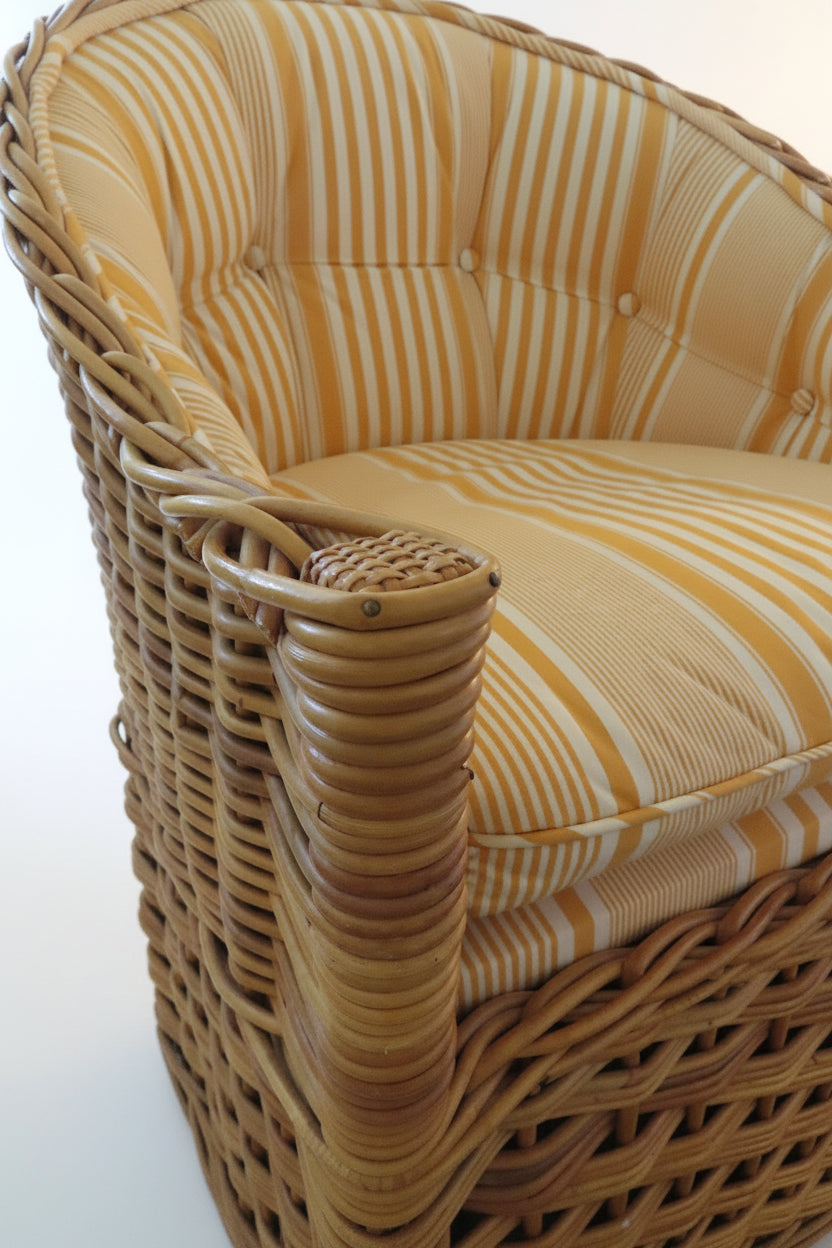 Super cute pair of wicker arm chairs with yellow and white stripped upholstery. The seat cushions are removeable. Classic club chair shape and style with a very cute color combination! These make for an excellent outdoor pop of color on any patio.