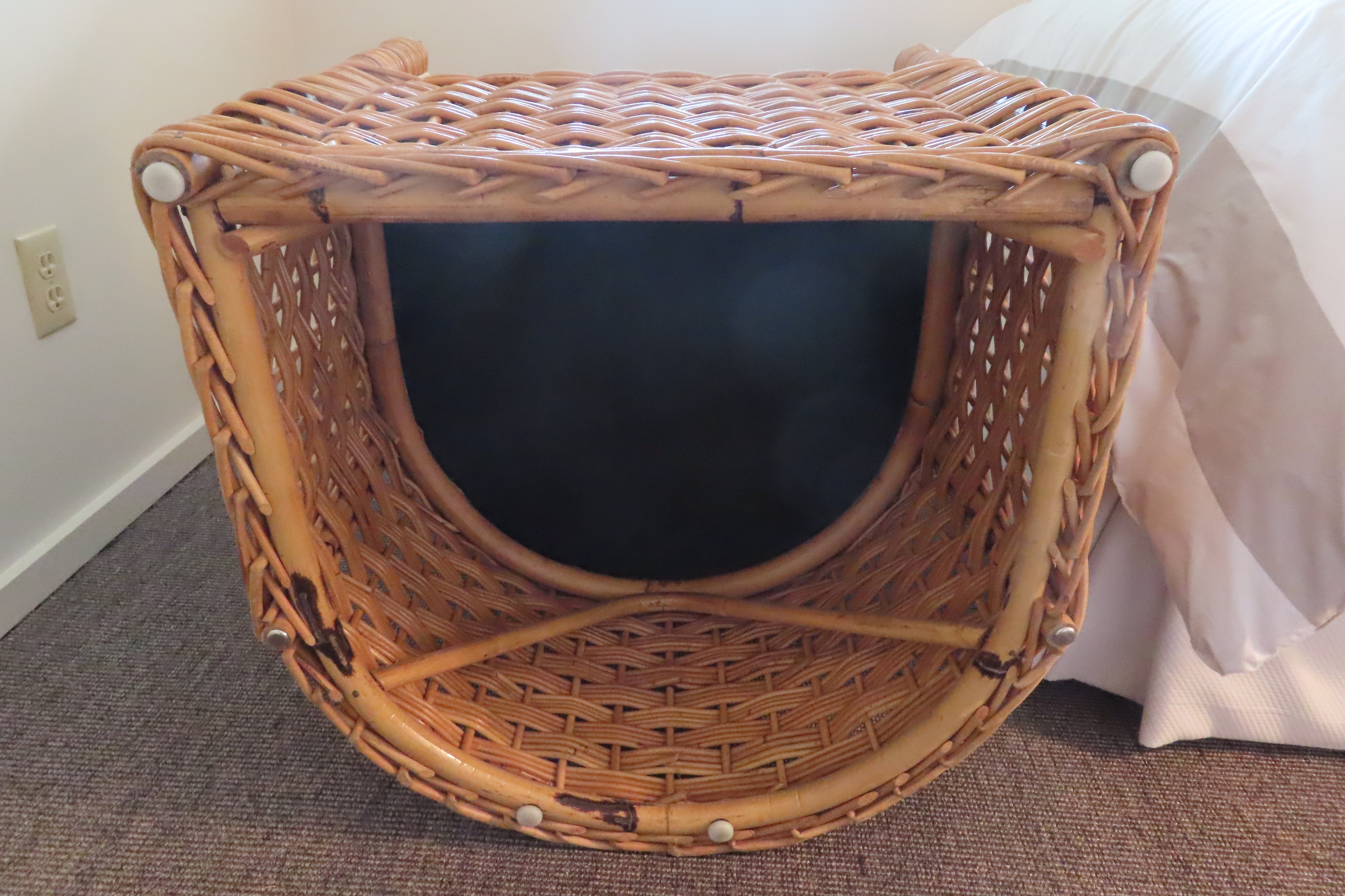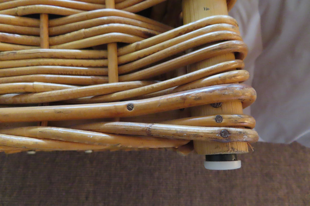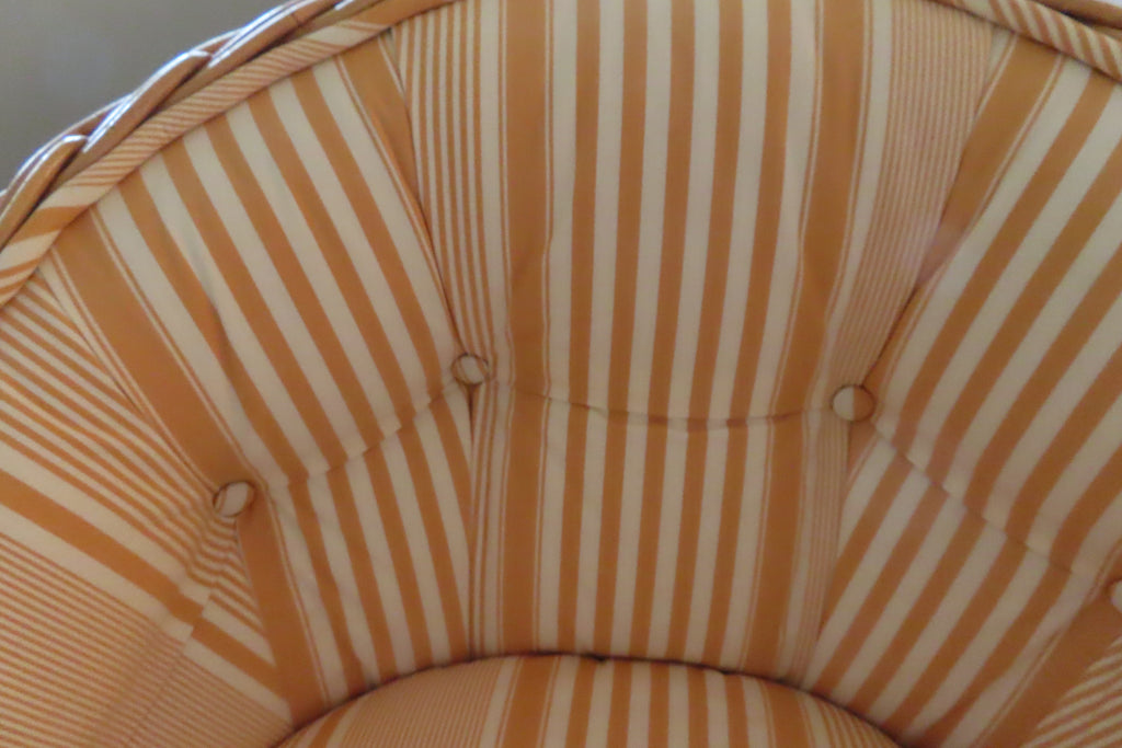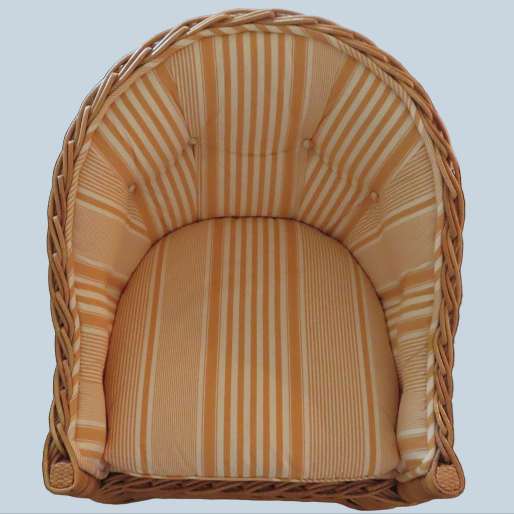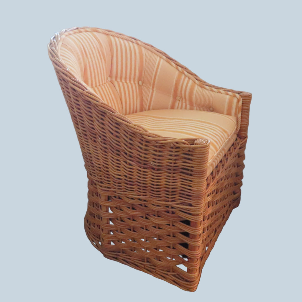 Super cute pair of wicker arm chairs with yellow and white stripped upholstery. The seat cushions are removeable. Classic club chair shape and style with a very cute color combination! These make for an excellent outdoor pop of color on any patio.