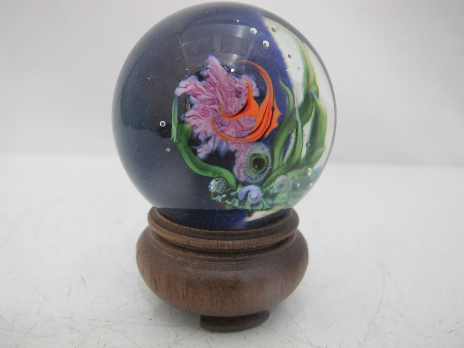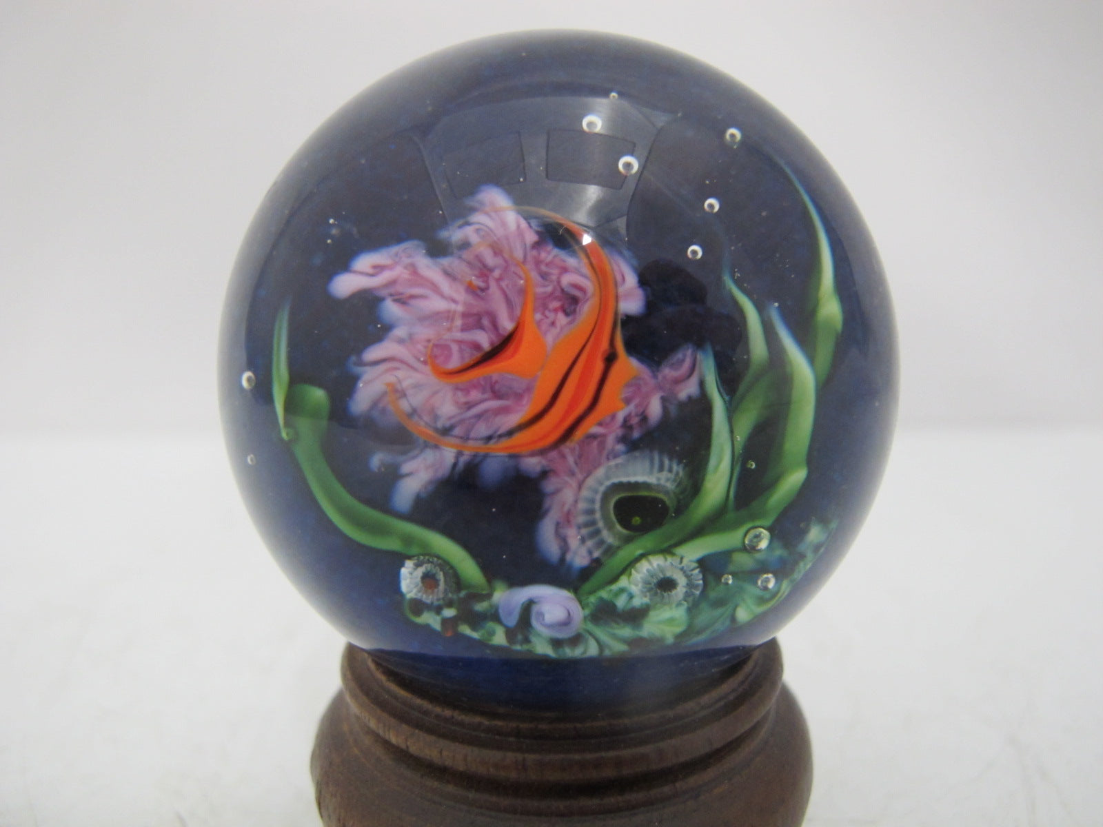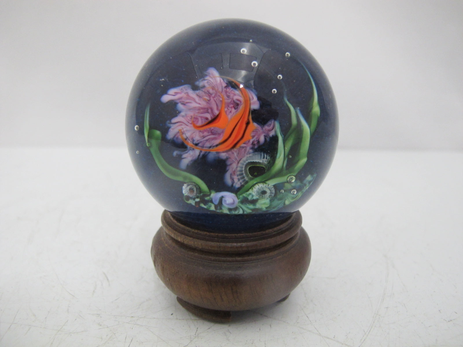 David P. Salazar fish marble or paperweight on wood stand. Really cool 3d effect showing an angelfish swimming. Hallmarks at base. Excellent condition.