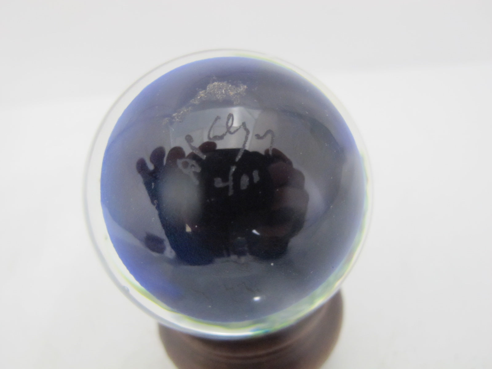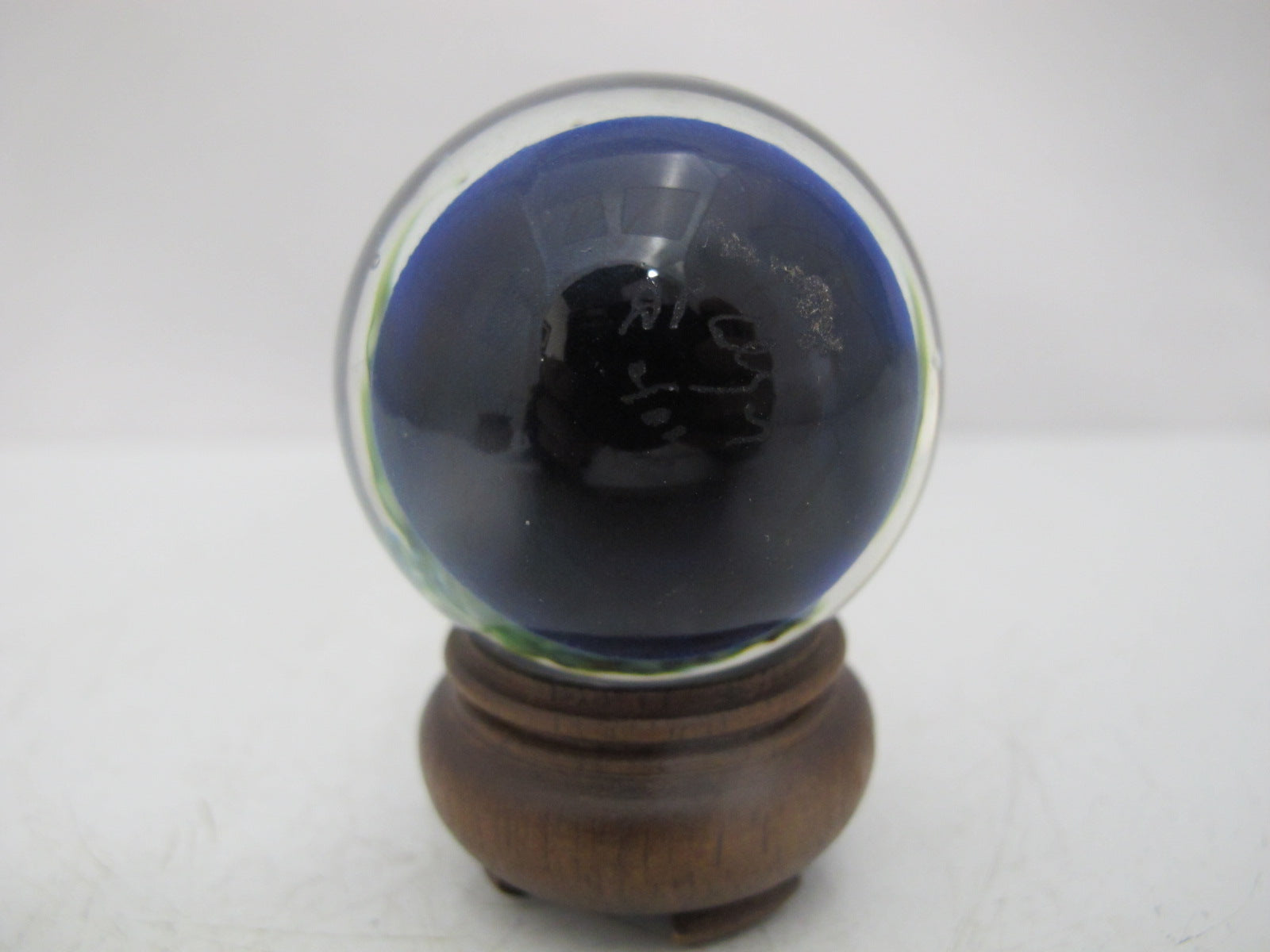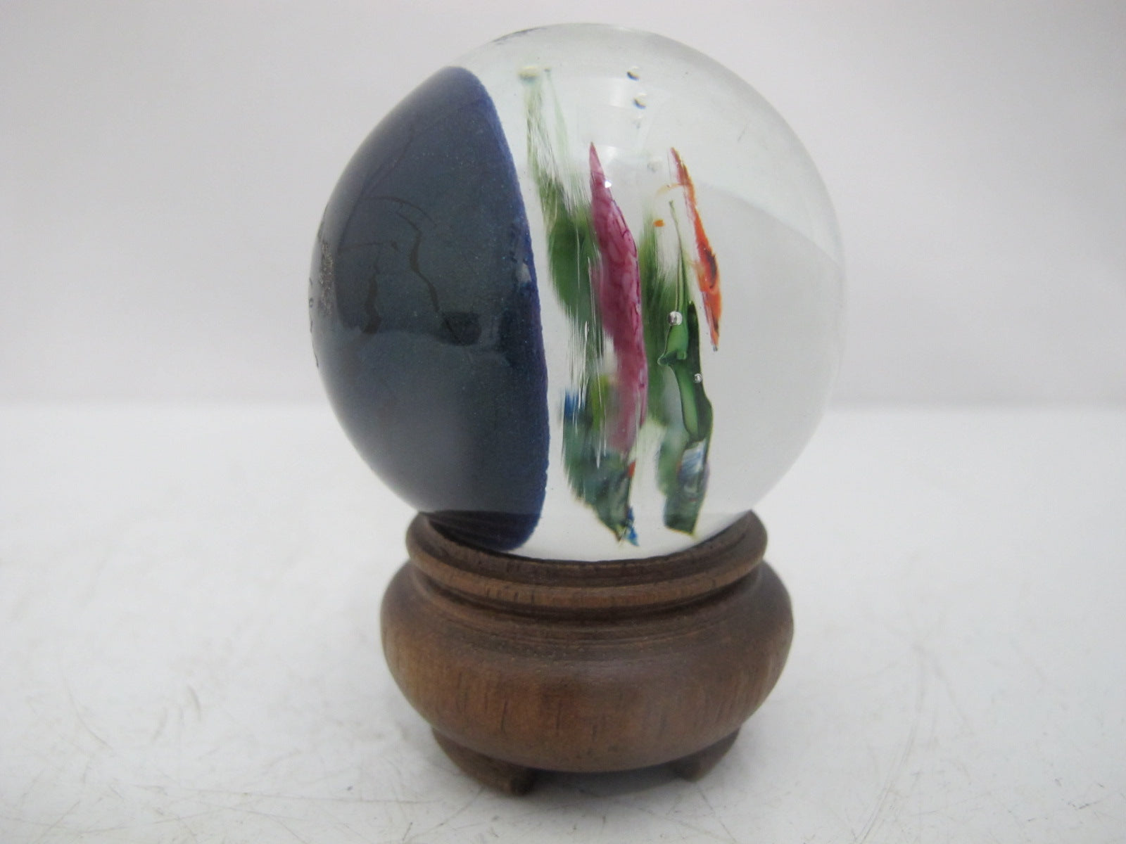 David P. Salazar fish marble or paperweight on wood stand. Really cool 3d effect showing an angelfish swimming. Hallmarks at base. Excellent condition.