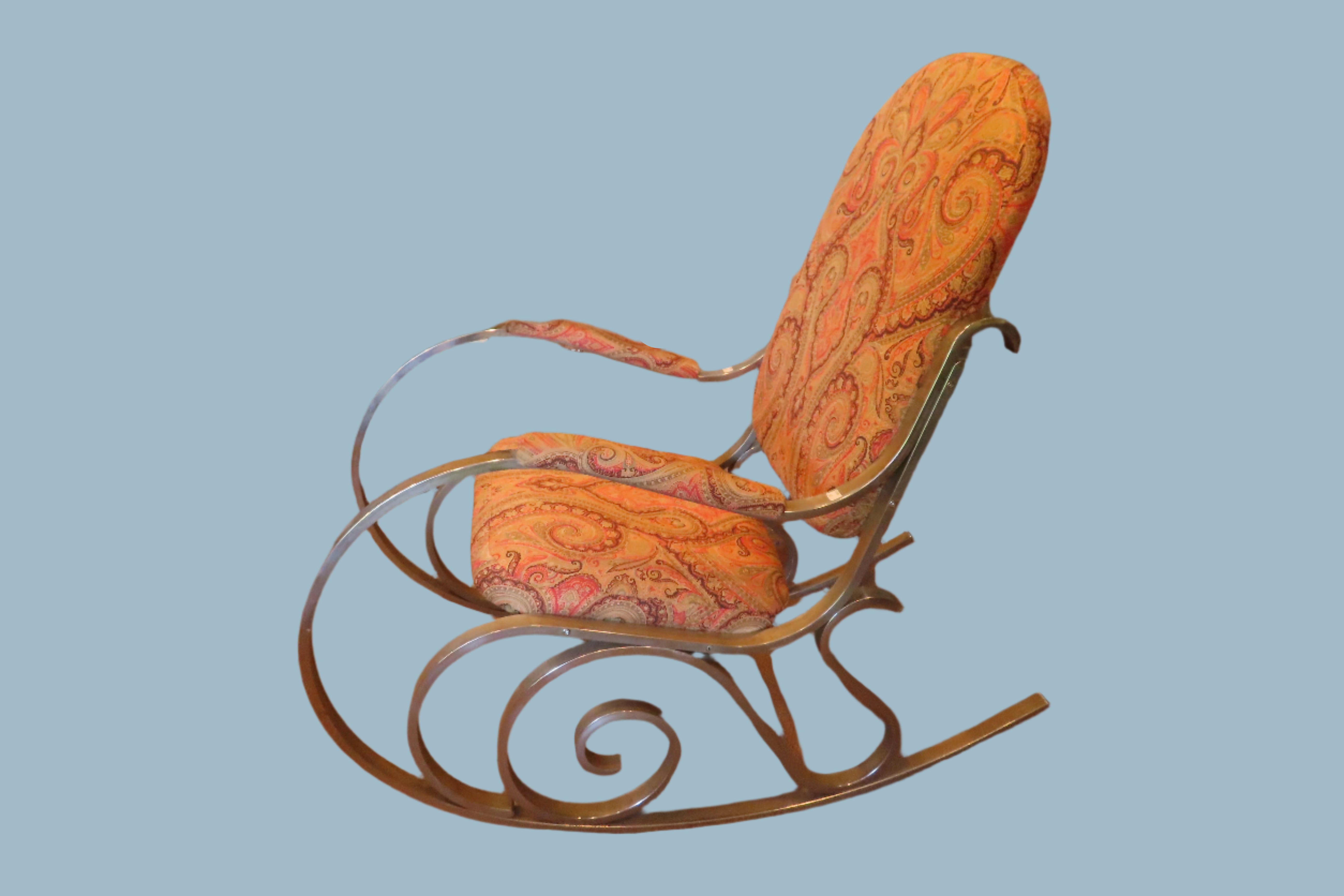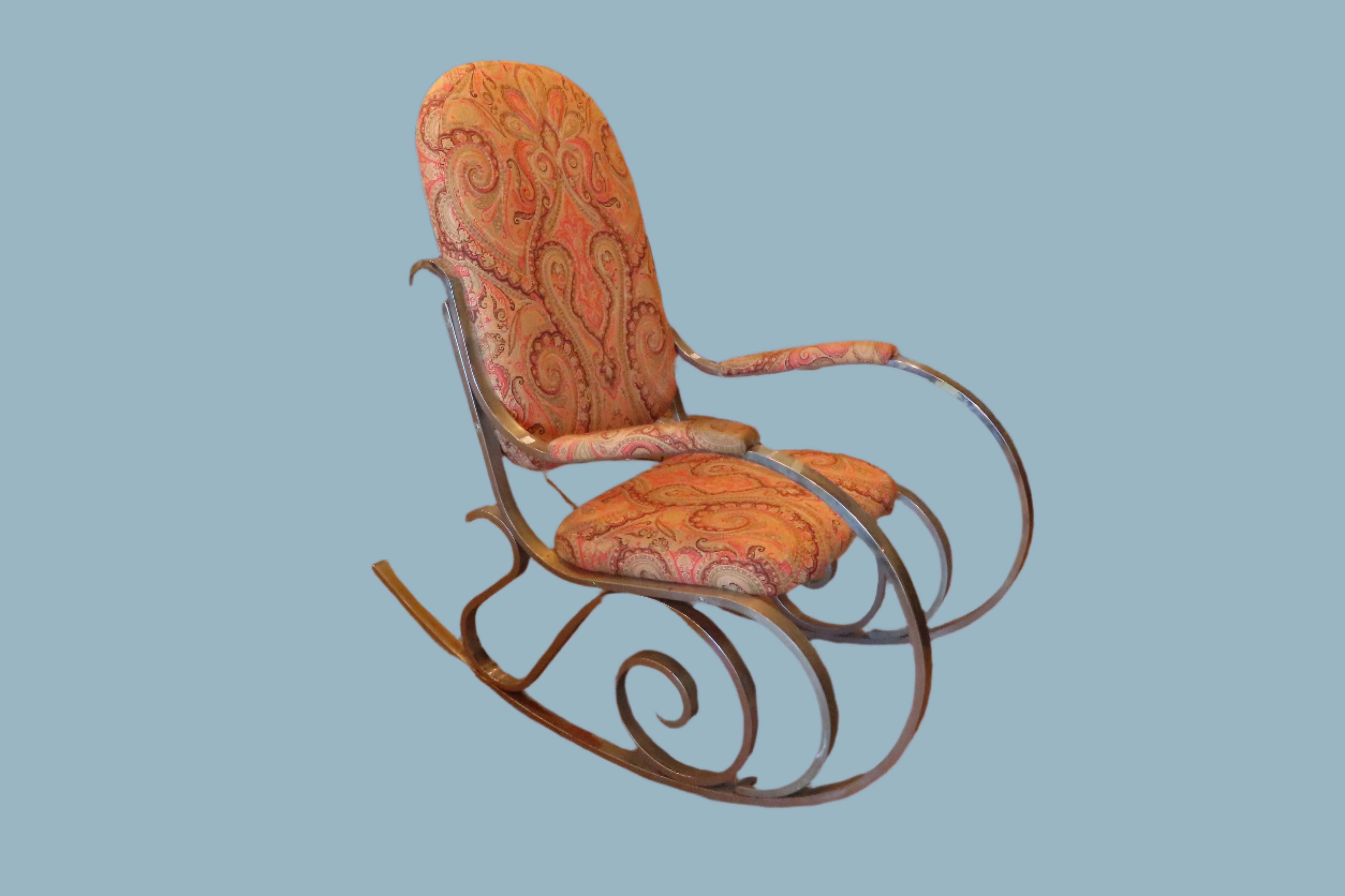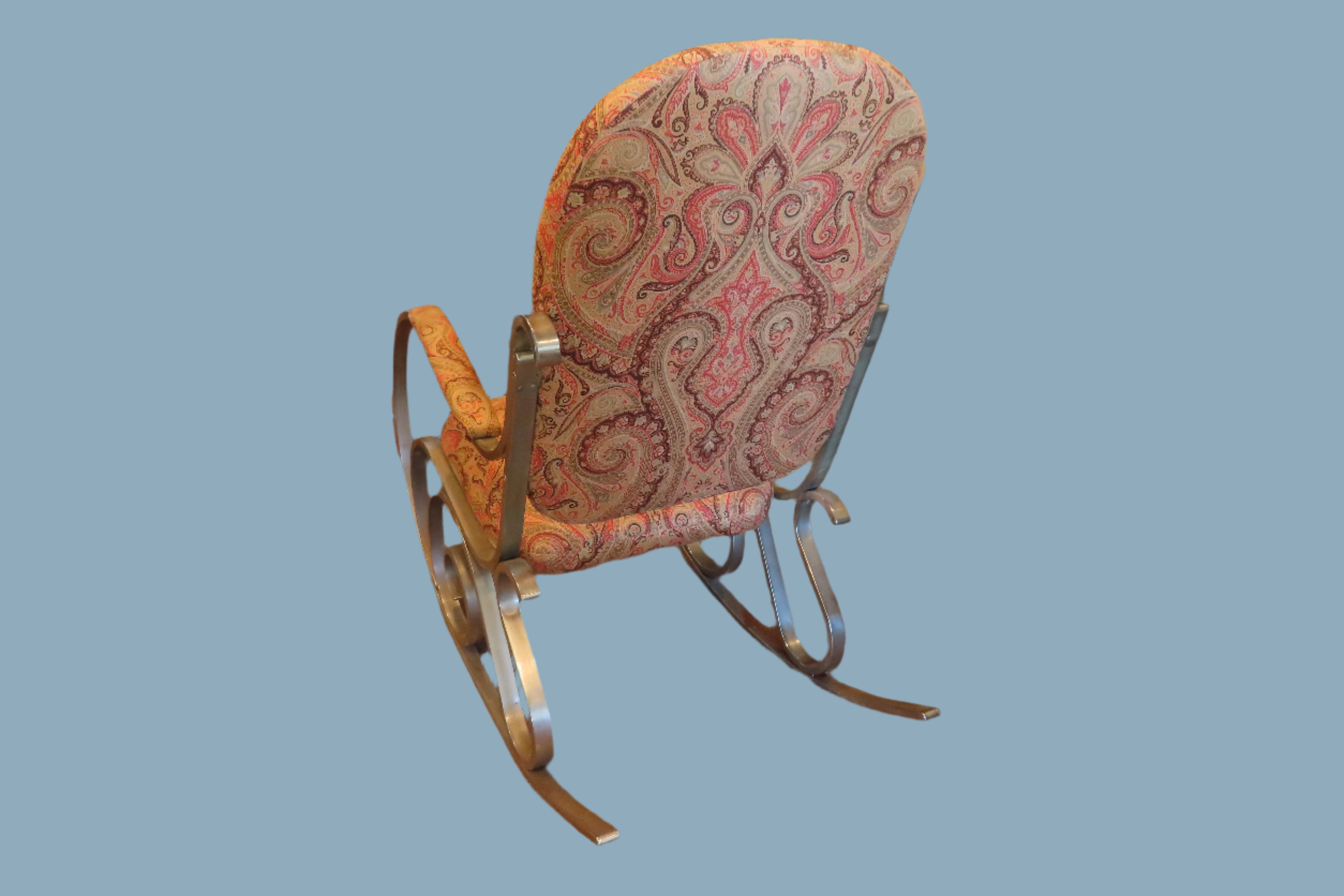 This iconic mid century modern chrome rocking chair was designed by Maison Jansen. It has been re upholstered with a earthy red, brown and green paisley design. The chrome frame makes a fantastical spiral design on the sides of the rocking chair. A completely unique and timeless stamp of the MCM movement.