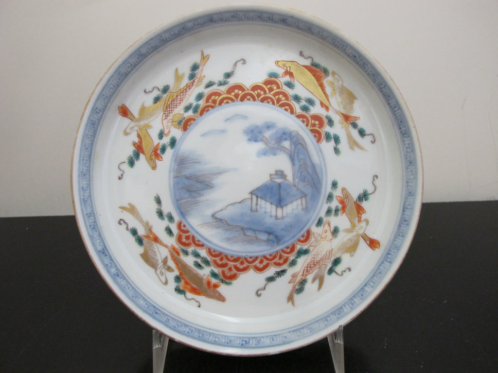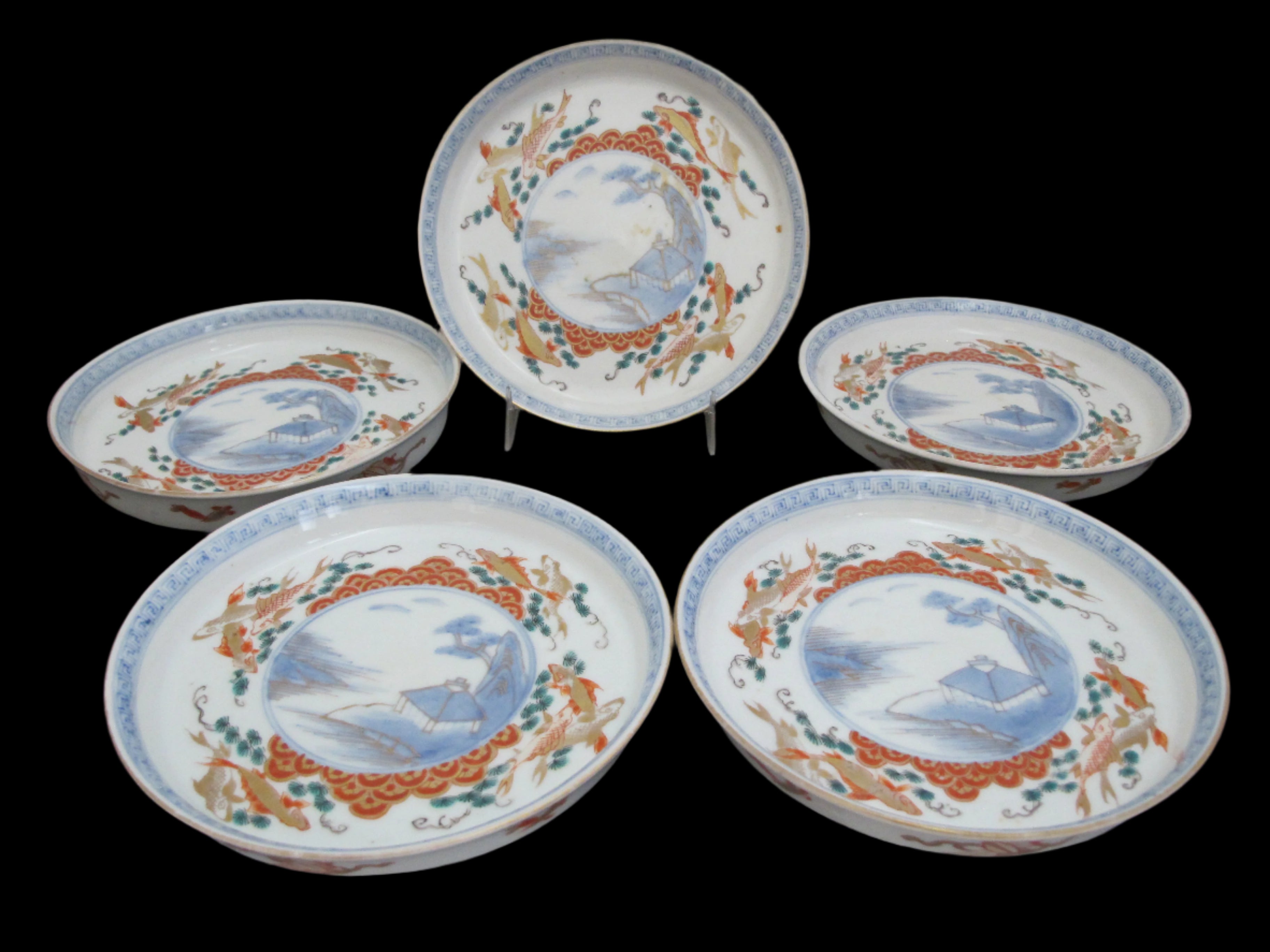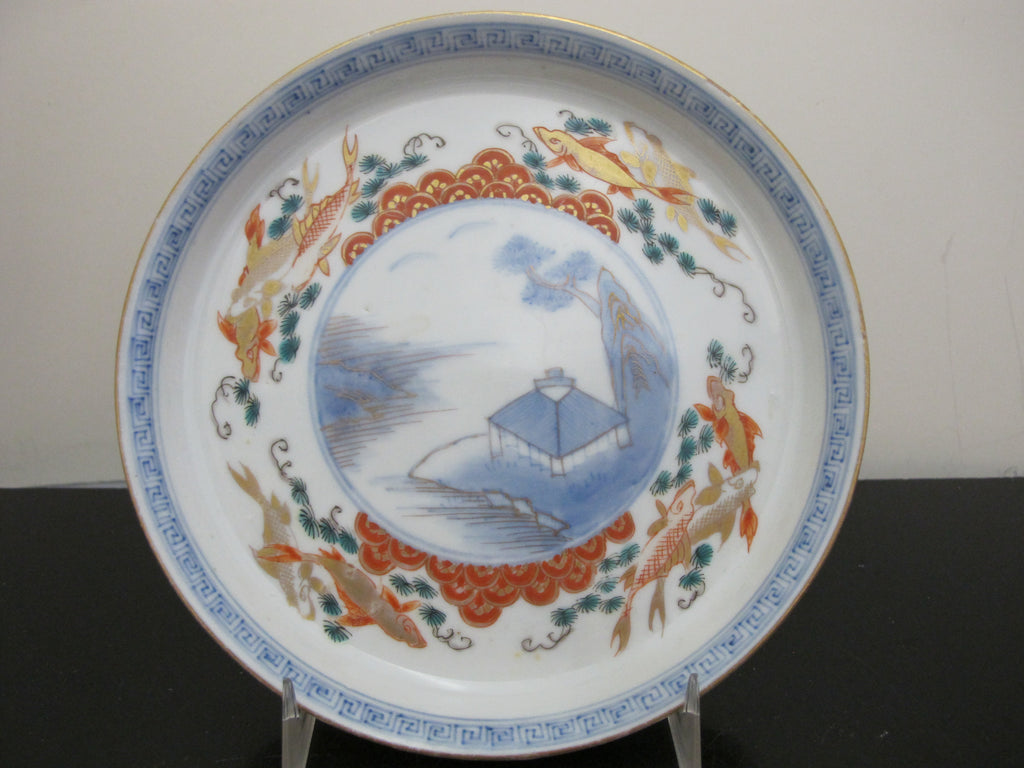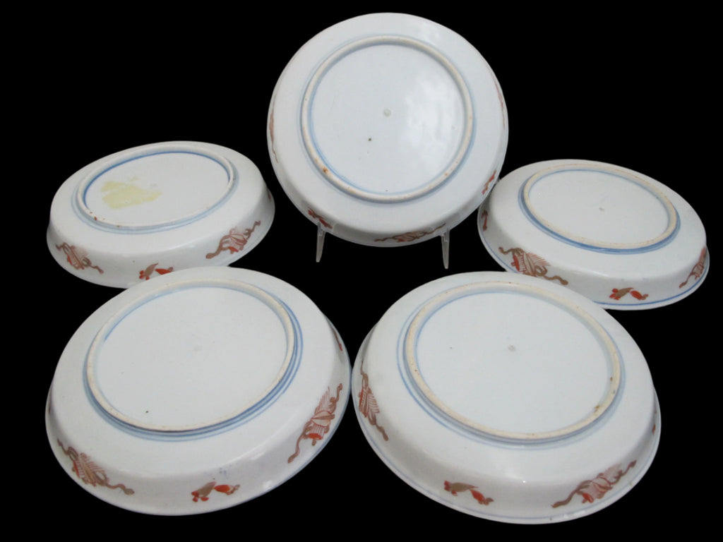 Unique and very sweet Japanese porcelain Arita/Imari plate or shallow bowl set of 5. Hand painted in red, blue, and green with gilt accents. Centers showing a village mountain landscape scene outlined in geometrics and koi fish. Excellent condition, no chips, cracks, or repairs. Each measures 6 3/8" x 1" tall.