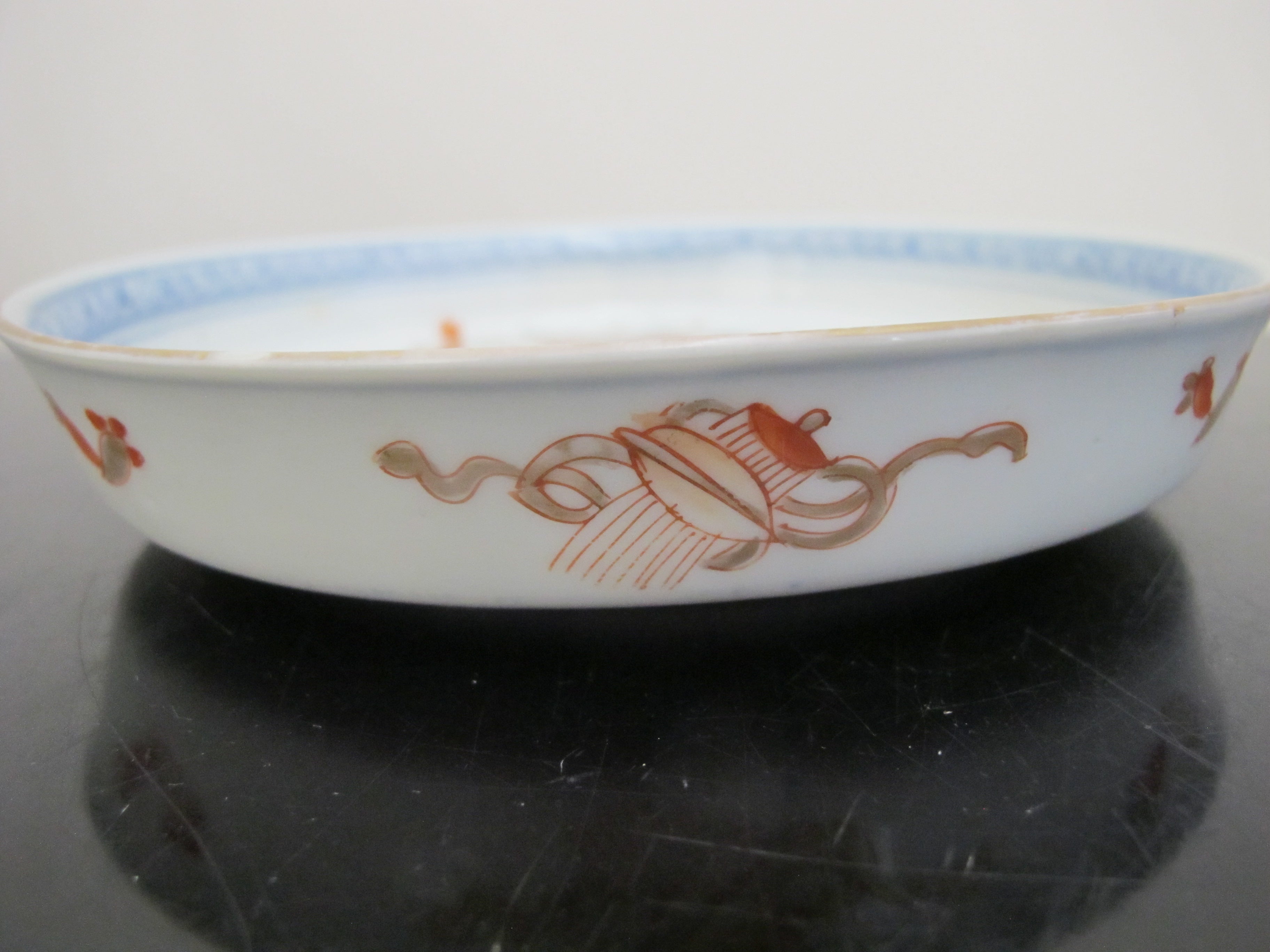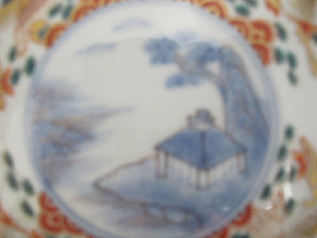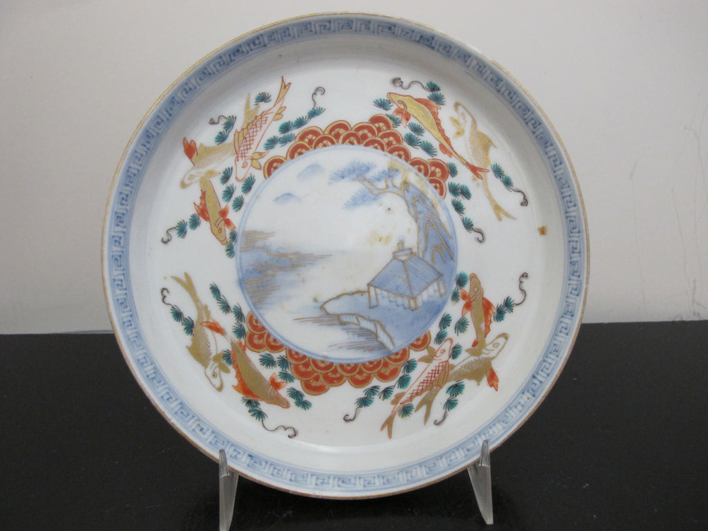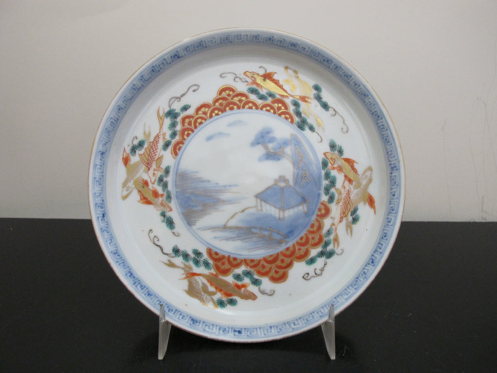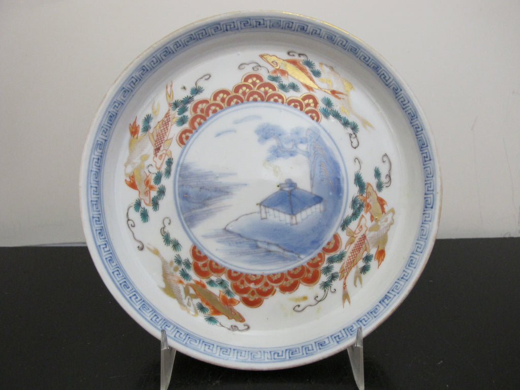 Unique and very sweet Japanese porcelain Arita/Imari plate or shallow bowl set of 5. Hand painted in red, blue, and green with gilt accents. Centers showing a village mountain landscape scene outlined in geometrics and koi fish. Excellent condition, no chips, cracks, or repairs. Each measures 6 3/8" x 1" tall.